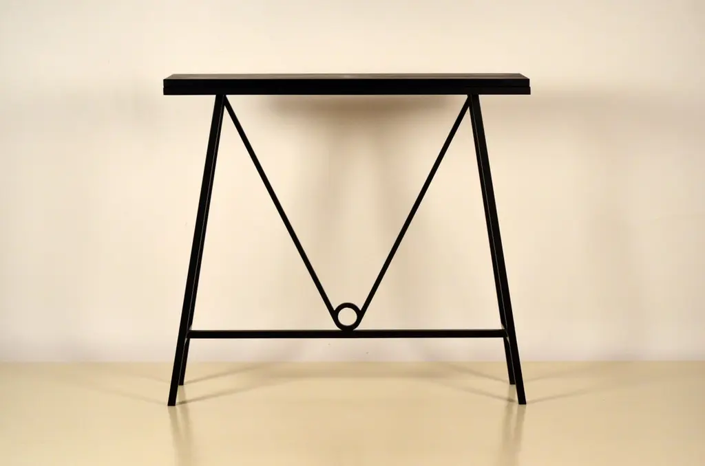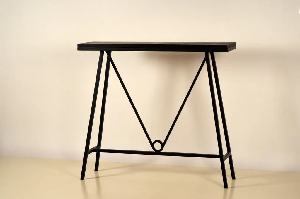Pair Of 'Trapèze' Blackened Steel And Goatskin Consoles By Design Frères