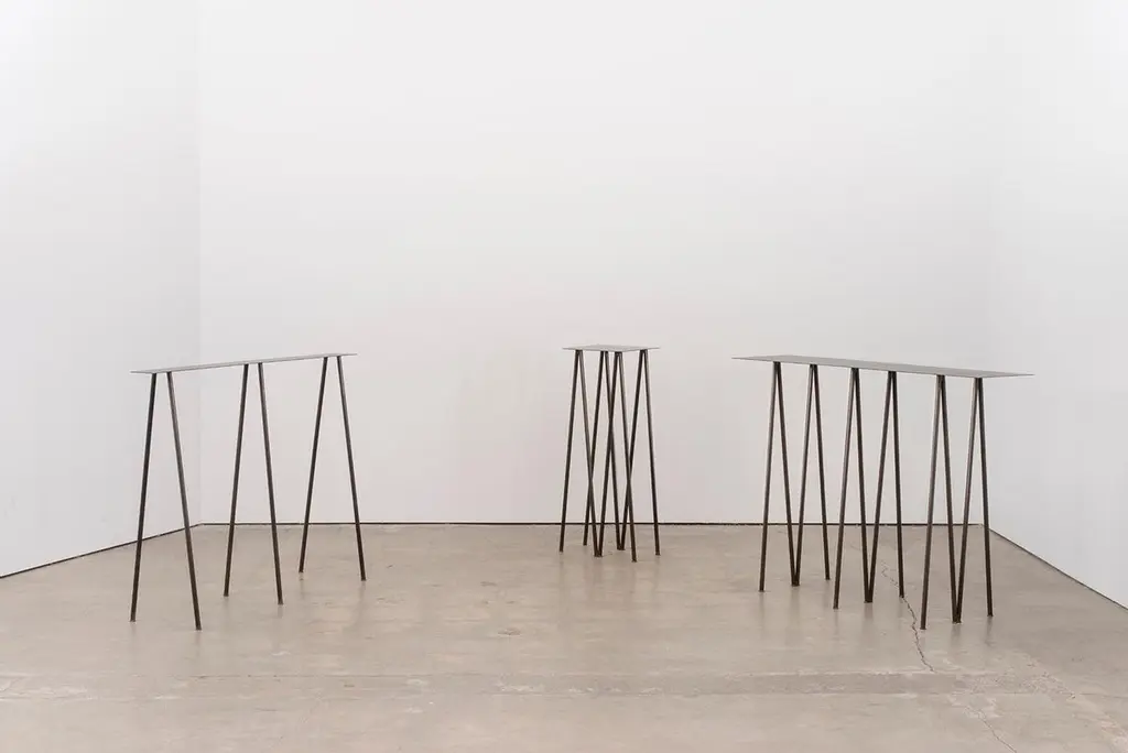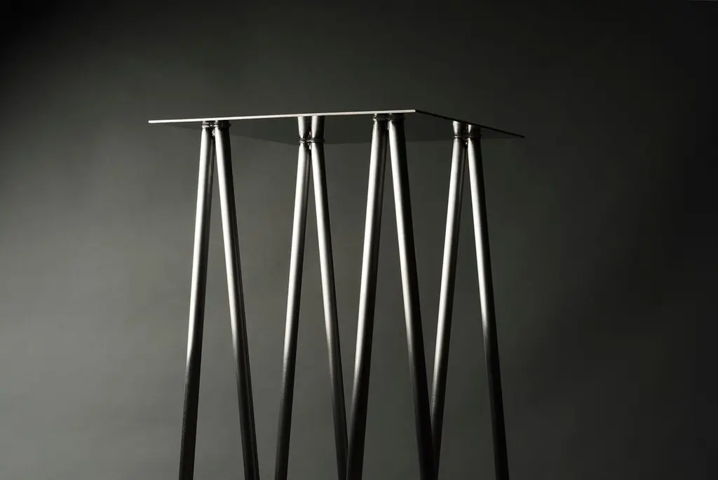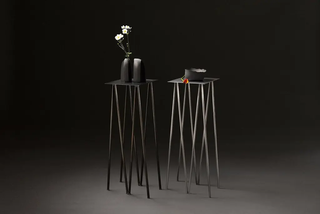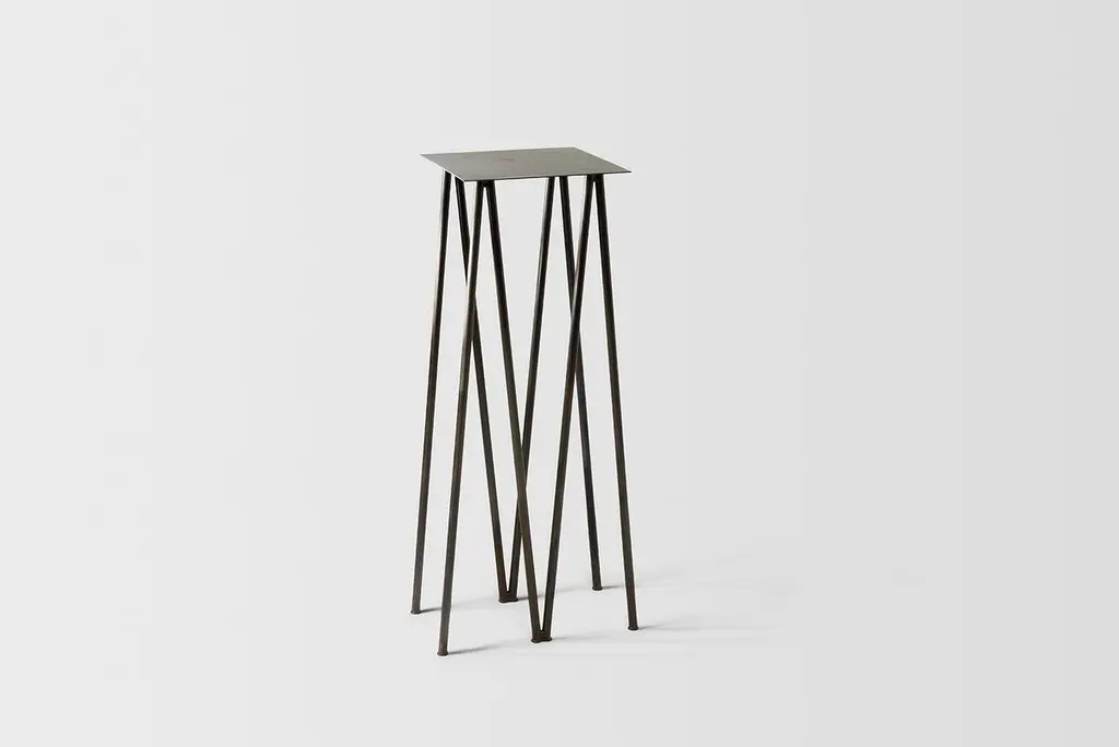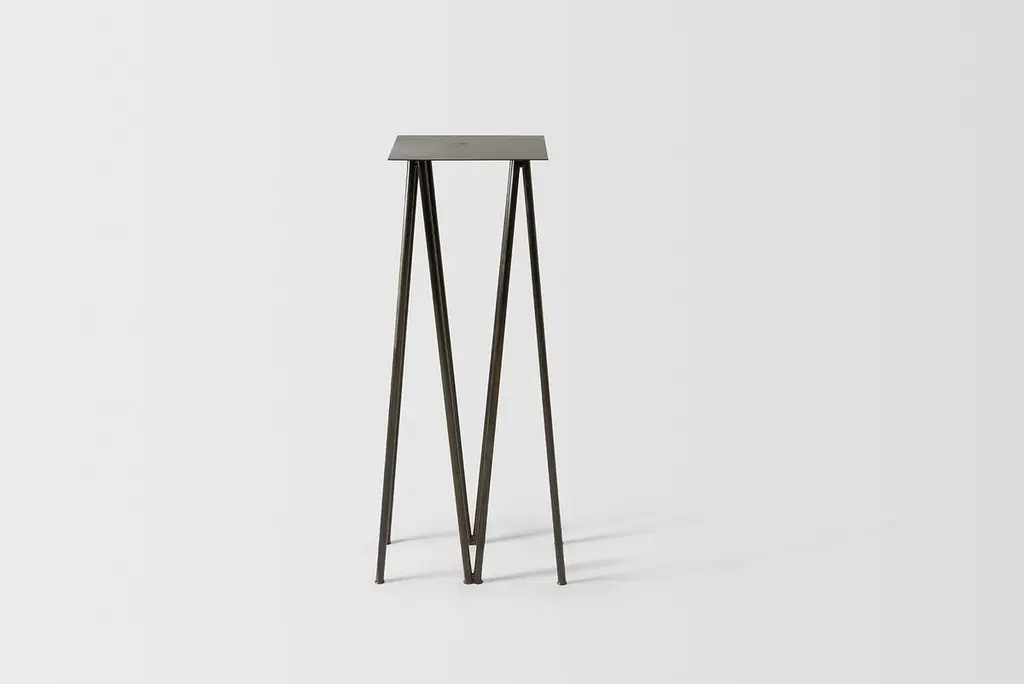 Where metal implies sturdiness and calls for strong industrial motifs - the I/ the H, the beam / the cross, the Paper Table is a play on our own sense of balance. It questions the thinness of both surface and structure, in order to reach their minimal expression. What is the minimum structure necessary to draw a sense of comfort and sturdiness, while still feeling fragile and "almost precarious" in its movements. The metal surface becomes paper-like, levitating - supported by an elegant series of V legs. The result is a perfect balance between stability and thinness. Listing is for Stained Black Finish although also available in Polished Steel Finish. Dimensions:L 1'8", D 1'3", H 3'8"Table surface: 1'3" x 1'3".