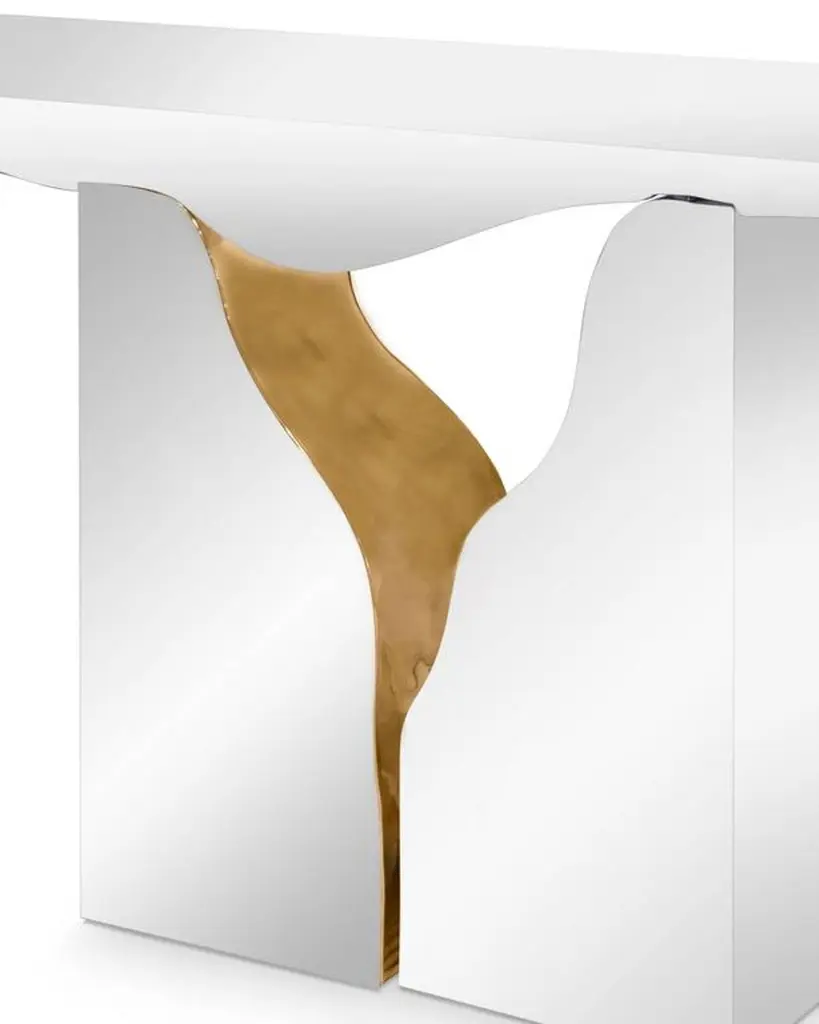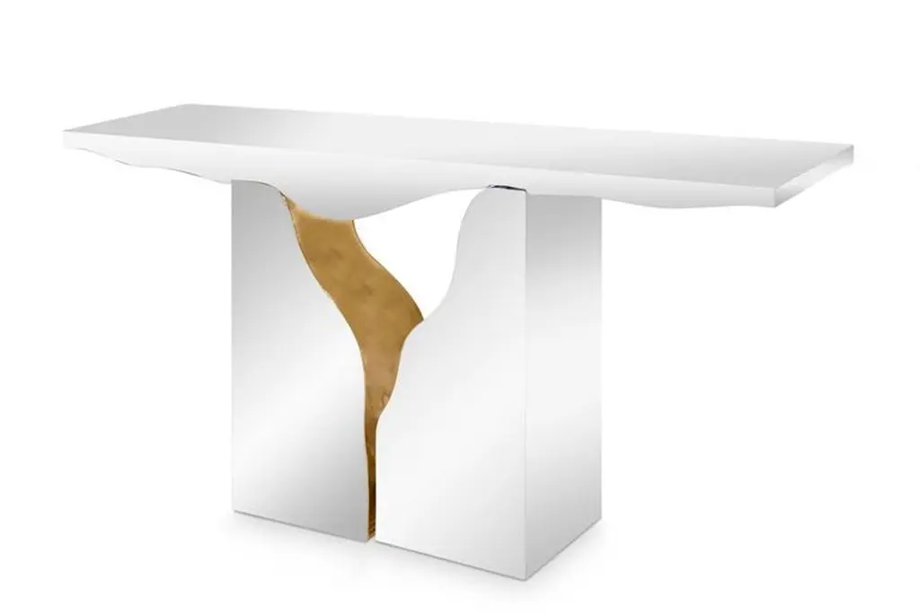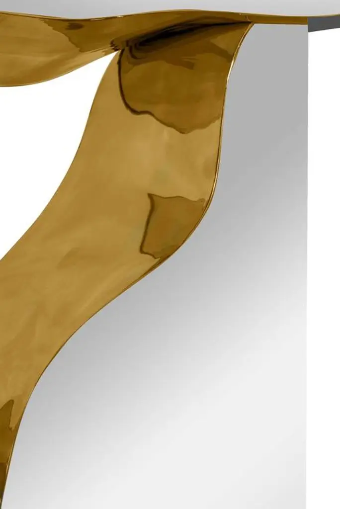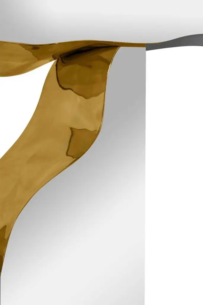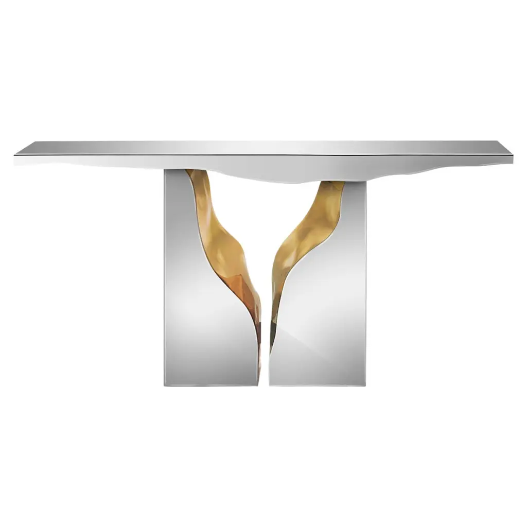 Console table Paradise features a mahogany structure with its inside finished in polished brass, exterior finished in polished stainless steel.