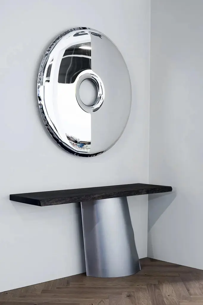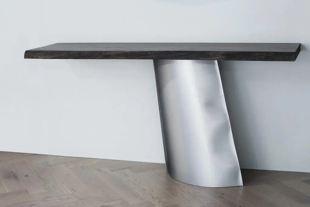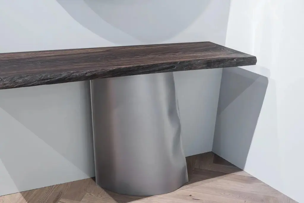 Parova console mono oak by ZietaDimensions: D 40 x W 150 x H 75 cm Material: Carbon steel, bog oak.Available in steel base and top.The minimalist steel base of the Parova Console juxtaposed with the Dark Oak base is something for the true lover of cutting-edge design. It is an object that merges two opposites: cold steel and warm wood, contemporary simple form with a traditional material and shape. It has something industrial in it, but is also just a unique sideboard, a small table or a buffet meant to be leant against a wall.About Zieta: Zietas main goal is to deliver uniqueness and customization in design and construction while keeping the production, transport, and warehousing innovatively efficient.This is how they imagine the future world: Light, durable structures of customized applications produced on demand out of one-of-a-kind parts, yet efficiently.They use a computer-controlled production process. Customized pattern, customized form, customized function, one-of-a-kind product, and outstanding precision are what they deliver.You will find all of this philosophy reflected in the products. They research, they discover new possibilities, they play with forms and they deliver a beautiful, innovative, surprising outcome to people who love the design and who care about design development.They believe their work is a valuable contribution to the world of design not only by the unique beauty of the forms but most of all by opening ultra-innovative opportunities of forming and new paths for the world of the future.