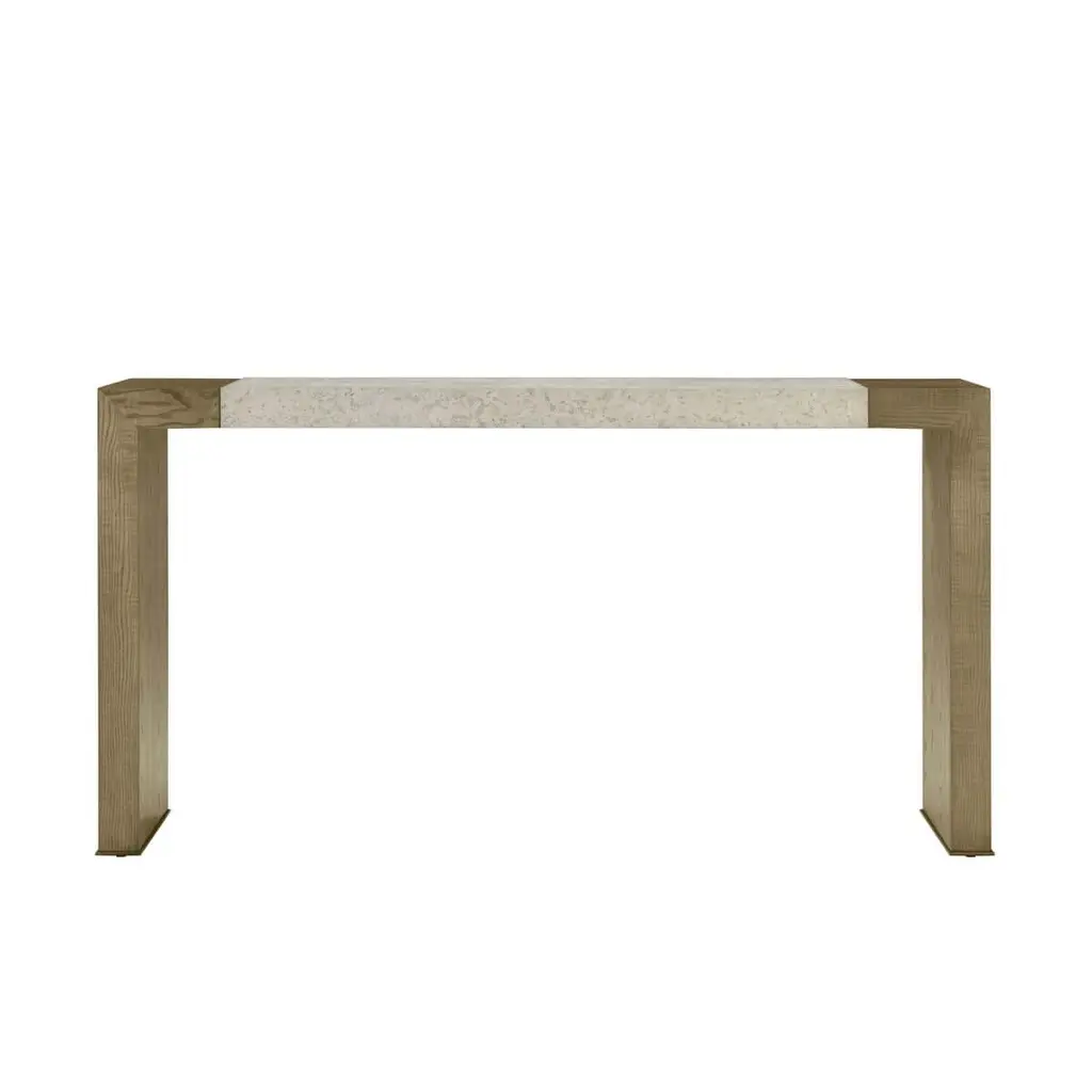 A modern parsons style console table made of figured ash in our light dune finish with our exclusive Mineral finished top and metal detail at the base of the legs in a bronze finish.Dimensions: 66" W x 14" D 34" H