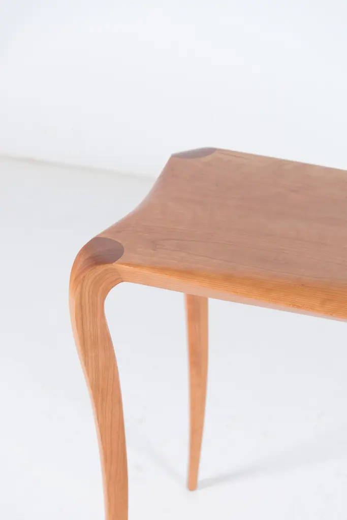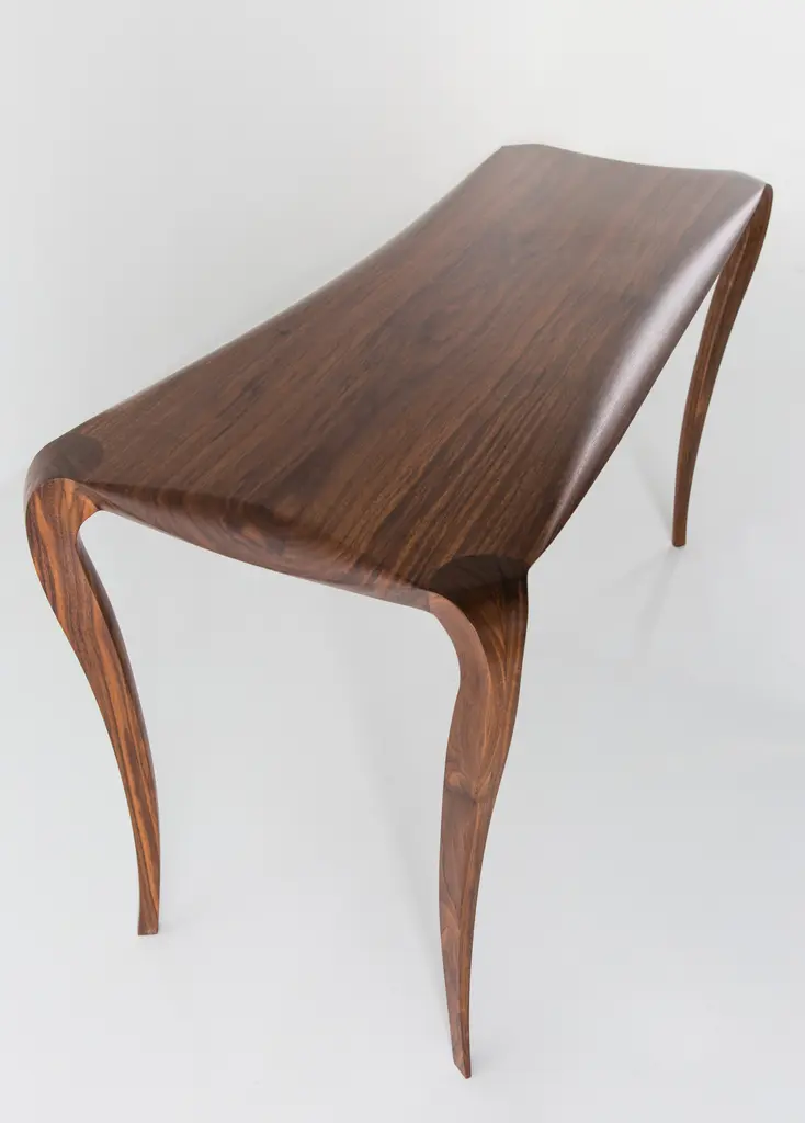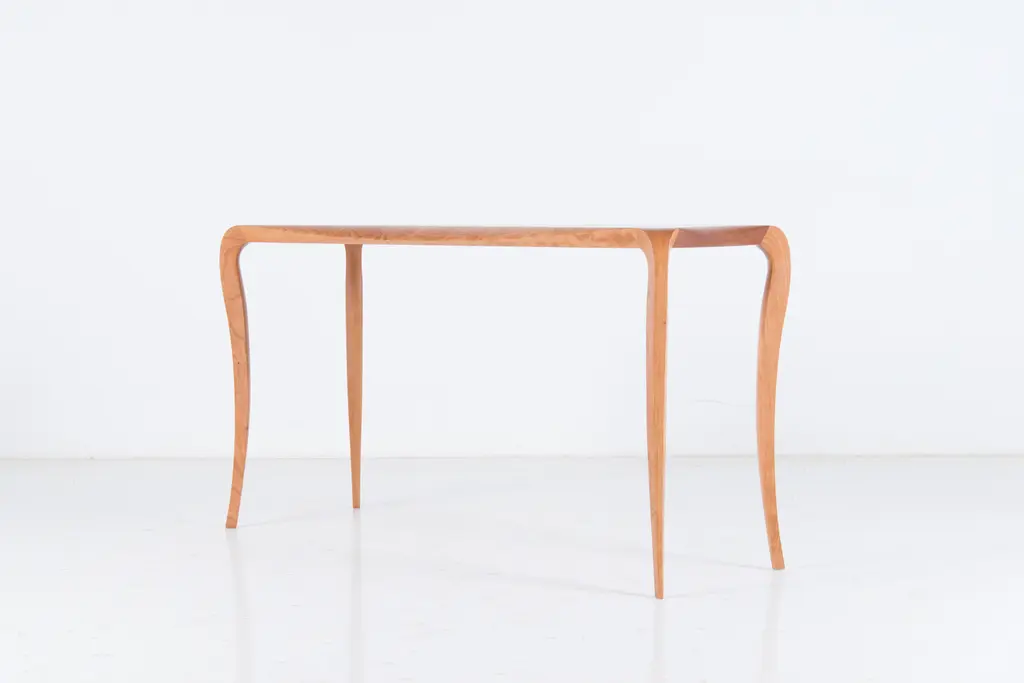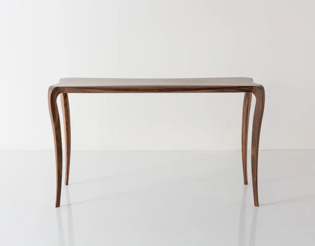 The Pasadena Hall Table is suitable for use in a hallway, as a writing desk, vanity, or side table. Complex to build, the table requires hours of sculpting to complete. Gentle, complex curves and shaped legs join the tabletop visibly – yet seamlessly to the touch – using joints that require a steady, experienced hand to produce extraordinary beauty and strength.