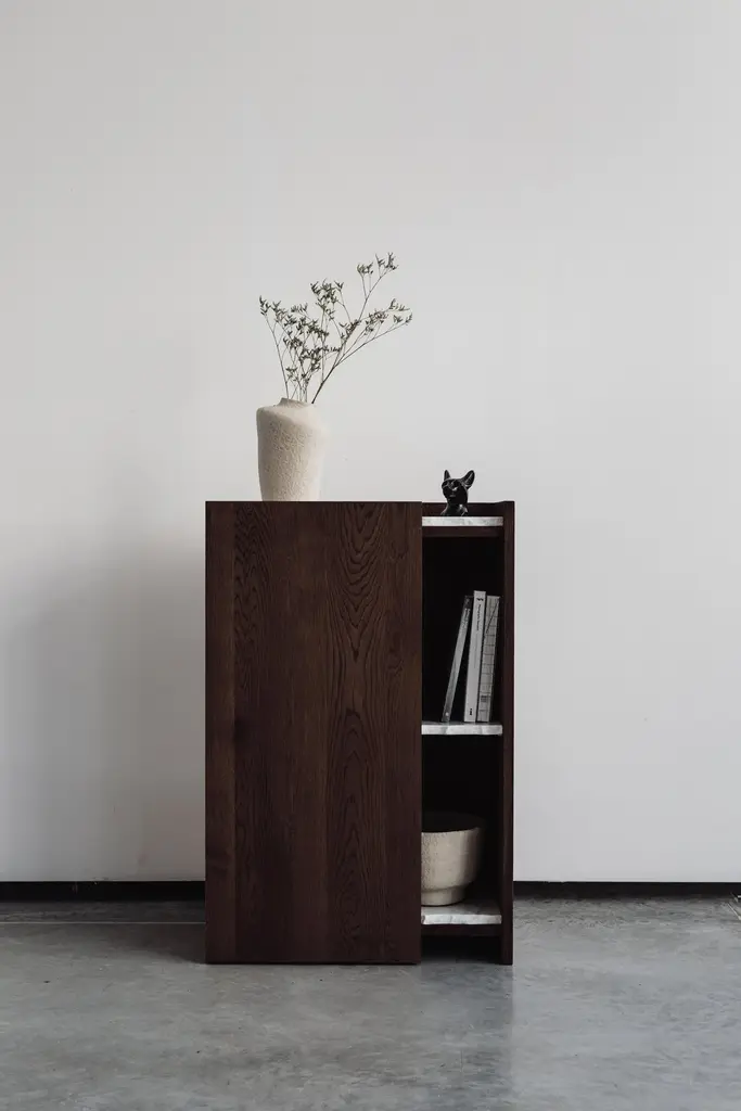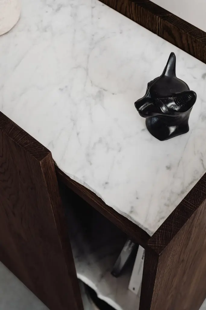 Pavo Console Table by Un’commonDesigned by Małgorzata Korycka.Dimensions: D 30 x W 60 x H 90 cm.Materials: Carrara marble and dark oak.Available in different oak finishes: raw, smoky, dark, and graphite. Available in three different marble options: Carrara, Calacatta Viola, and Rosso Levanto. Please contact us.PAVO is a chest of drawers with beautiful marble shelves and raw, irregular edges. The body of the furniture is made of solid wood protected with a natural wax oil finish. It is available in four colors. Its hallmark is a partial opening, thanks to which you will highlight its beautiful interior and content that is valuable to you.Our Polish workshop designs and hand-makes furniture from marble and steel. Our furniture should not only be well-designed – it should be a feast for the senses. Nothing can produce this effect quite as good as marble.It is a beautiful, refined, natural material used for centuries in architecture, art, and everyday life. There are many different stone quarries, offering different types and colors of marble. However, because it is a natural material formed in a very complex process, it is virtually impossible to extract two identical pieces of stone. In our opinion, in a world ruled by plastic and mass production, this thrill of surprise is a bit of genuine luxury, reserved only for natural materials and their enthusiasts.Thanks to the physical properties of stone and precise workmanship, Un’common furniture is built to last. Over time, a natural patina may form on the surface, adding extra charm to your beautiful and refined furniture, which – if treated well – will reward you every day. Nothing can beat the taste of coffee when you drink it at a marble table.