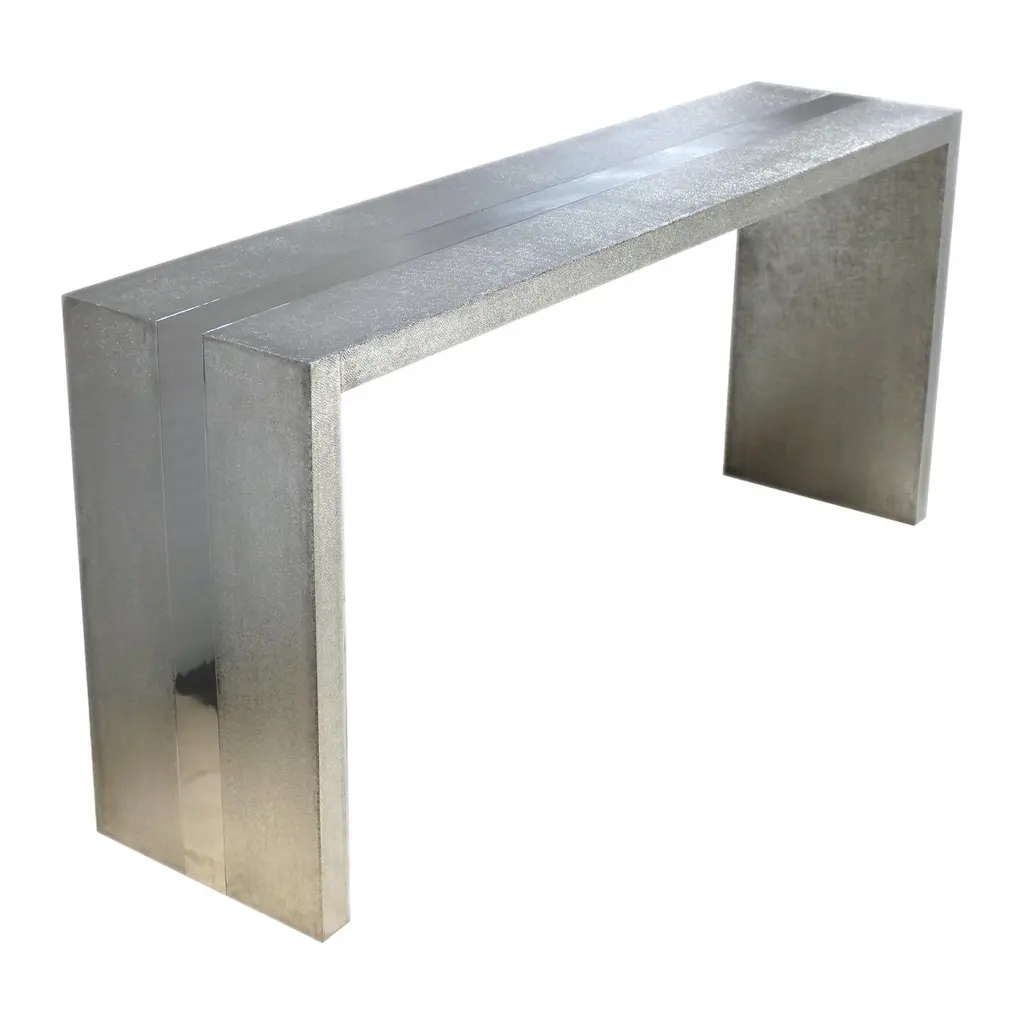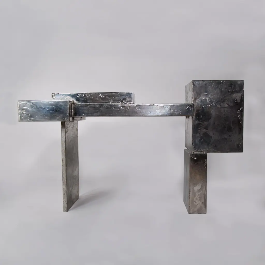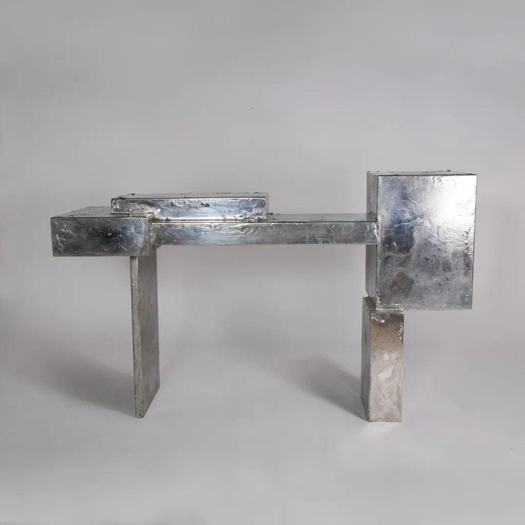 Pewter console by Gentner DesignDimensions: D 137 x W 43 x H 84 cmMaterials: pewter on steel.The Pewter Collection is a family of furniture pieces defined by their materiality and formal qualities. One Crucible at a time, pewter is melted into liquid form and hand coated onto the steel structure, creating the other-worldly surface that makes each handcrafted pewter table unique. Through its manifestation of conceptual thought and dream like movements expressed through Christopher’s knowledge of materials and craftsmanship. The material finish on each piece turns into a creation unlike any other, embodying the surface of a lunar landscape and a one-of-a-kind sculpture.Gentner DesignRooted in a language of sculpture, character defining details, and world renowned craftsmanship, the work is found at the crossroads of design and art.Established in 2011, the namesake furniture label is a rare combination of aesthetic dexterity and mastery of Craft resulting in furniture and objects that are expressive, formal, and transcend materiality.The collection is based in metal and incorporates only natural materials such as leather, wood, and glass in unique ways, challenging our assumptions.Christopher GentnerChristopher Gentner, with a BFA in metalsmithing from the Cleveland Institute of Art and apprenticeships under sculptors and jewelers, together with dedication to Craft, quickly developed his reputation nationally as a foremost authority of metal fabrication and furniture.One of his crowning achievements was the re-creation and fabrication of the Frank Lloyd Wright Robie House gates.These unique experiences are the foundation of his design philosophy which he employs in his own line of furniture, lighting, and objects.