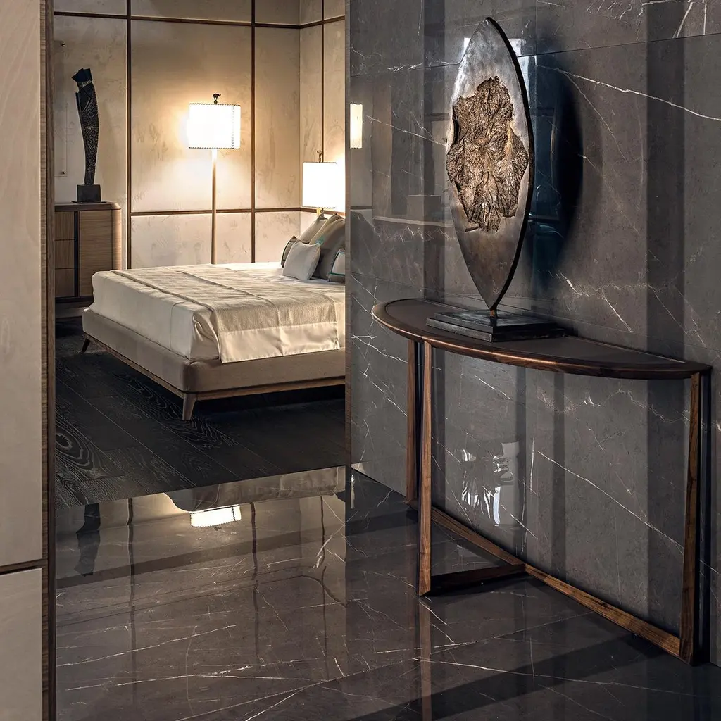 This elegant console will create a glamorous first impression in modern interiors thanks to its prized materials and slender silhouette. The structure in Canaletto walnut and ebony boasts a semicircular top covered in leather sustained by three sculptural legs that slightly flare downwards before reconnecting at the base.
