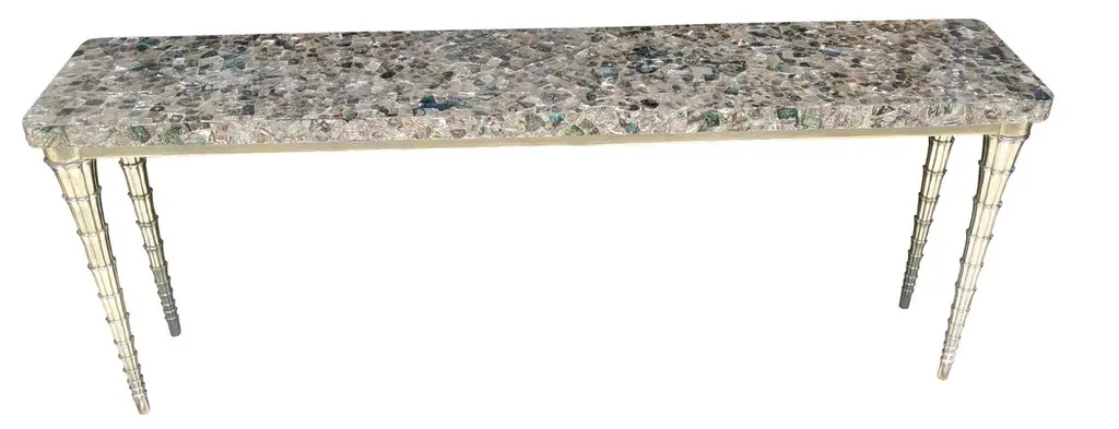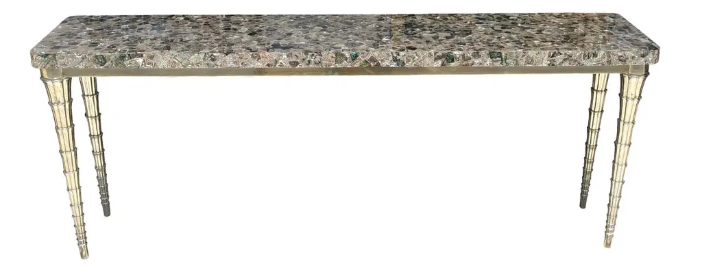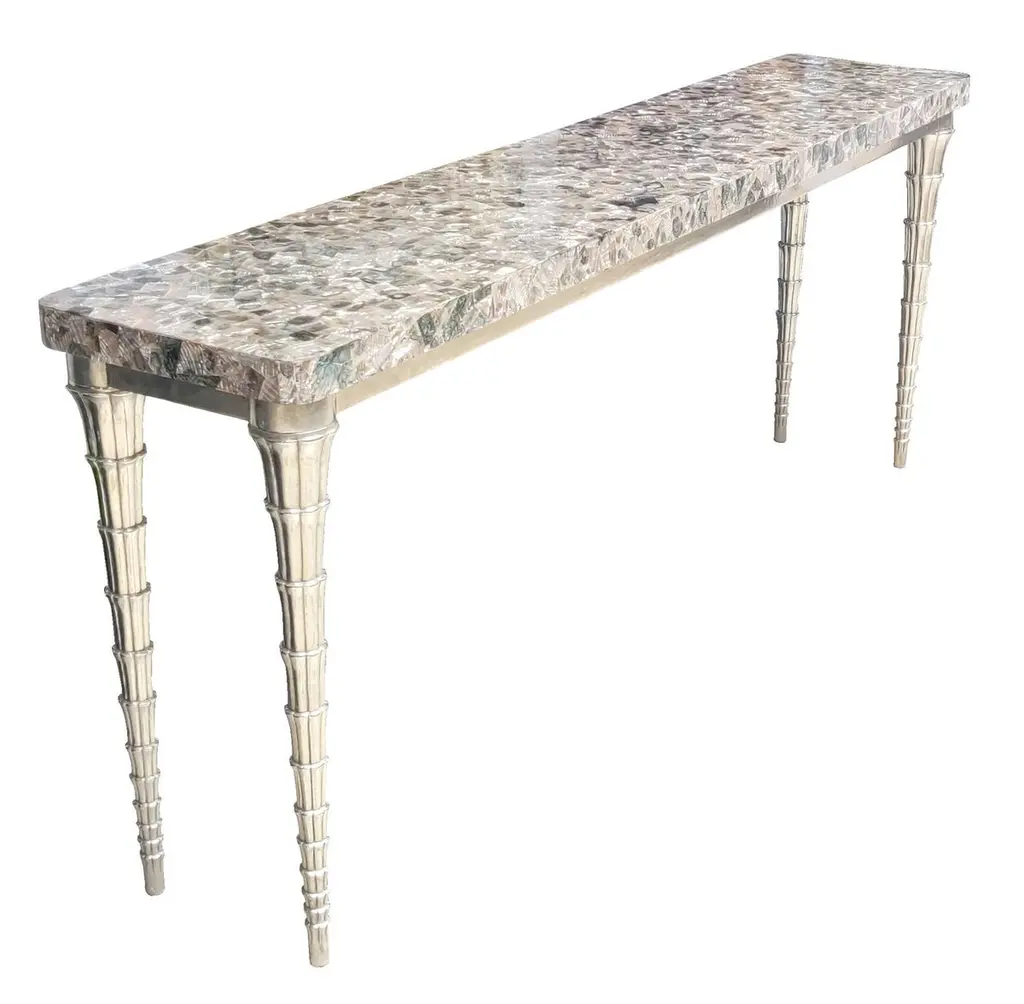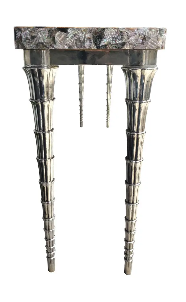 Cornet table designed by Paul Mathieu for the Stephanie Odegard Co. Ltd. Jewelry for the home, this hand carved teak console table is clad in pure silver and adorned with an abalone mosaic top. The CORNET table named for the elements of the legs named after the CORNET flower Arum shape. The master craftsmen carve and cut complex forms that will cover the table from thick sheets of copper or silver. Once the table is joined together, it is meticulously encased in a tight-fitting skin of copper or purest silver. The silver used was assayed at 96% purity, which exceeds the minimum standard for sterling of 92.5%. Brass, White Bronze, Antiqued bronze, Silver and Copper are the available options for the metal skin. Both silver and copper will tarnish over time. Regular non-abrasive household metal polishes can be used to restore the original finish.Pink abalone and white bronze clad cornet tableSize- 60"x18"x31"HMaterials - abalone, white bronze, teak, hand-carved, metalwork, mosaicPlease note that moisture in air, sudden change in temperature and natural movement of wood over time causes the metal to wrinkle or bubble up. We use well seasoned, reclaimed teak and high quality marine grade MDF (wherever technically possible) to avoid and delay the above mentioned changes. However a perfect stability of metal cannot be guaranteed.Please note that moisture in air, sudden change in temperature and natural movement of wood over time causes the metal to wrinkle or bubble up. We use well seasoned, reclaimed teak and high quality marine grade MDF (wherever technically possible) to avoid and delay the above mentioned changes. However a perfect stability of metal cannot be guaranteed.Buyer Cancellation-The cancellation charge is 25% which increases to 50% if the production is started.Prices do not include shipping from India (for custom orders) or our MN warehouse (items from stock). That will be additional.