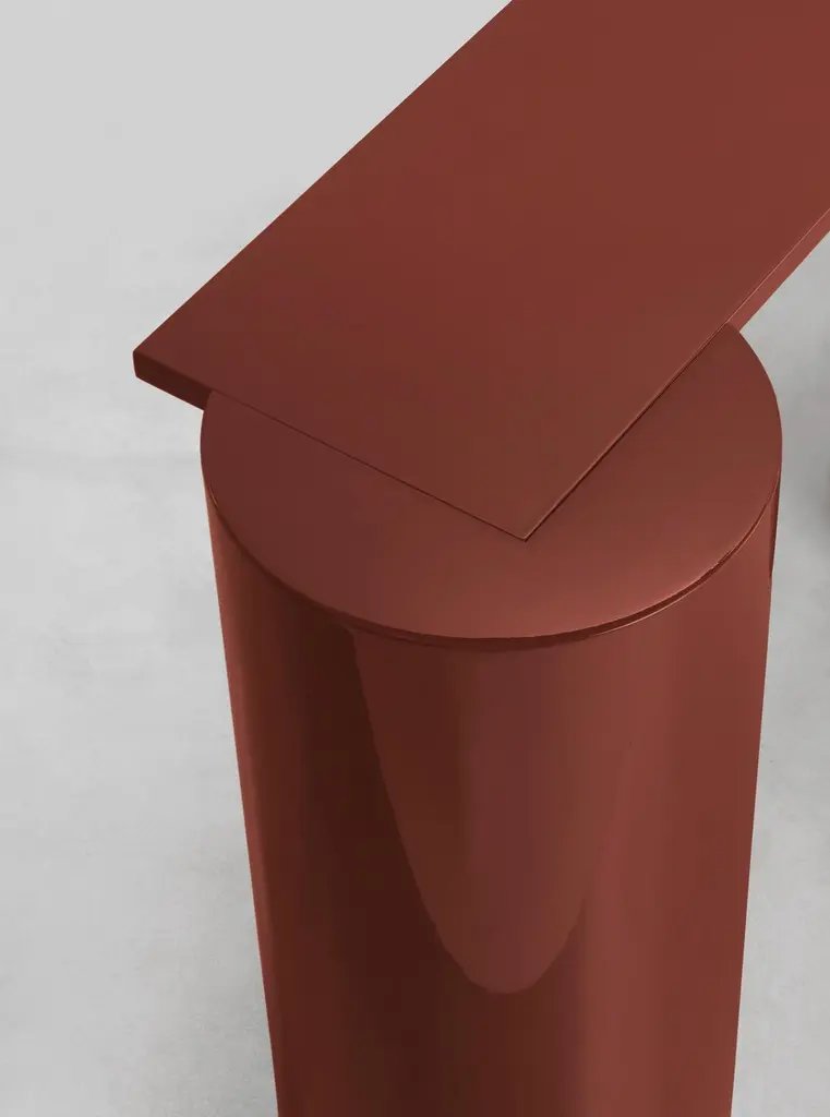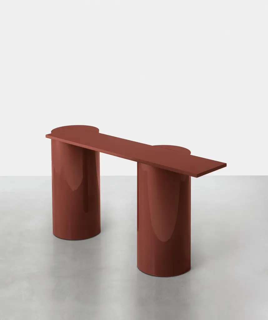 Plinto Console Table by SomaschiniDimensions: W 129 x D 34 x H 70 cmMaterials: Lightened mdf, Top in lacquered mdf or marble. Double sided. S43 Brown-red high gloss polyester lacquered finish.Console in N.118 Brown-red lacquered high gloss finishAbout: Somaschini is a new-born brand, with a strong, innovative attitude, and rich artisan heritage in 1940s Brianza — a hard-working region of Lombardy, internationally renowned for the production of high quality design. It thrives, however, on new ideas and contemporaneity and never lapses into nostalgia but rather masters its own high craft. It shows a certain obstinacy in pursuing techniques honed over decades, preferring to make them speak through new languages. Hence it challenges tradition with a bold, intelligent, and confident approach.