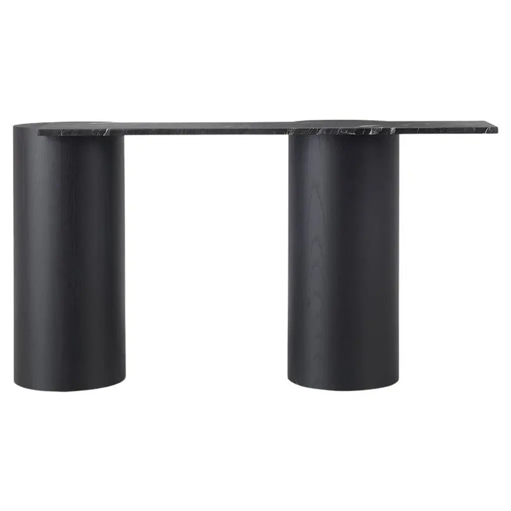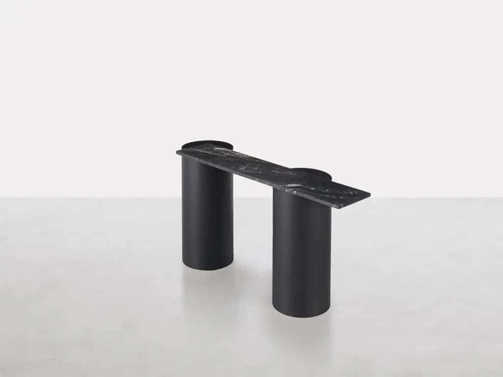 Plinto console table by somaschini dimensions: w 129 x d 34 x h 70 cm materials: lightened mdf, top in lacquered mdf or marble. Double sided. S44 black ash wooden venner in matt finish, top in belvedere natural brushed marble. Console in n.100 black ash veneer matt finish, top in belvedere brushed marble