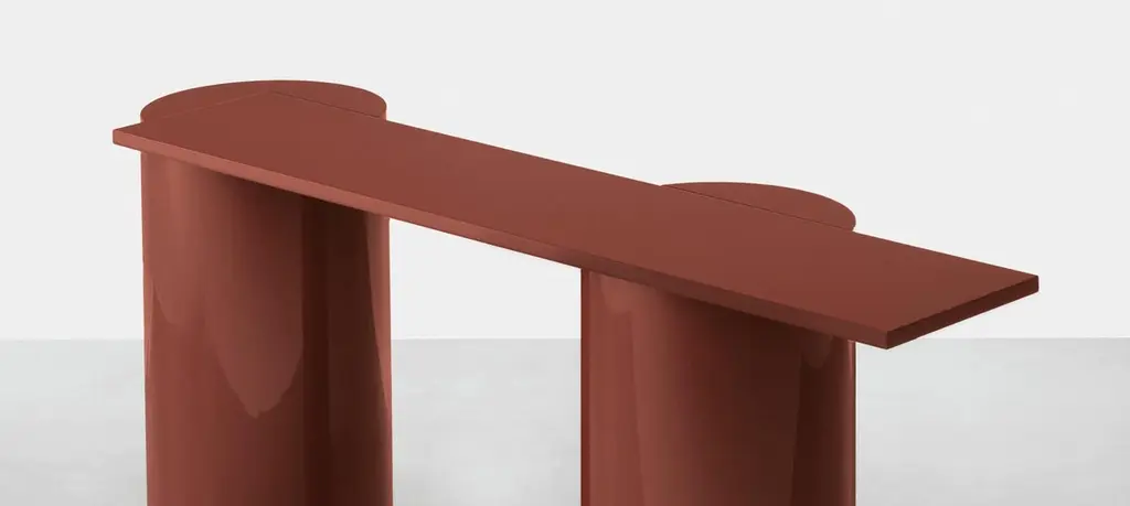 The column legs of this console table have the same relevance as ancient temple legs.The lofty reference is contrasted by the playful play of the cantilevered top, contemporary in the balance that suggests instability.Lightened mdf base, available with marble or lacquered mdf top. Double sided. Brown-red high glosspolyester lacquered finish.More wooden veneers and lacquered finishes are available as per sample bookThe 100 gloss shiny polyester lacquers, with machine and manual brushing, are obtained thanks to a process that requires up to eight different paint coats. A range of colors specially designed for this collection is also available in matt finish.