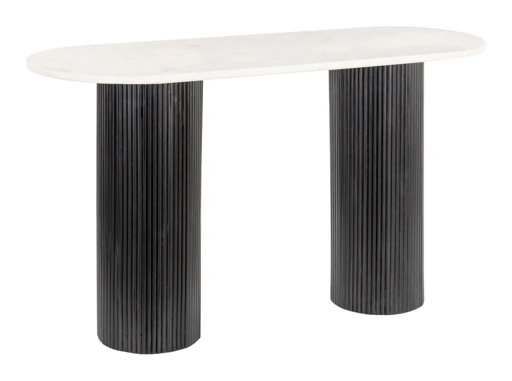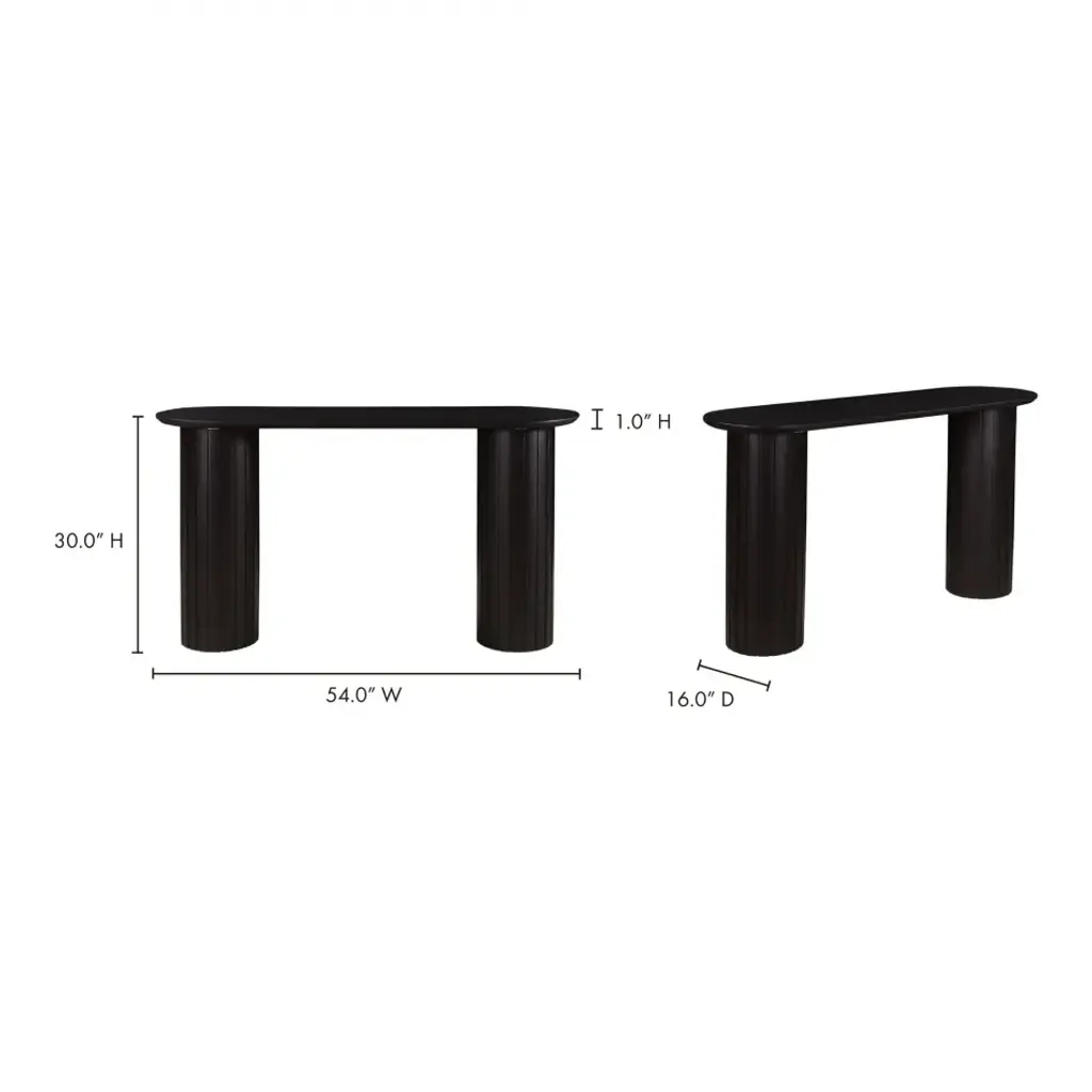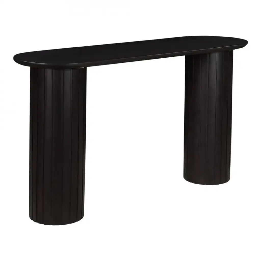 A convergence of shape and form, the Povera console table will serve as the pillar of your entryway or living area. Povera features two large columns supporting an expansive tabletop, their gentle ribbing reminiscent of ripples and waves. With beautifully darkened acacia wood, this console table uses simple geometry and natural materials to form an enchanting experience. Offering bold statement appeal, Povera incorporates the elegance of ratio into your home.