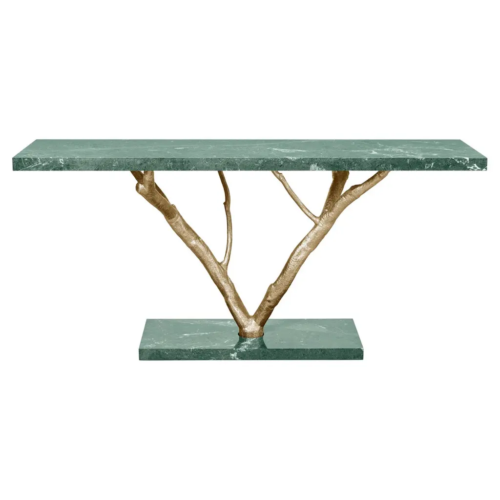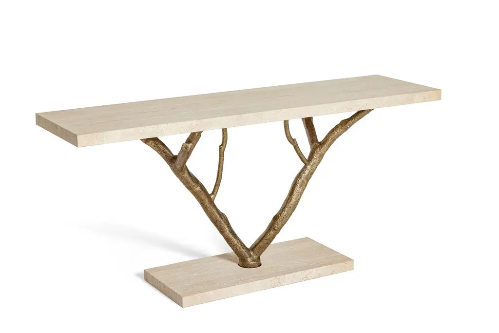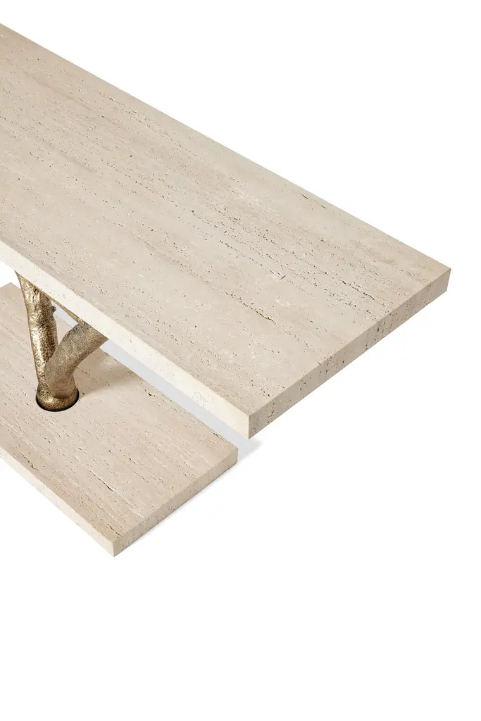 Primitive Console by Ginger & JaggerDimensions: D 50 x W 180 x H 81 cm. Materials: Romano Travertine stone and brass.Finish: Top and base in Romano Travertine stone in natural finishing; structure in molded cast Brass in Antique Brass finishing.This product is suitable for custom size. This product is made for living areas and interior spaces only. This product is not specified for bathrooms, spas, or humid environments. Not suitable for exteriors. Available in different finishes. Please contact us.Launched in Europe in 2012, Ginger & Jagger is a product design brand that prides itself on creating handcrafted high-end contemporary products inspired by Nature.Designed and produced in Porto, a land of craftsmen and age-old tradition, Ginger & Jagger’s Earth to Earth collection is an evocative poetic realm, where Nature’s sculptural shapes are made eternal through handcraft, with unique artisanal techniques and an outstanding blend of superb materials such as brass, silver and copper, marble and stone, and wood.The designer's compass is kept by an uncompromising desire for creative innovation balanced with the integrity of the materials, the artisanal techniques employed, and the brand's very own narrative element.The artisanal techniques availed range from brass casting, wood, and marble marquetry, hand-hammered metals, and hand-sculpted marble.Striving towards sustainability. Ginger & Jagger supports organizations worldwide, with contributions indexed to the products crafted every year.