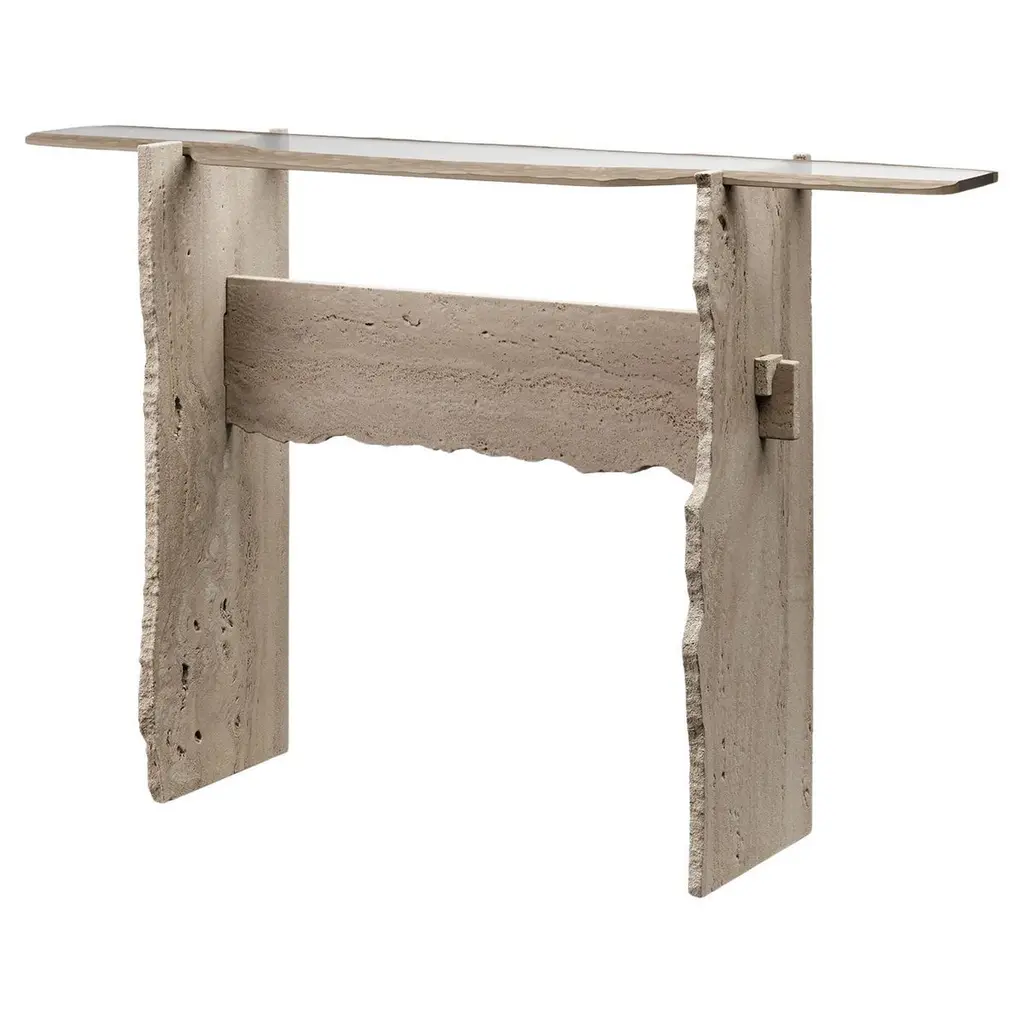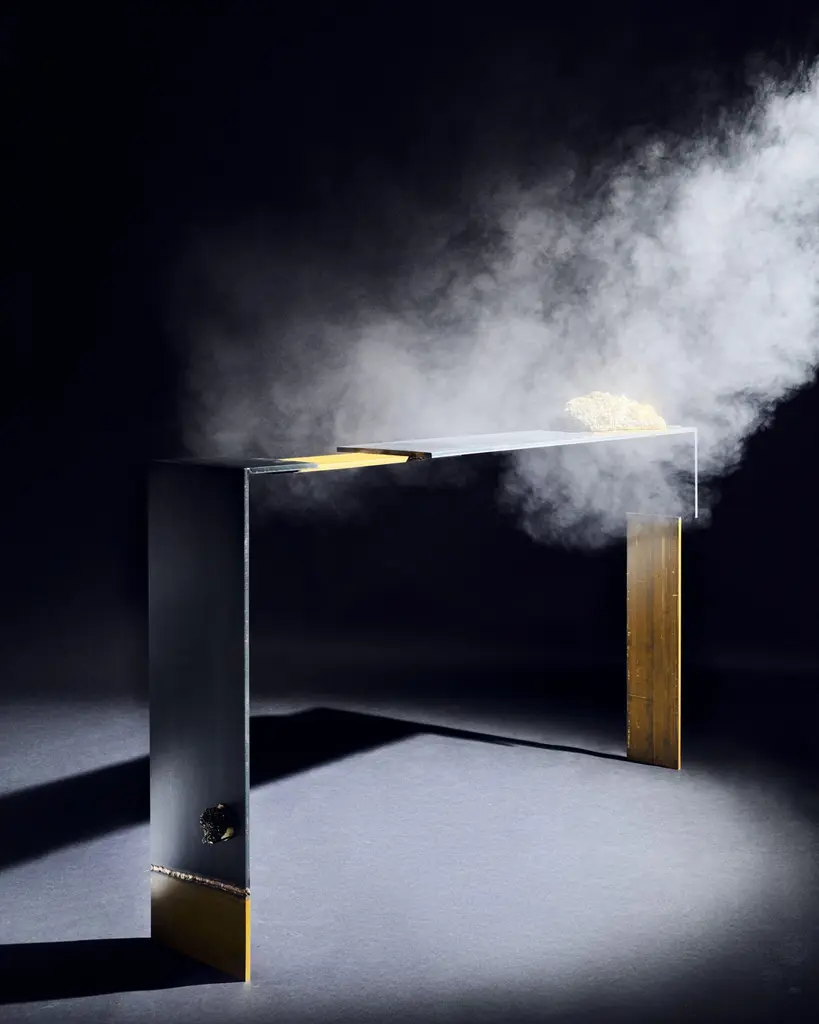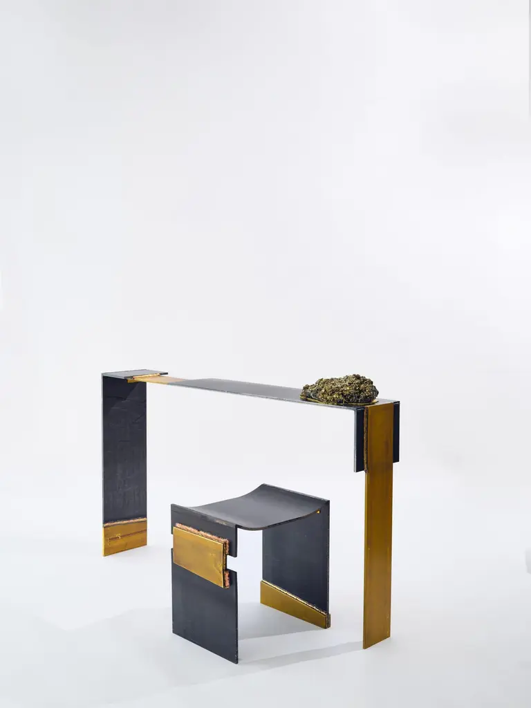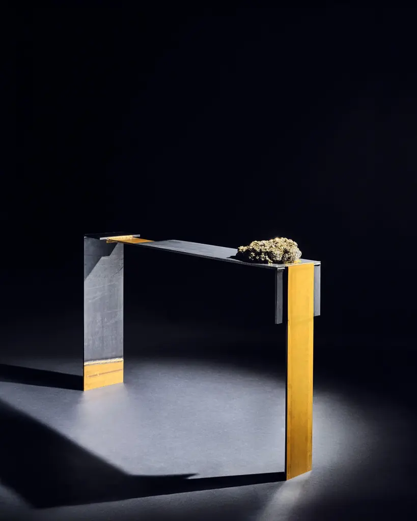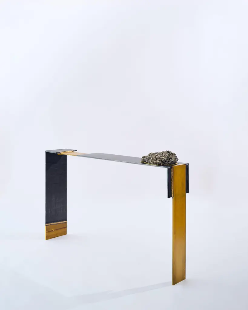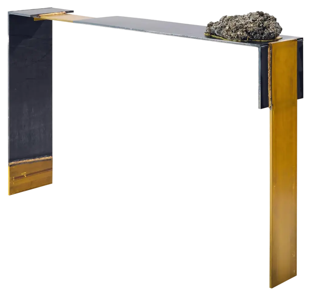 Pyrite Consolte table 1 by Brajak VitbergDimensions: D 100 x W 25 x H 85 cmMaterials: Dichroic glass, metal fixture detailsBijelic and Brajak are two architects from Ljubljana, Slovenia.They are striving to design craft elements and make them timeless through experimental designing process.The studio creates a range of products from handmade and limited small series to one-piece unique products, inspired by materials and forms that create incomplete perfection.
