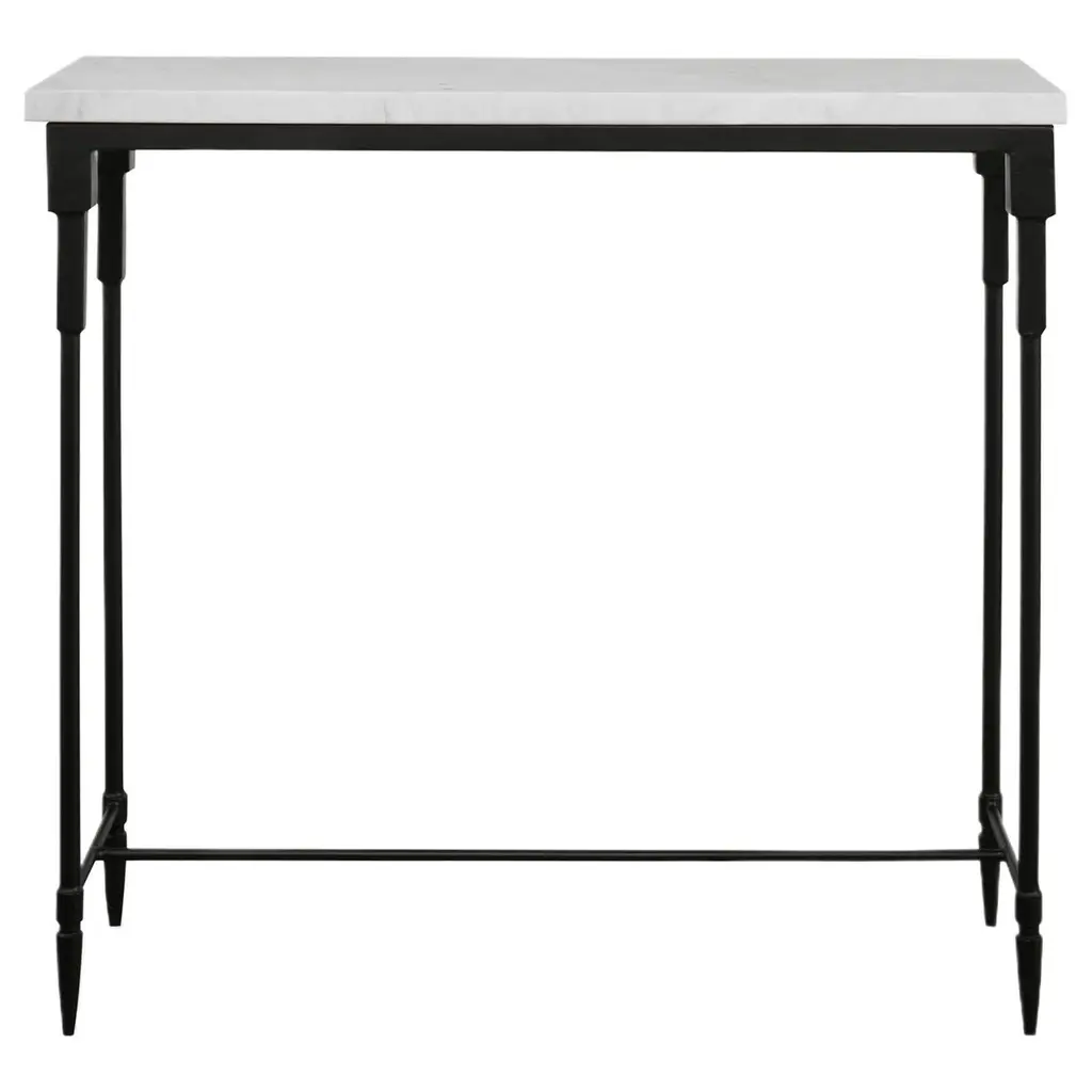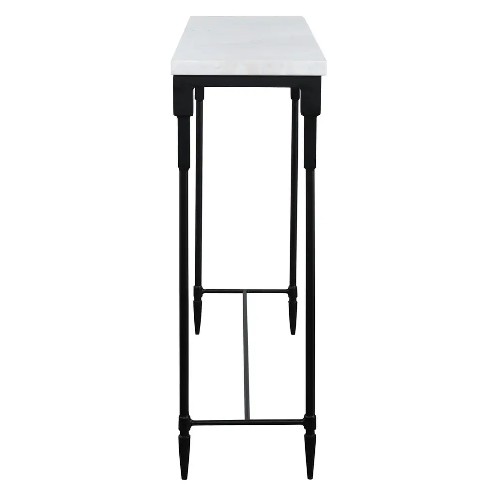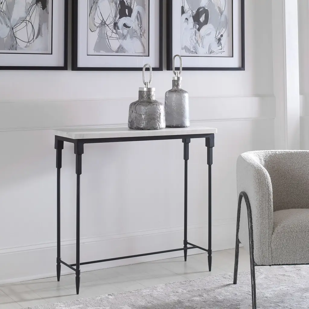 The Raphael console table is a timeless piece that effortlessly marries classic elegance with transitional style. Its design is a harmonious blend of a honed marble slab top and a sleek iron base, creating a striking silhouette that is both sophisticated and versatile. The natural beauty of the marble ensures that each table is a unique masterpiece, with its own distinct veining patterns that tell a story of elegance and refinement. This console table is not just a piece of furniture; it is a statement of style and grace, perfect for any space that desires a touch of romance and charm.