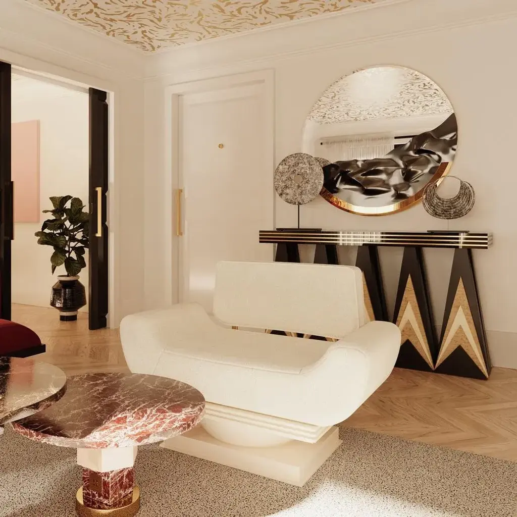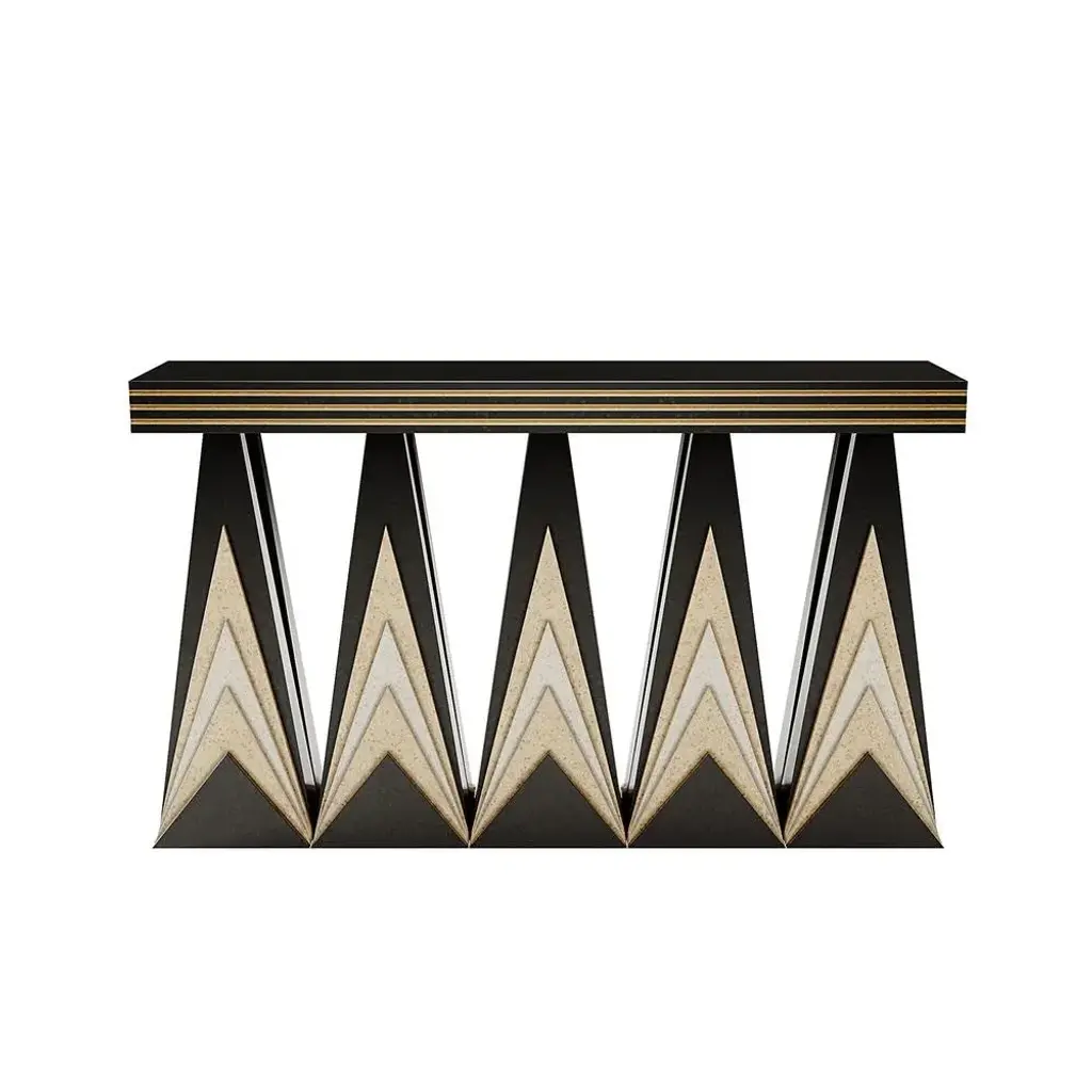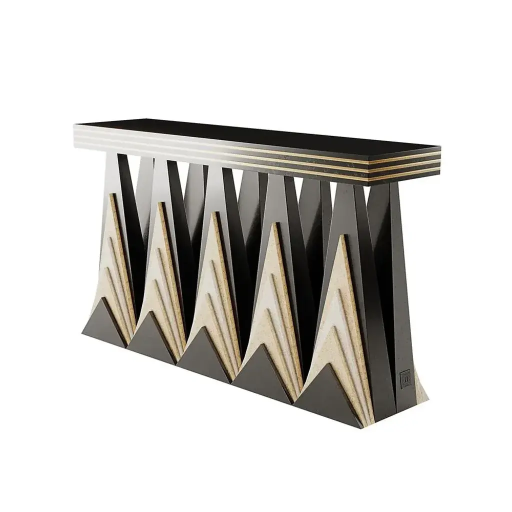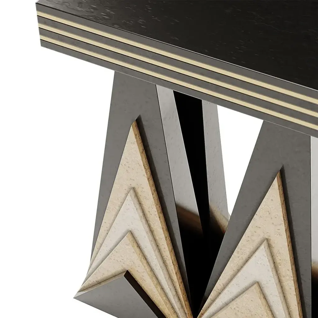 Raplee Console Table is an Art Deco-inspired modern console table. Besides being inspired by this 20s design style, the unique entryway furniture piece also has another inspiration source: the Raplee Ridge in Utah. It mixes a luxury variety of woods, perfect for a modern home design. MATERIALS: Top in Gloss Black Bird Eye and Trims in Brushed Brass; Structure in Gloss Black Bird Eye, White Bird Eye and Natural Bird eye.