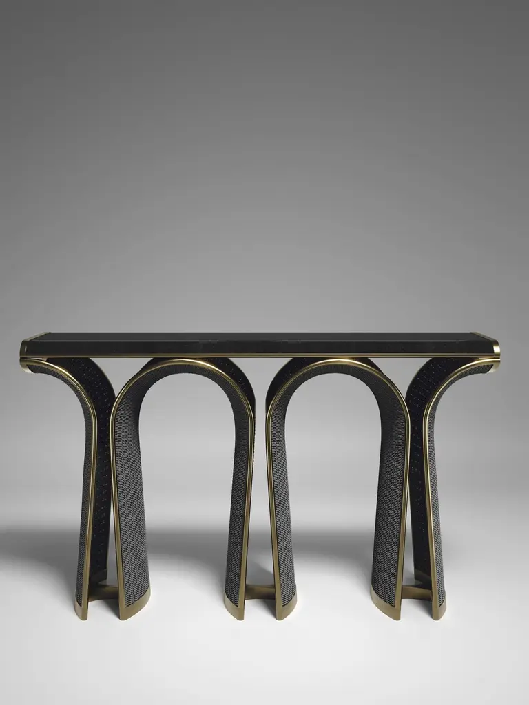 The Paris based label has distinguished themselves since their launch, with their iconic use of shagreen mixed with brass and other exotic materials. All furniture is handcrafted by skilled artisans, ultimately making each piece unique, designed in Paris and produced in the Philippines.The Nymphea Console by R & Y Augousti is a part of their new Rattan capsule launch. The piece explores the brand's iconic DNA of bringing old world artisanal craft into a contemporary and utterly luxury feel. This table is done in a black rattan finish, with a black pen shell inlaid top and bronze patina brass details. Available in other finishes. Part of the Augousti Rattan capsule, see images of the collection at end of slide. Custom sizing/finishing on requestThe dimensions of this piece are:Measures: 155 x 41 x 90 cmAll R & Y Augousti pieces are handmade by artisans, ultimately making each piece unique.Wipe clean with soft dry cloth.Acclaimed design duo Ria & Yiouri Augousti have established themselves since the 1990s as pioneers of modern-vintage style through their luxurious Art Deco inspired collections.The Paris based label has distinguished themselves since their launch, with their iconic use of shagreen mixed with brass and other exotic materials. All furniture is handcrafted by skilled artisans, ultimately making each piece unique. All shagreen-covered items should be kept out of direct sunlight, color variants may occur on the stingray and other exotic finishes, but this showcases the Parisian label's commitment to creating authentic luxurious products using natural components.