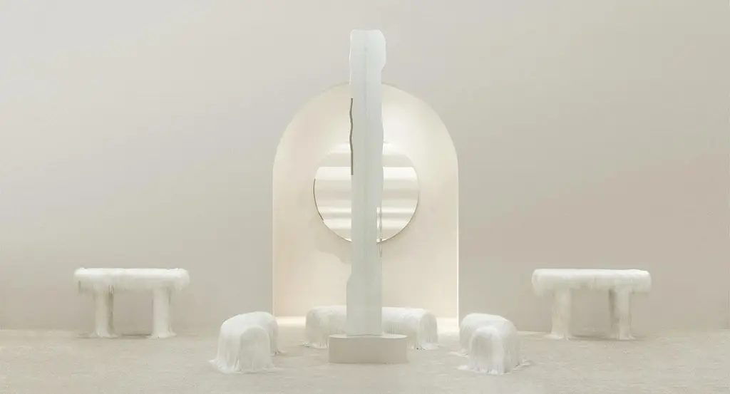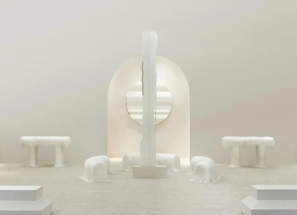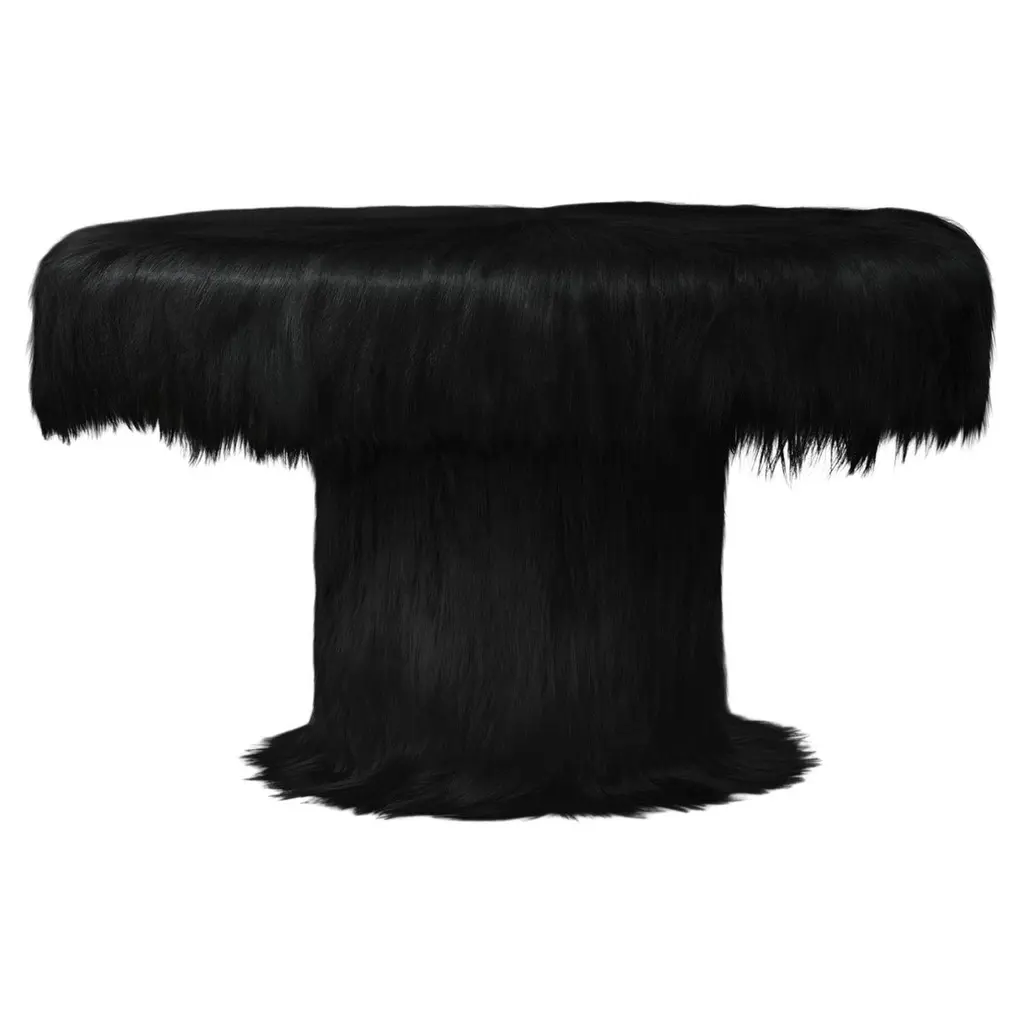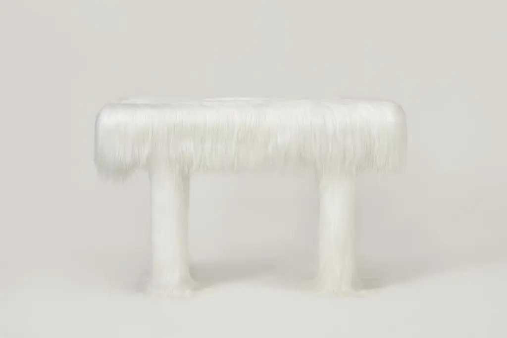 Raw Console Table by Atelier V&FLimited Edition Of 10+2AP Pieces.Dimensions: D 45 x W 120 x H 79 cm.Materials: Goatskin offcutsInspired by the earth goddess Gaia,「Revelation of Gaia」aims to explore the mighty but soft inner power and to praise the mysterious nature. With this collection, we try to break the boundary between artistic sculpture and practical furniture and explore different materials. It is an artistic scene made up of furniture. The soft and tender fur covering the tough structures, touching the ground, reflects the power of the all-encompassing earth. The hair flutters with the flow of air, like the quietly rhythmical breathing of living creatures. Grand and delicate, strong and soft, it pictures the female spiritual profile and represents the strength and tenderness of female quality.In the collection, the table and two benches create the core as the scene of primitive worship. Like a silently divine beast, the bulky rectangular body of the cabinet is supported by two reliable feet that strongly grip the ground, with long hair of the fur drapes and soften it. Inside the cabinet is a hot and passionate hue of red, contrasted with the neutral color on the outside, it is a metaphor for the mighty inner power and profound emotions of women. As a lovely variation in the collection, mirrors are regarded as the symbol of reason and self-awareness. We took on this to bring the calmness of reason and order into the collection by abstract method.Atelier V&F was co-founded by Chen Furong and Vega Zaishi Wang in Shenzhen. Chen Furong graduated from the Shanghai Institute of Visual Arts, majoring in comprehensive design. And he started the design studios WUU and CHEN FURONG Studio. Vega Zaishi Wang graduated from the London College of Fashion and Central Saint Martin and founded the designer brand VEGA ZAISHI WANG. The designers’ professional background and artistic upbringing become the intrinsic character of Atelier V&F. Their expertise, professional knowledge, and years of experience in the design field are the fertile ground for the development and exploration of Atelier V&F that enable it to break the divide of territories and cultures, and with an inclusive narrative to interpret aesthetics and functionality. The two designers’ poetics of life and living, their respect for different materials’ true nature, and their unceasing pursuit of exquisite craftsmanship instill vitality into Atelier V&F’s works from artistic sculptures, installments, and space to practical and utilitarian objects. Vega’s intuitive riding on fashion’s romantic urge and flow andFurong’s philosophical perspective on practical design is combined in one artistic expression, making their works both detailedly practical and ceremonial. As a married couple, the duo instills powerful emotional strength to the work of Atelier V&F, trying to interpret and represent the non-utilitarian and simple beauty in a coldly rational and precise world.