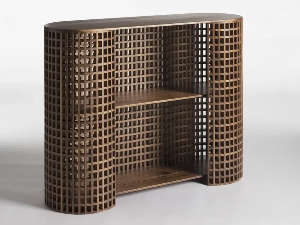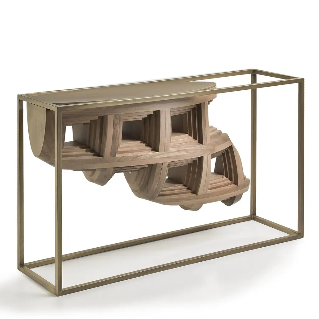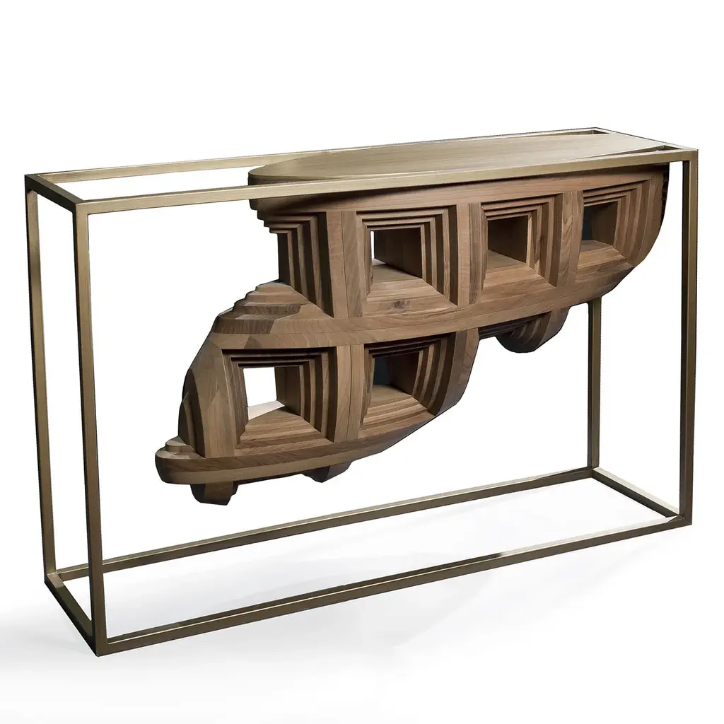 The Rebus console's bronzed metal frame exudes geometric elegance, cradling a wooden, organically shaped fragment. Inspired by the Pantheon's dome, the solid walnut piece, intricately etched with coffered details, creates a visually mesmerizing, gracefully perforated structure.
