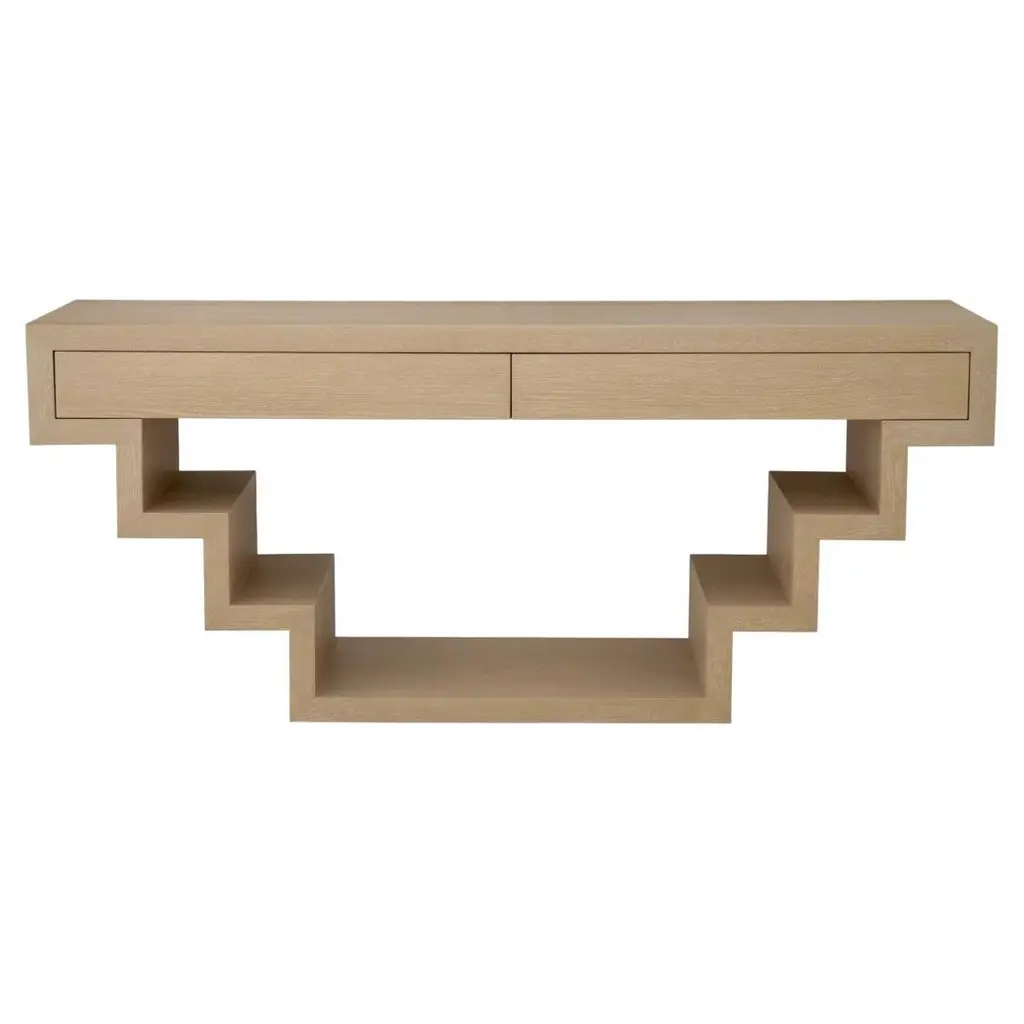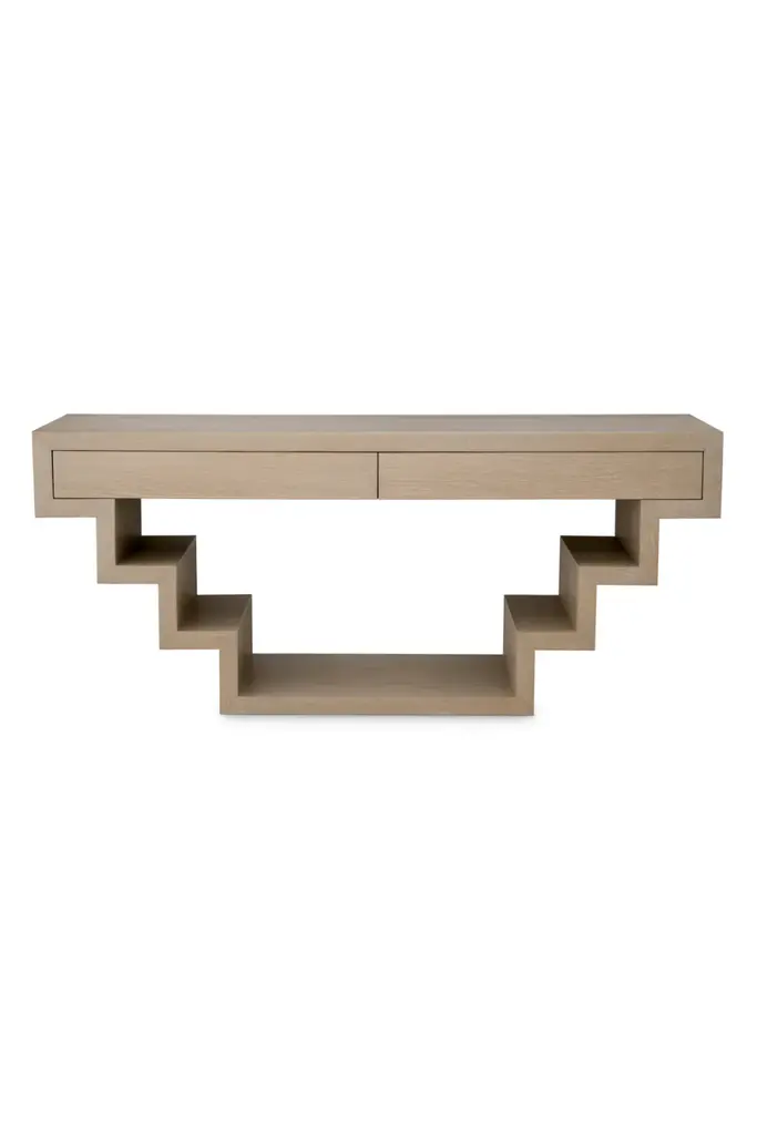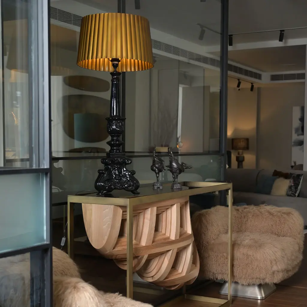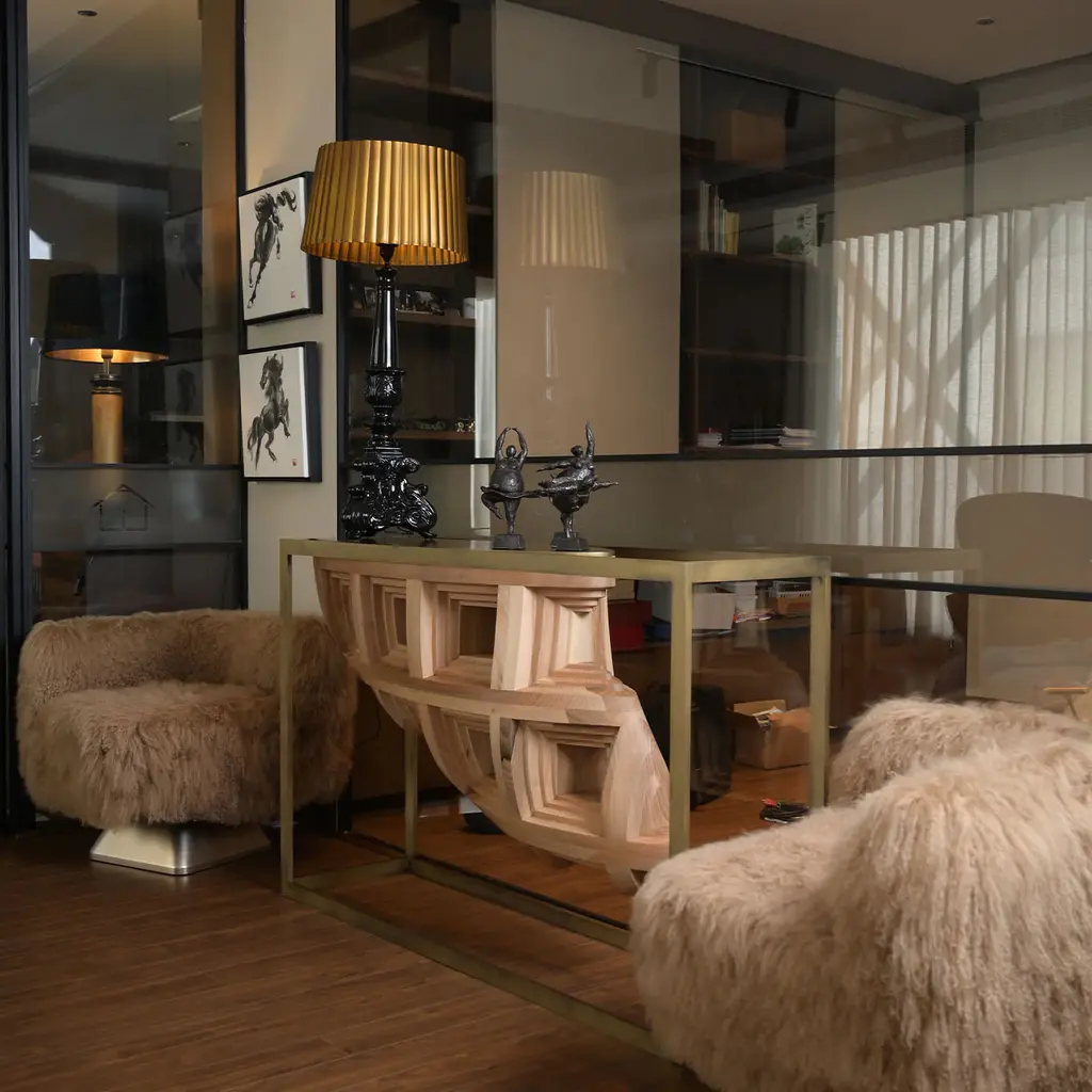 The Rebus console's bronzed metal frame exudes geometric elegance, cradling a wooden, organically shaped fragment. Inspired by the Pantheon's dome, the solid walnut piece, intricately etched with coffered details, creates a visually mesmerizing, gracefully perforated structure.