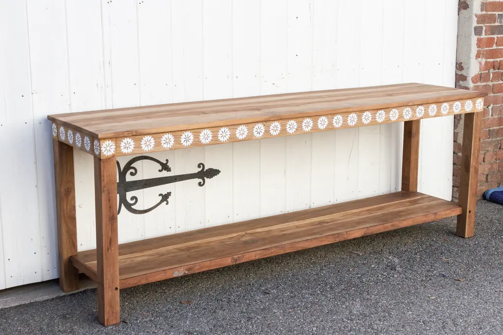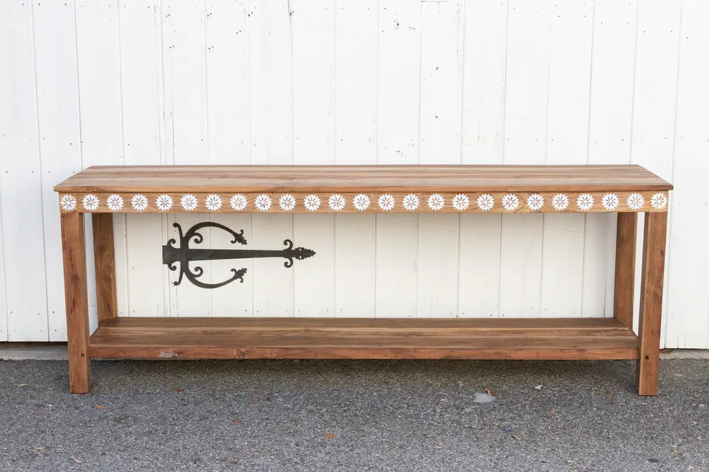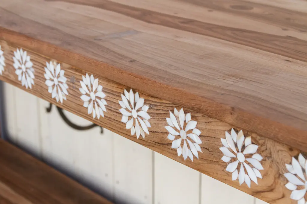 A charming console table with thick square legs and a lower shelf. Made from reclaimed teak, this large reconstructed table has natural reclaimed teak finish with a beautiful inlay work in a floral motif. This table features blossom inlay designs across all the apron on all sides of the table. This table has four square legs and lower shelf. Our blossom mother of pearl inlay collection is inspired by the opening of a lotus flower which is a symbol of purity and enlightenment.