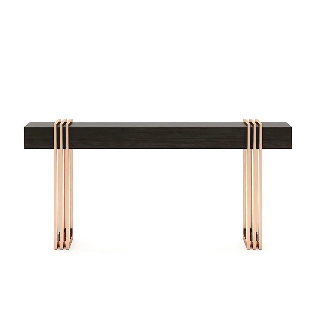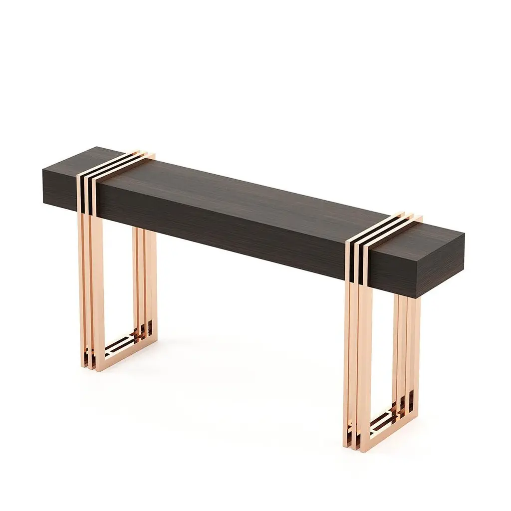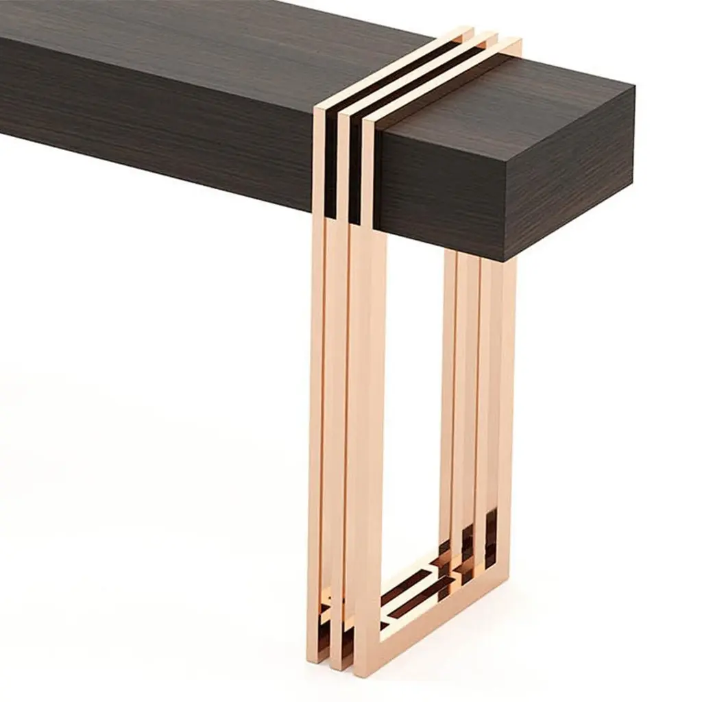 Console table reed with solid matte eucalyptus woodveneered top in smocked matte finish and with polished stainless steel base in copper finish.Also available on request with other stainless steel finishesand with other wood finishes.