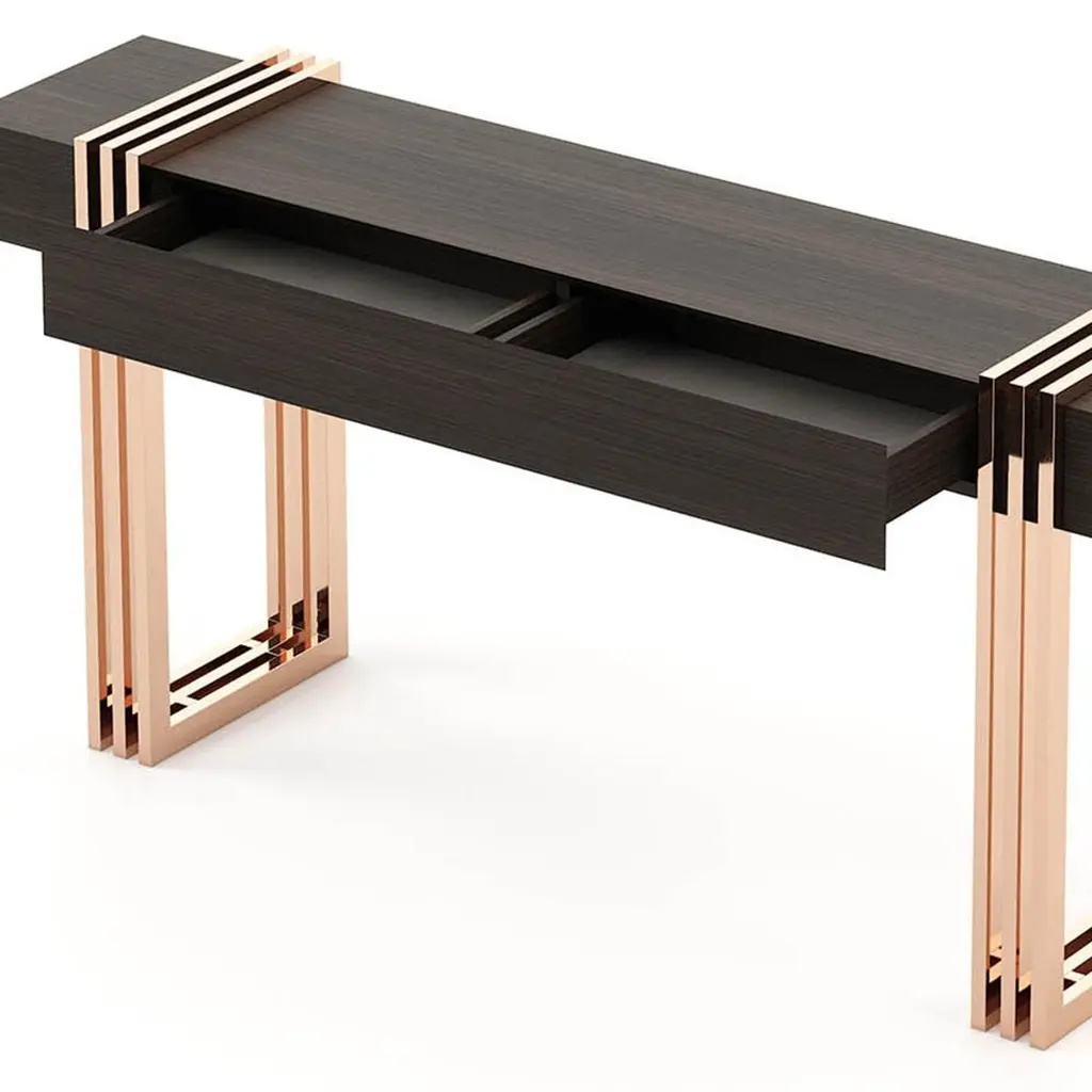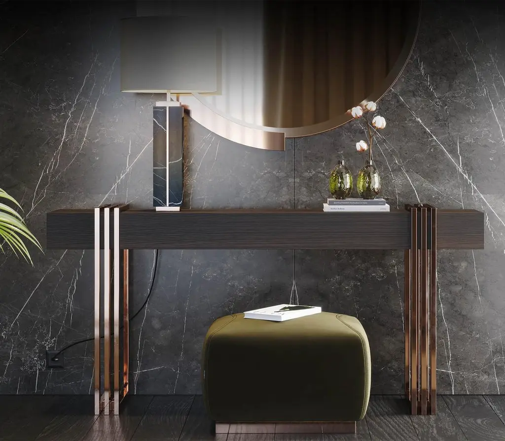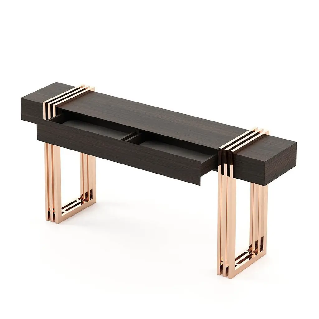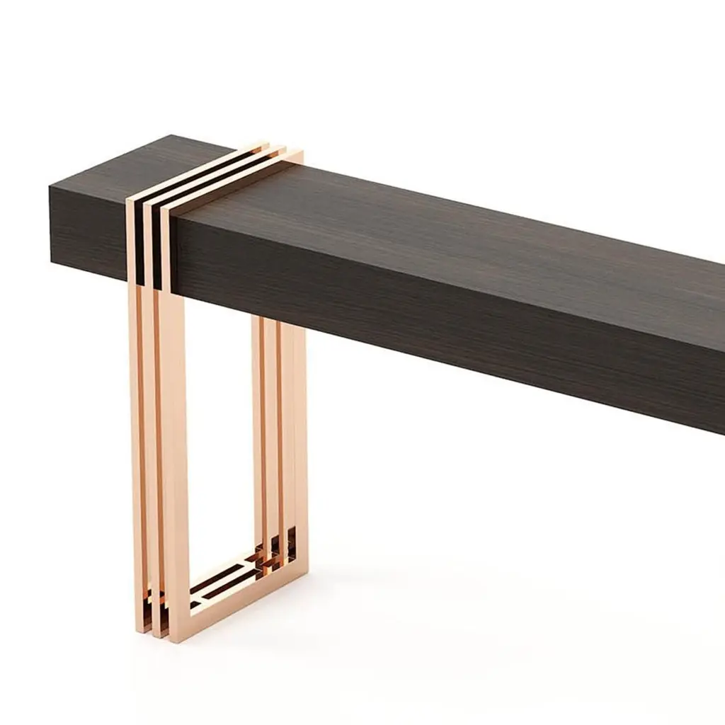 Console table reed with solid matte eucalyptus woodveneered top in smocked matte finish and with polished stainless steel base in copper finish.Also available on request with other stainless steel finishesand with other wood finishes.