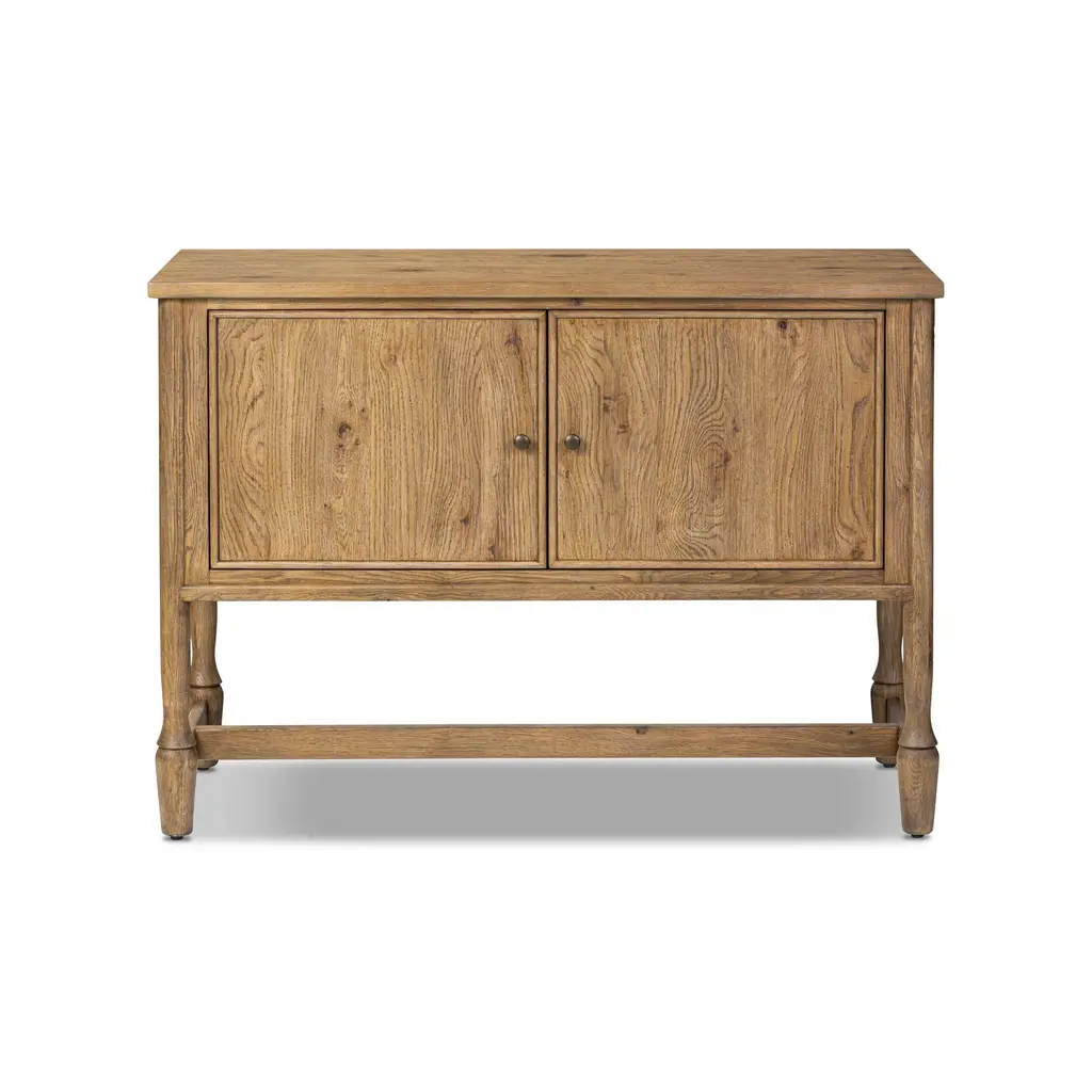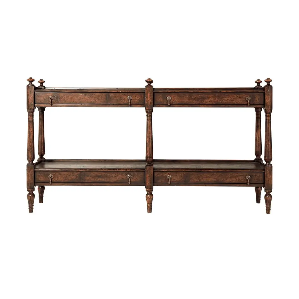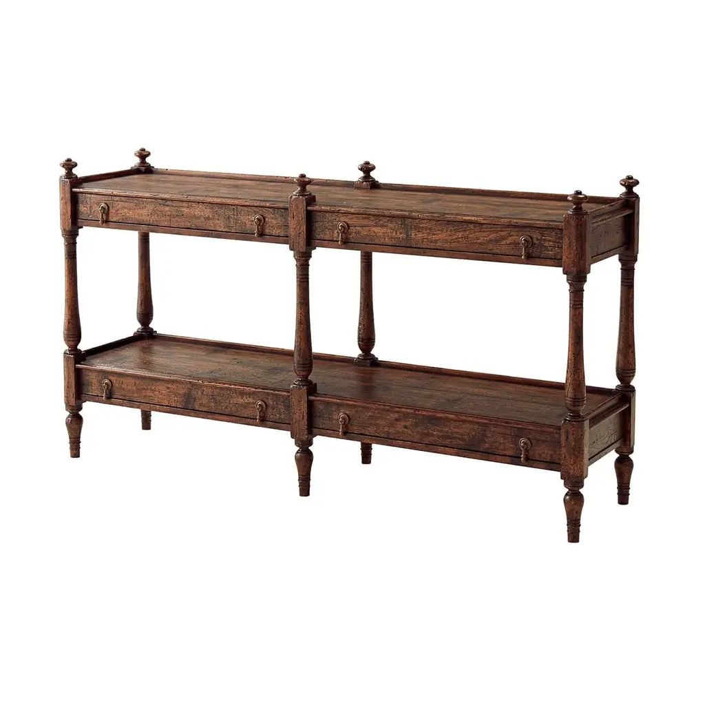 An English Regency style mahogany and reclaimed oak veneered console table restored with pollard oak, the rectangular three quarter gallery top with six turned finials atop each turned leg, with two frieze drawers and a similar under tier below, on turned legs. Dimensions: 64" W x 16" D x 35.25" H