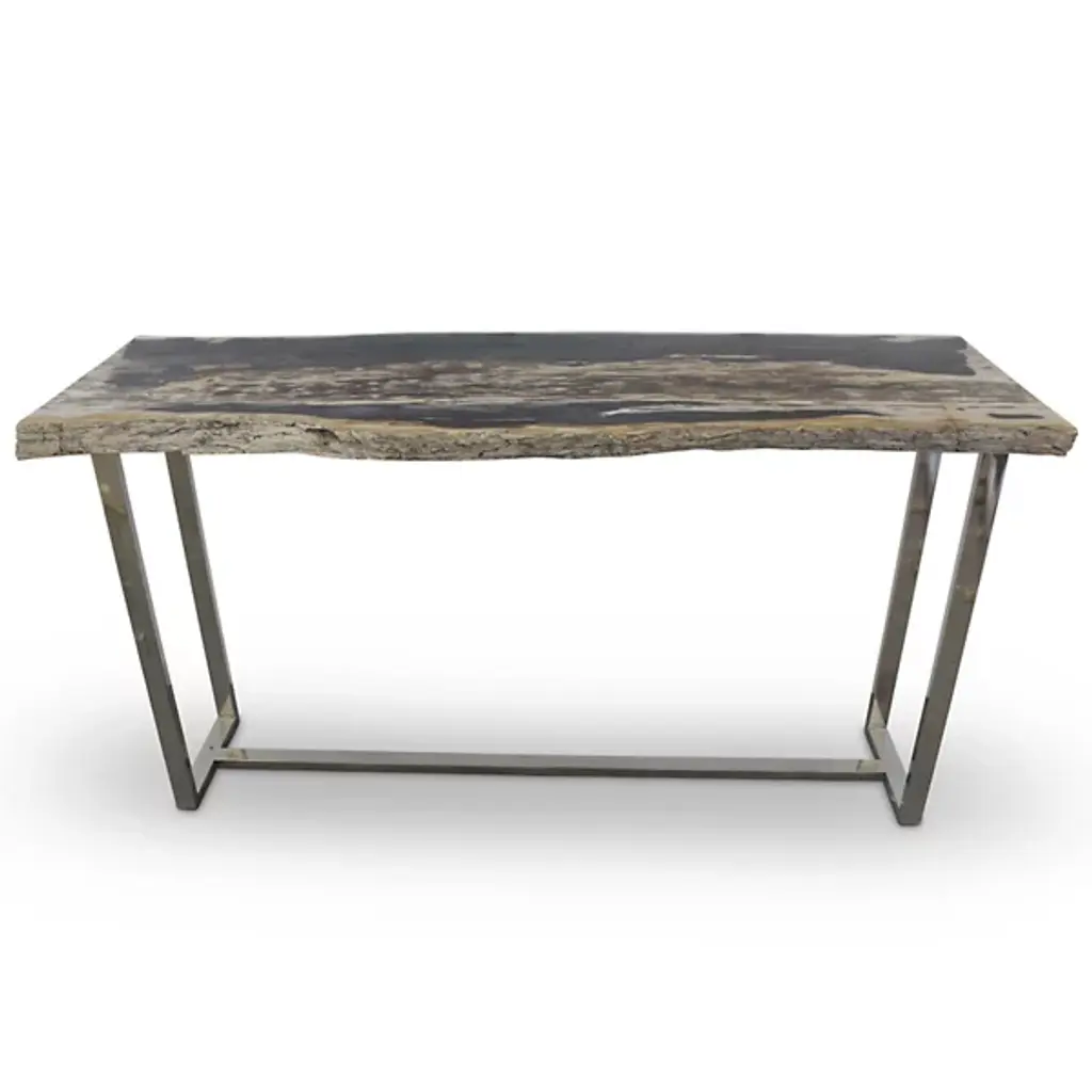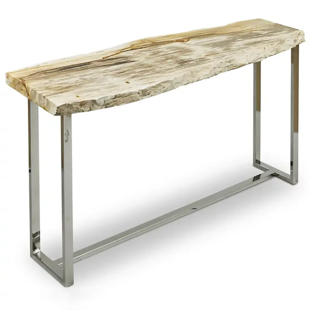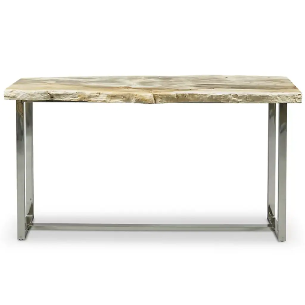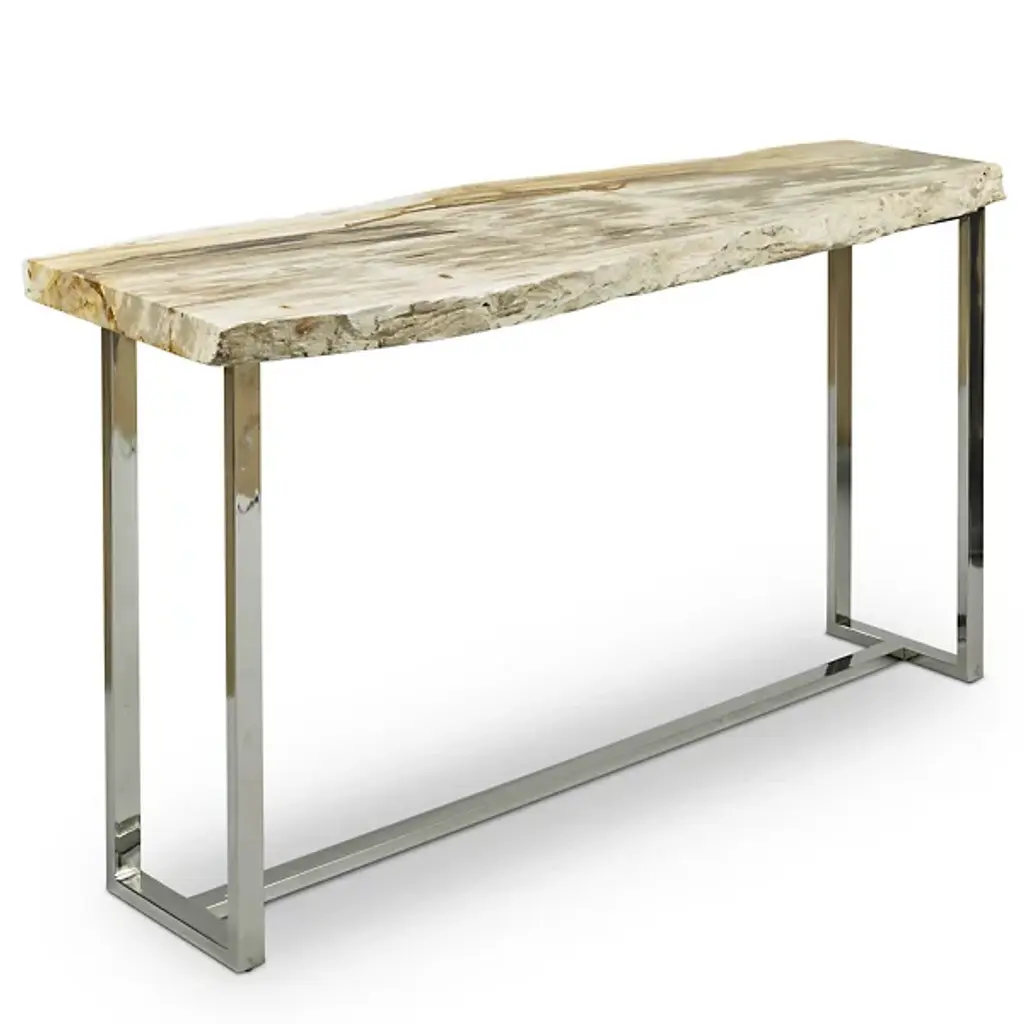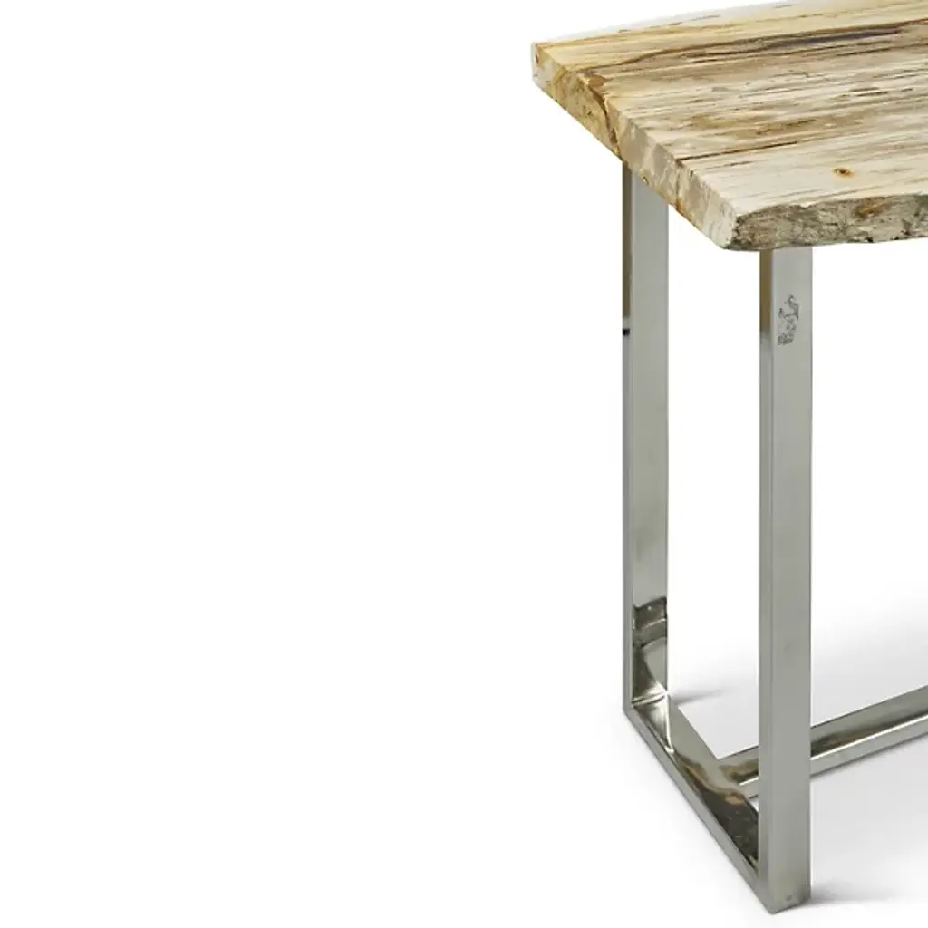 Bring a touch of modern sophistication into your living space with the Relique Raw Console Table by Urbia. Fashioned from solid natural edge petrified wood slice and skilled craftsmanship, each table showcases a unique appeal, making it a one-of-a-kind masterpiece. The polished stainless steel base lends a contemporary edge to the piece. It is an ideal choice for modern and contemporary interiors and can seamlessly blend into your entryway, living room or hallway.