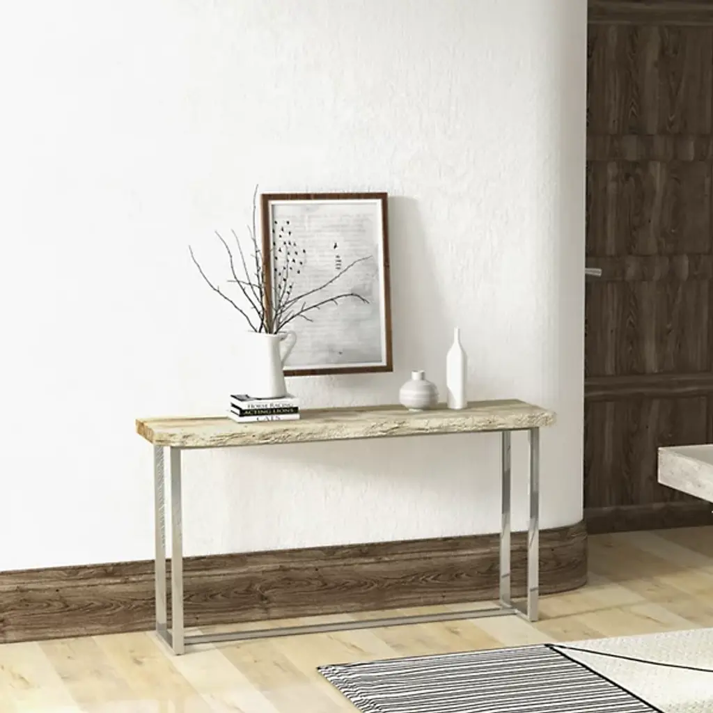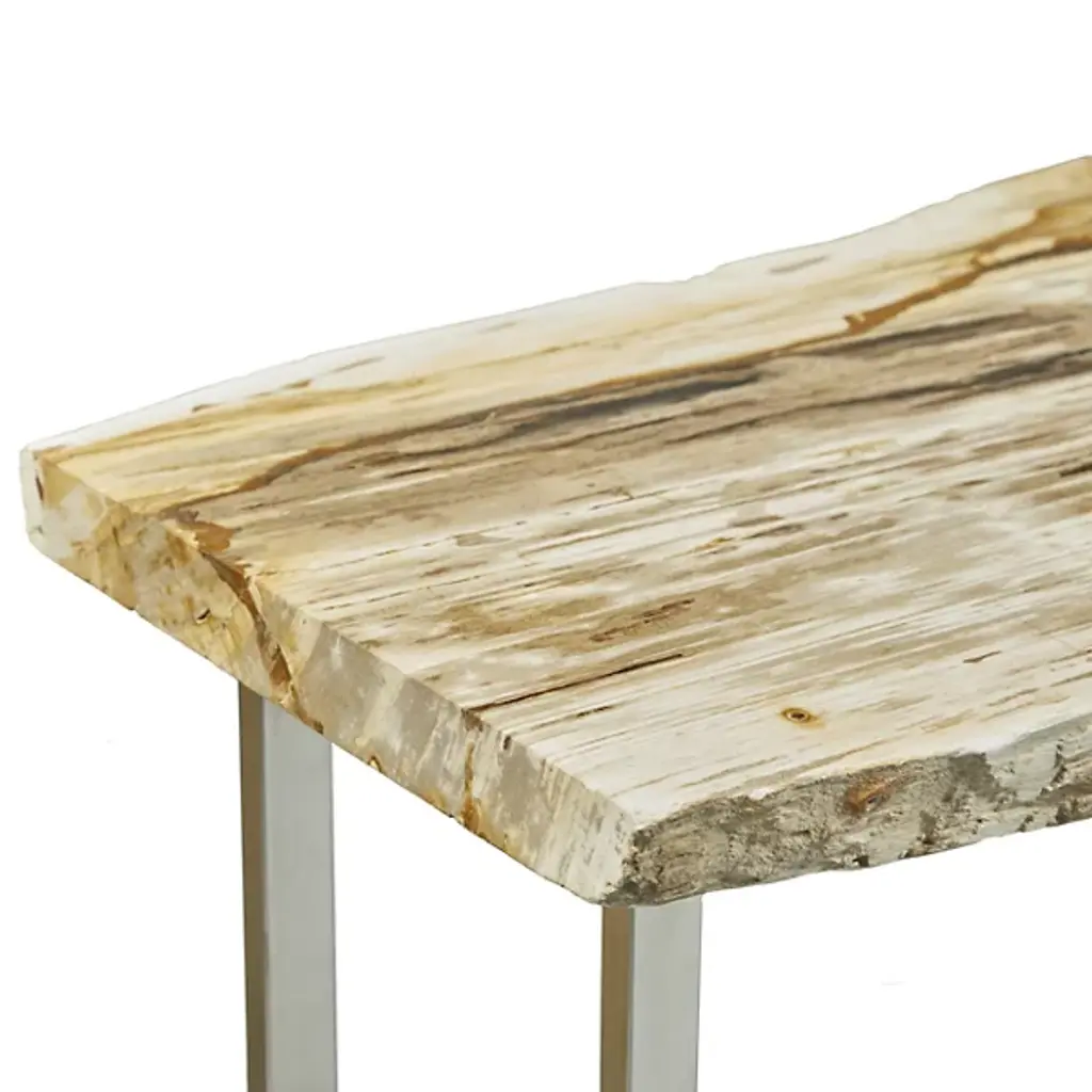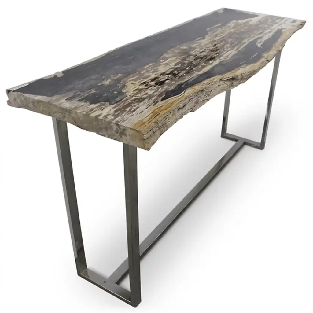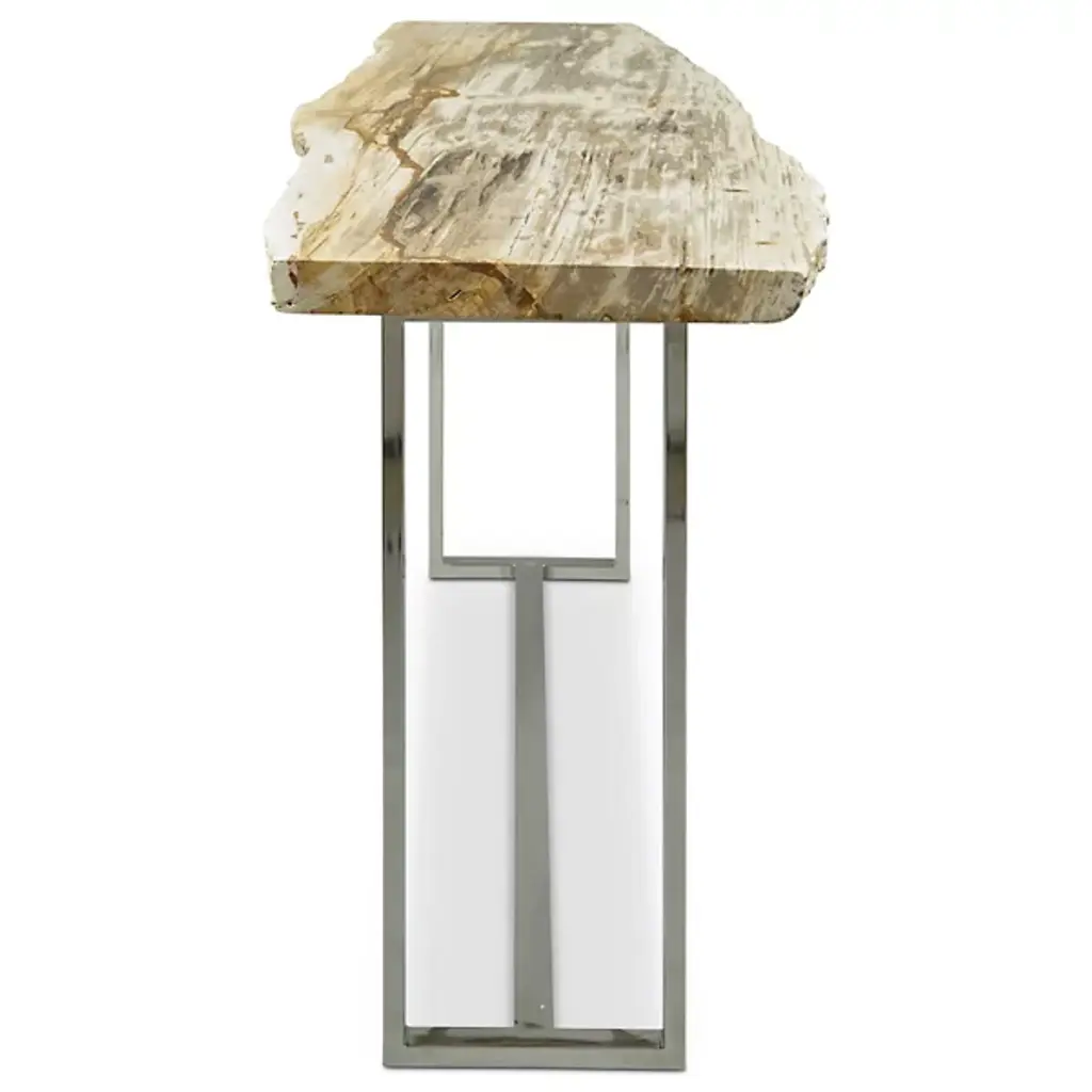 Bring a touch of modern sophistication into your living space with the Relique Raw Console Table by Urbia. Fashioned from solid natural edge petrified wood slice and skilled craftsmanship, each table showcases a unique appeal, making it a one-of-a-kind masterpiece. The polished stainless steel base lends a contemporary edge to the piece. It is an ideal choice for modern and contemporary interiors and can seamlessly blend into your entryway, living room or hallway.