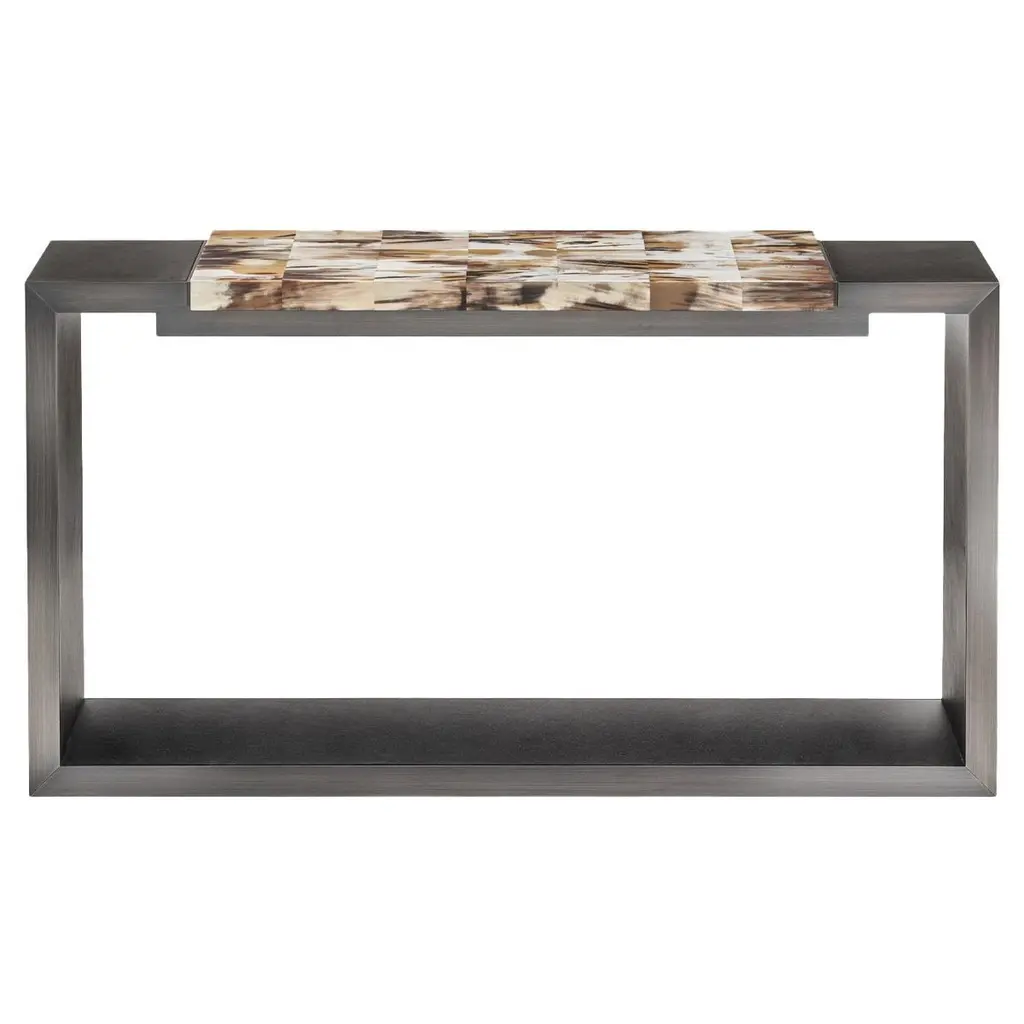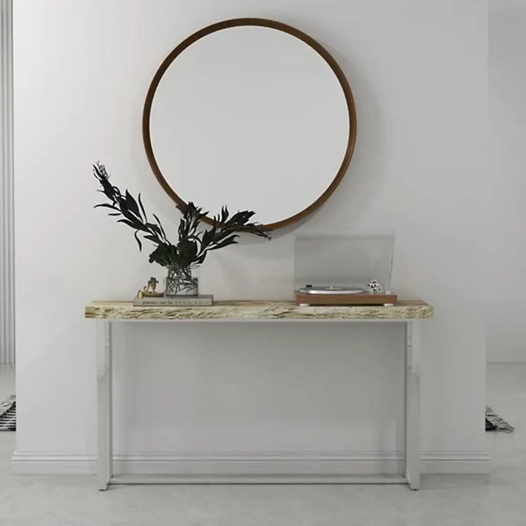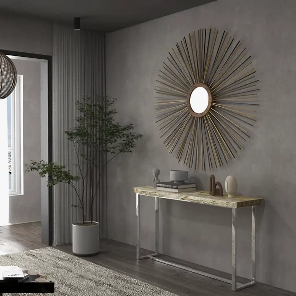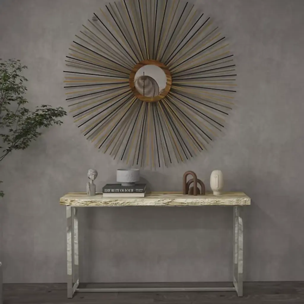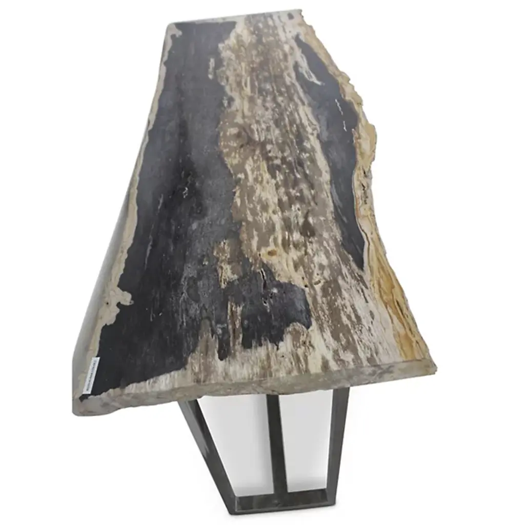 Bring a touch of modern sophistication into your living space with the Relique Raw Console Table by Urbia. Fashioned from solid natural edge petrified wood slice and skilled craftsmanship, each table showcases a unique appeal, making it a one-of-a-kind masterpiece. The polished stainless steel base lends a contemporary edge to the piece. It is an ideal choice for modern and contemporary interiors and can seamlessly blend into your entryway, living room or hallway.