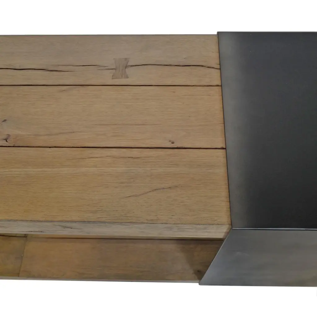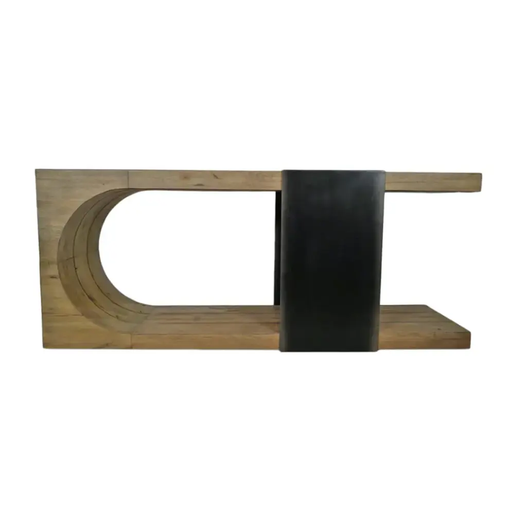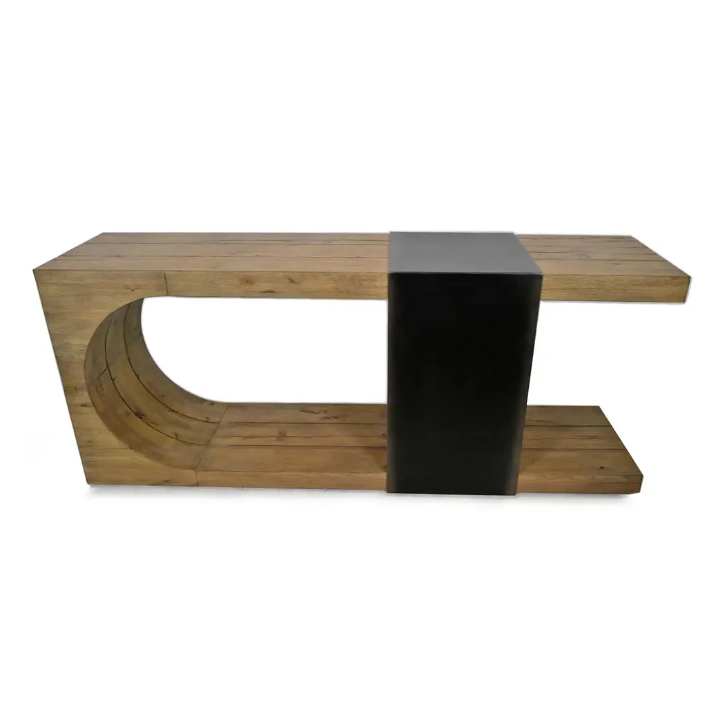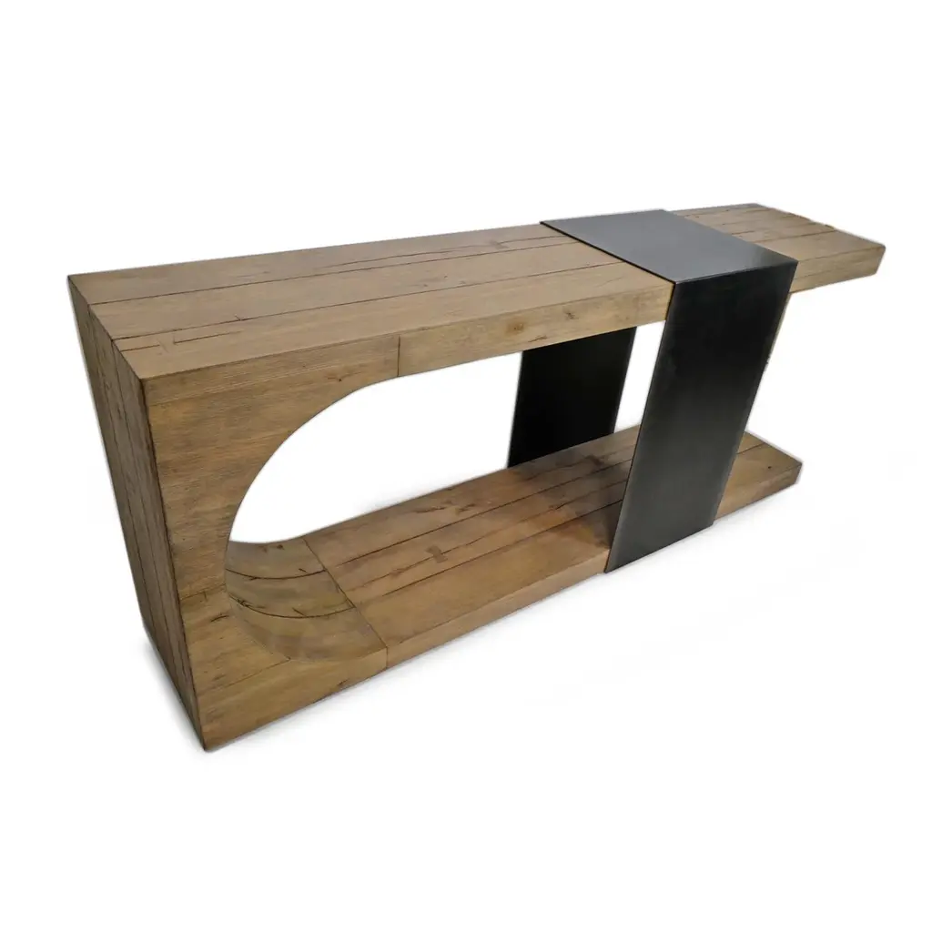 Striking U shaped solid reclaimed oak wood console table with steel tie wrap. Minimalist retro style with unique attractive design. Blackened worn steel wrap with raw oak wood. Each table will have variations in exact wood tones, grain, and natural imperfections. Weight is approx. 200 lbs.