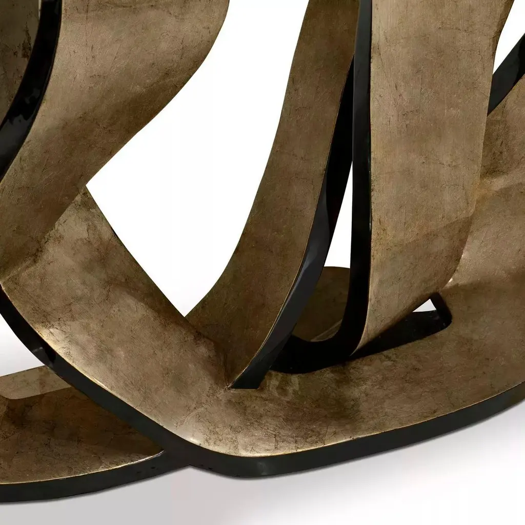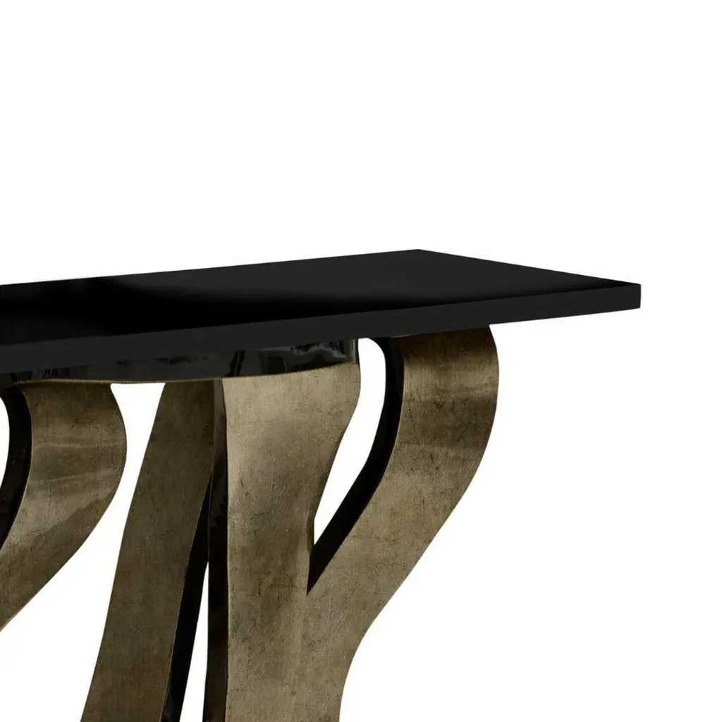 Get wrapped up in the rhythmic design of the Ribbon console table. The provocative twists and turns of the base are delicately adorned in gleaming metallic leaf, mimicking the sheen of a girl's hair ribbon. The luxury console table's playful base is topped with a pristine high gloss black lacquer top.Materials & Finishes:Top: Black Lacquer (High Gloss Finish)Base: Broken Silver Leaf (High Gloss Finish) and Black Lacquer (High Gloss Finish)Clean & Care:Maintain wood, lacquer and mother of pearl by not placing near heaters and air conditioning units to prevent over-drying or exposure to excessive moisture. Avoid extreme humidity changes in your home, as extremely dry air can cause wood to crack and lacquer to lift. Do not place/leave hot or moist objects directly on the wood. Rubber or plastic left on the wood finish can also damage the finish. Clean by using a dry or slightly damp soft cloth. Follow by polishing with a dry soft cloth. Do not use commercial, heavy-duty polishes or waxes, as they can yellow light finishes. We recommend that stained or soiled wood, lacquer or mother of pearl pieces be professionally cleaned or refinished.
