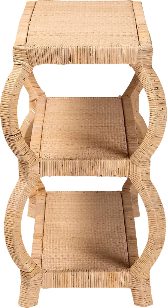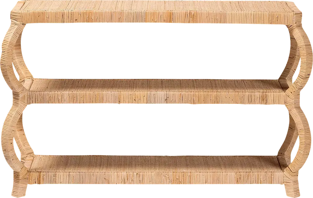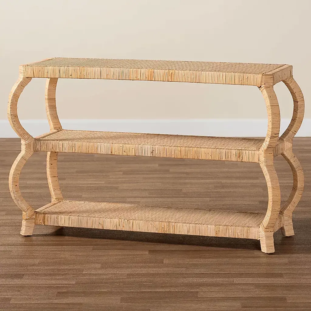 Exuberant rustic design arrives in the remarkable form of the Ridgefly light brown console table. This bohemian piece consists of a solid mahogany wood frame wrapped in natural rattan. Three tiers of open shelves offer ample space to organize and display a variety of decorations, uplifting any living room, entryway, or other open layout. The Ridgefly will arrive fully assembled and features unique rounded legs that stand out with an aura of exotic artistry while providing excellent stability. Rattan is a product of nature and may have variations in areas such as, but not limited to, color, pattern, grain and texture. The hair-like strands of rattan/rattan-fiber are common due to the nature of the material.