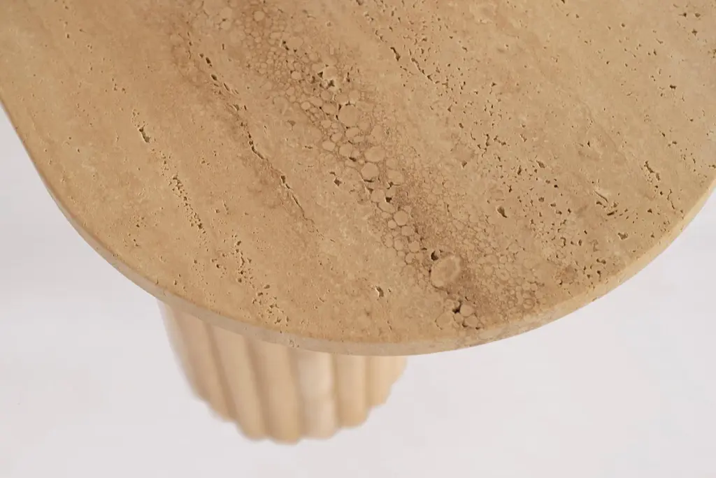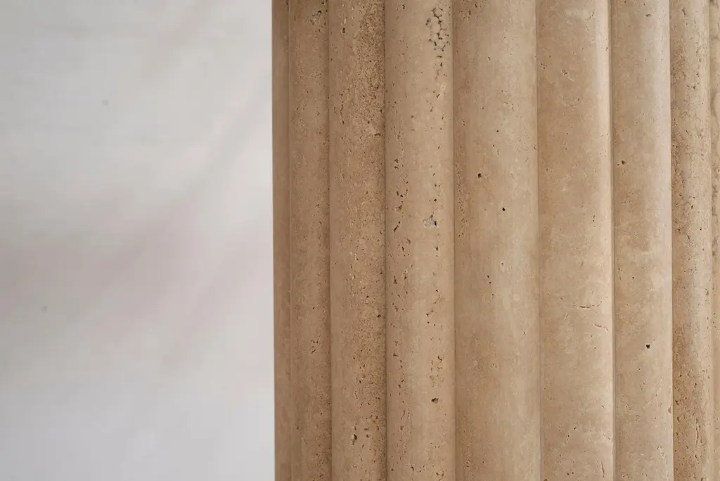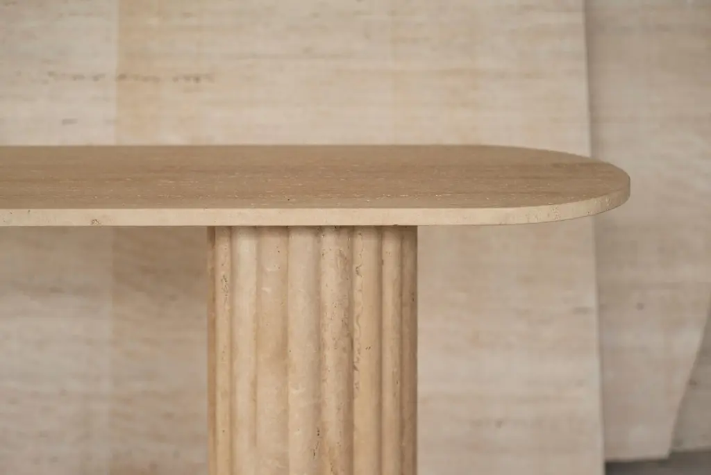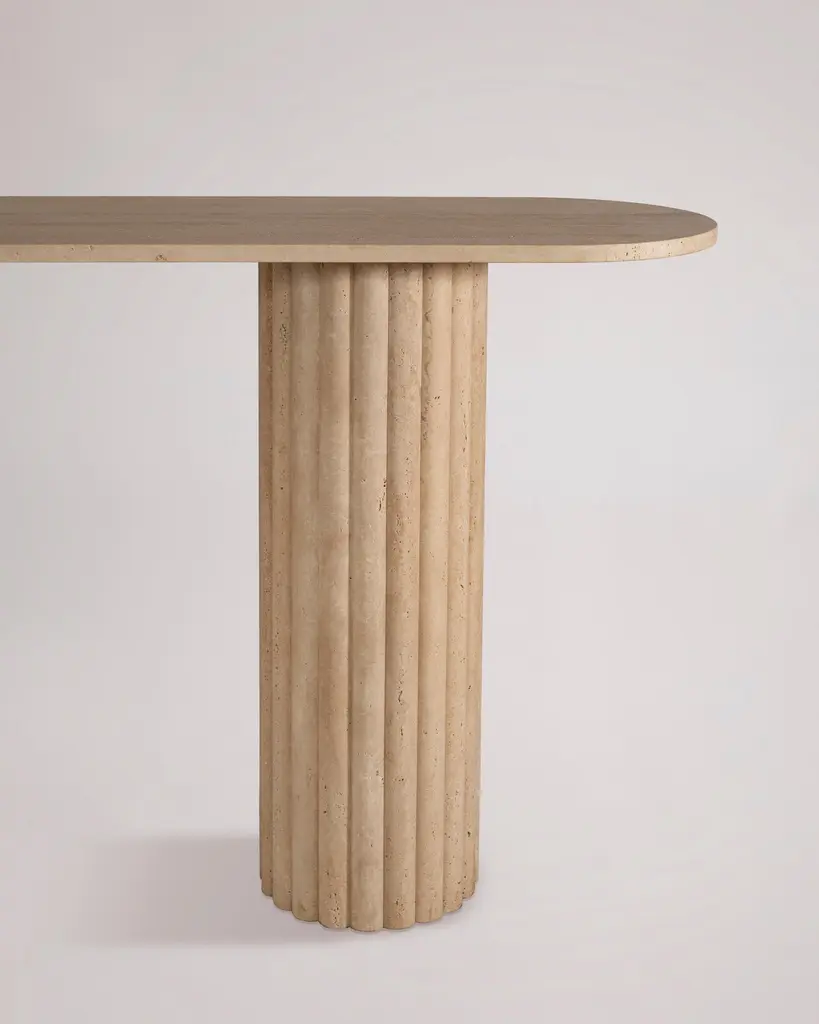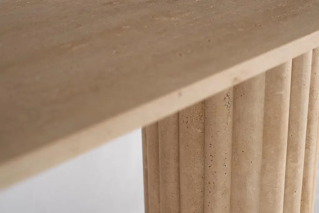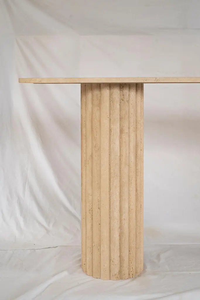 Introducing our Rima credenza's new look- classic and traditional lines graced with the strength and elegance of marble. Combining the cadence of the turned rod texture base and the luscious feel of the surface created by the porous travertine marble. Rima: a flawless piece full of lyrical expression that will provide a creative solution to any space.Material: Travertine Marble.