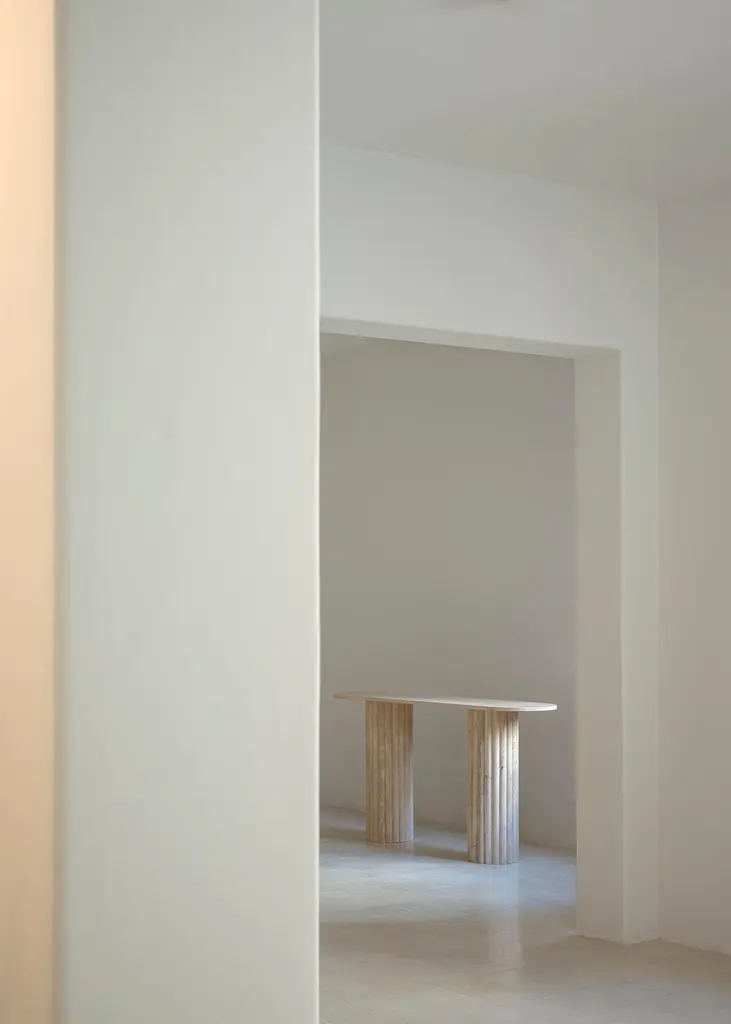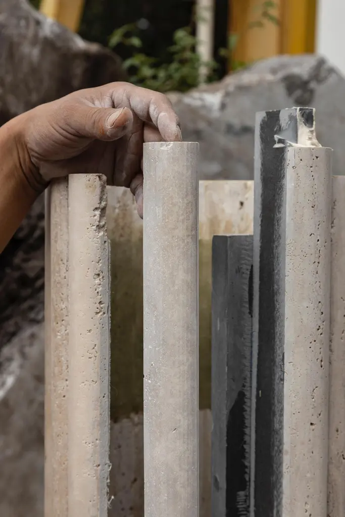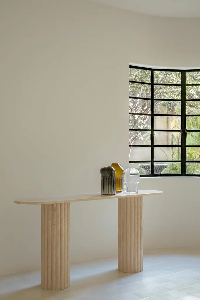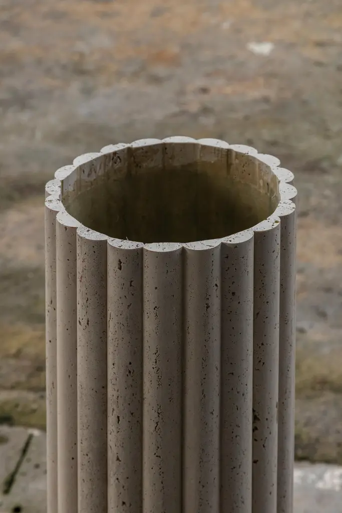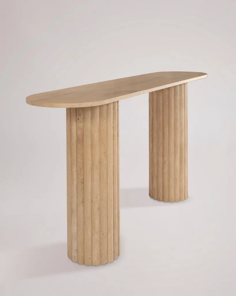 Introducing our Rima credenza's new look- classic and traditional lines graced with the strength and elegance of marble. Combining the cadence of the turned rod texture base and the luscious feel of the surface created by the porous travertine marble. Rima: a flawless piece full of lyrical expression that will provide a creative solution to any space.Material: Travertine Marble.