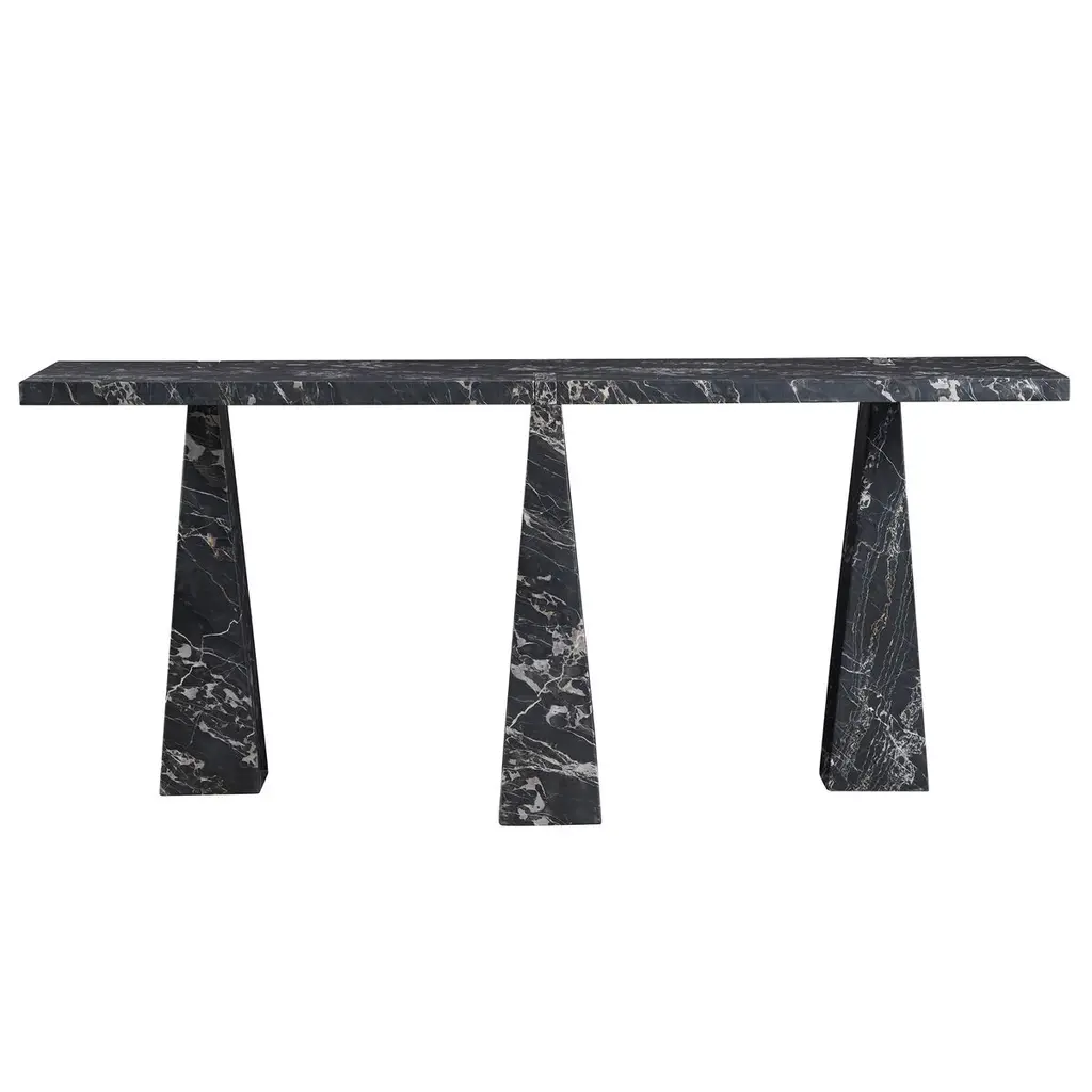 The Rivenna Sofa Console Table is a masterpiece of drama and depth, sculpted entirely from marble, characterized by its rich, moody tones and striking veining. Its legs, architectural and sculptural in form, draw inspiration from triangular shapes, adding a layer of intrigue and sophistication to this captivating piece.