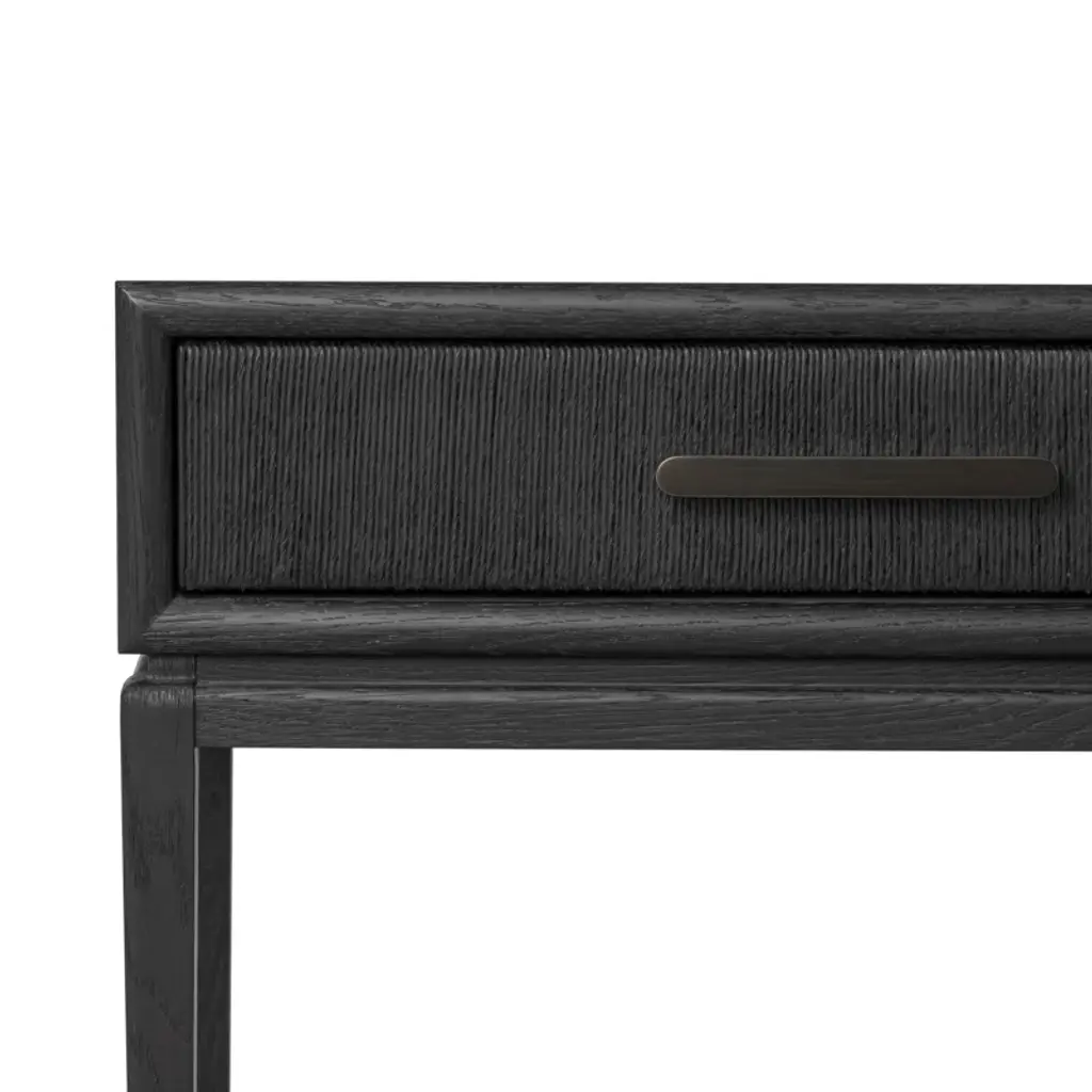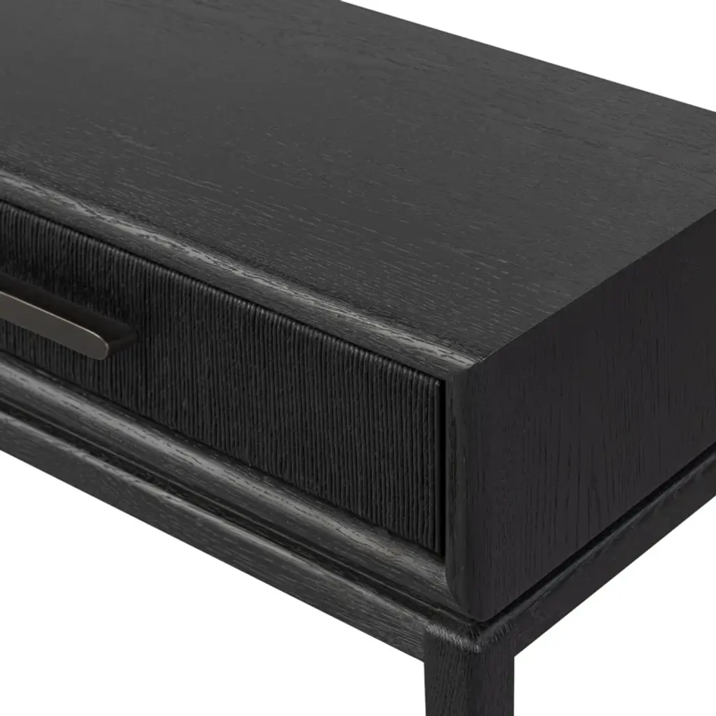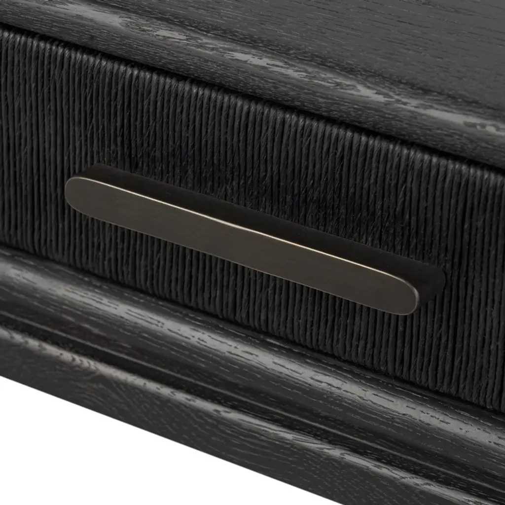 Elevate your living space or media room with an oak slim-profile console. A smooth top pairs with three drawers covered with woven paper cord, while lower open shelving creates bonus storage and display options. The result: a dark, Scandinavian-inspired look that will work into your collection beautifully.