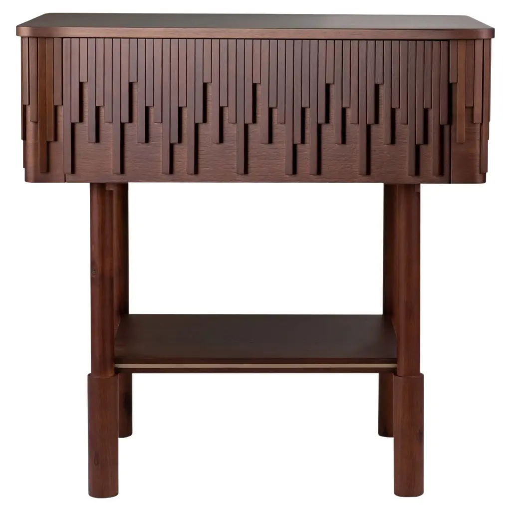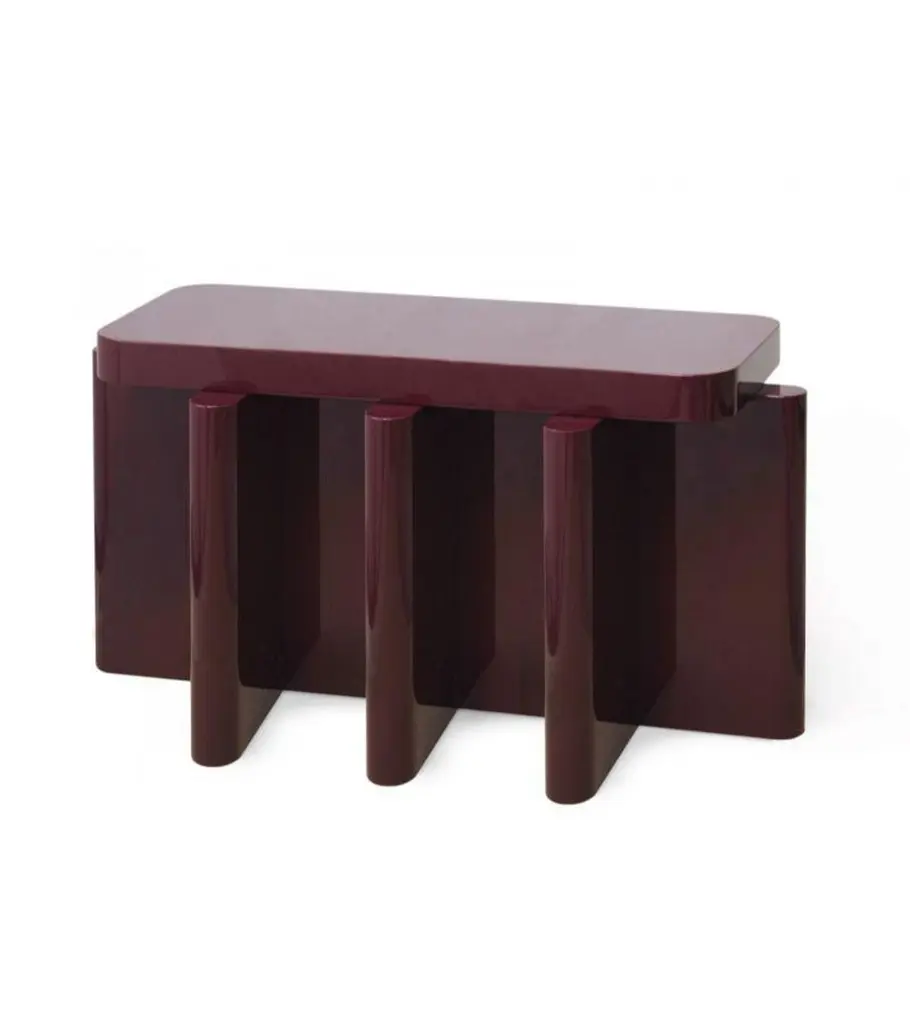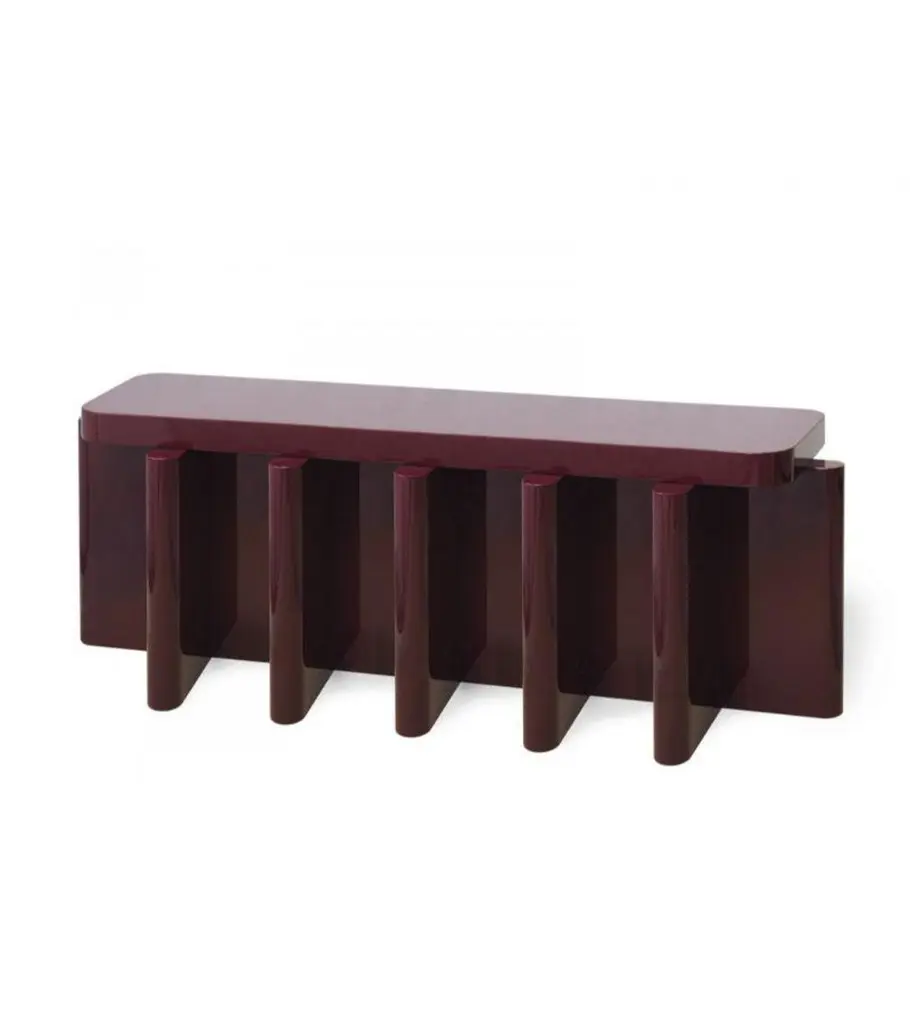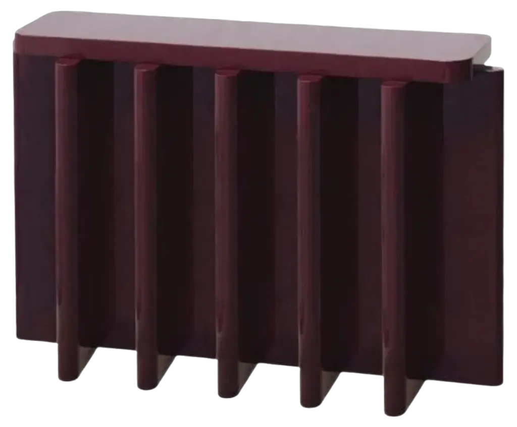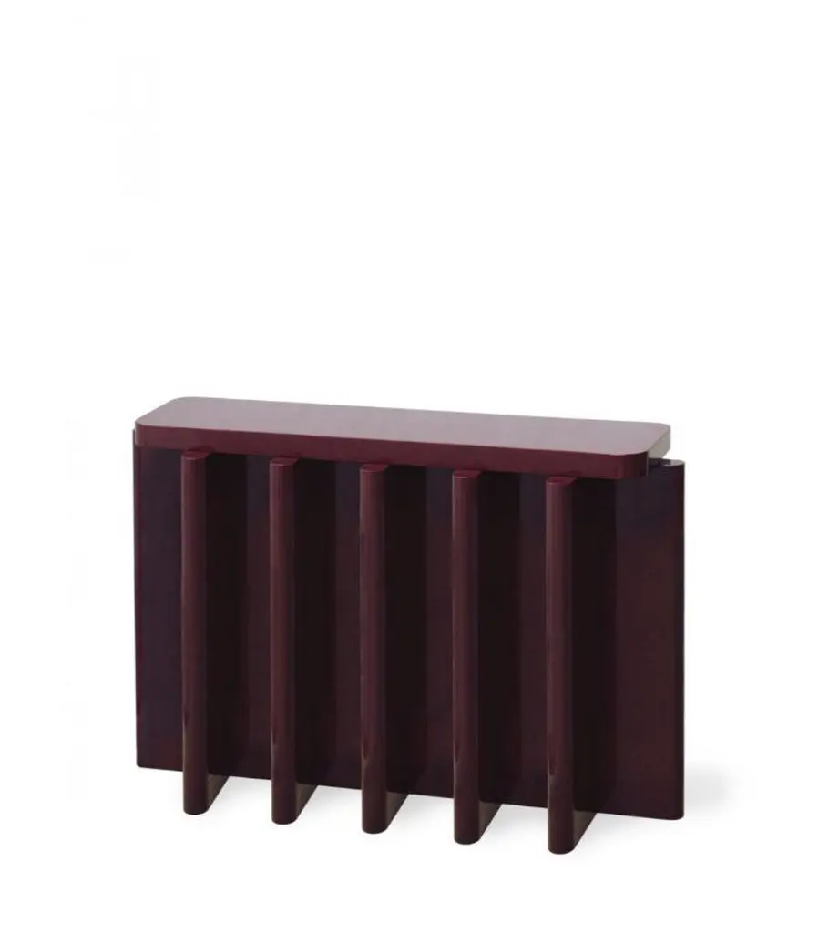 Rustic Bordeaux Red Solid Wood Spina C5.1 Wooden Console Table by Cara DavideDimensions: D 130 x W 35 x H 80 cm Materials: Solid Nut wood, Lacquered MDF. Also available in colors: Bordeaux, Caramel, dusty red, off-white, and natural wood.Both size and color can be customized on request.Spina is a collection of lacquered tables and seatings. The lacquered surfaces and consistent rhythm of the planes create a visual play of light, shadow, and reflection, adding depth and richness to this already visually graphic collection. The elements of the line are characterized by a dense skeletal base that supports a smaller horizontal plane along its axis.The thicknesses and proportions of the intersecting vertical planes visually saturate the space underneath its top, creating heaviness as if they were the pedestal for the horizontal plane. There is a visual hierarchy from the heavy plinth to the offset top plane and then to what gets displayed upon its surface.The notion of stacked objects and planes makes it a sort of altar with a totemic and primitive depiction.The collection is now composed of 4 elements in 4 lacquered gloss finishing colors. Both size and color can be customized on request. Completely locally made by expert masters, in Veneto, Italy. Design studio based in Milan, is a collaboration between Cara Judd (South Africa) and Davide Gramatica (Italy). Graduating in product design from IED Milan, Cara and Davide started their professional careers in diverse areas ranging from apprenticing with artisans to working with industrial companies before merging their experience in 2016. They work in the fields of product design, event curation and offer creative consultancy to studios and private clients. Cara and Davide both lecture in the Product Design Department at IED Milan. Passionate about craftsmanship, they also produce their own series of products working together with artisans in Italy and South Africa.MedulumAn ancient river flowing in the green countryside of the Veneto hinterland, between emerged lands and swamps that have now disappeared. Medulum, one of the favourite waterways of the Venetian aristocracy of old, indispensable for reaching their country homes.This is where our work draws its inspiration. We combine the experience of 40 years with innovative solutions, collaborating with architect and designer studios in the search and experimentation of new languages, through the craftsmanship of artisanal productions.Medulum has been designing and making furniture and accessories by searching for and experimenting with new languages, collaborating with architects and designers, with the craftsmanship typical of artisanal productions.