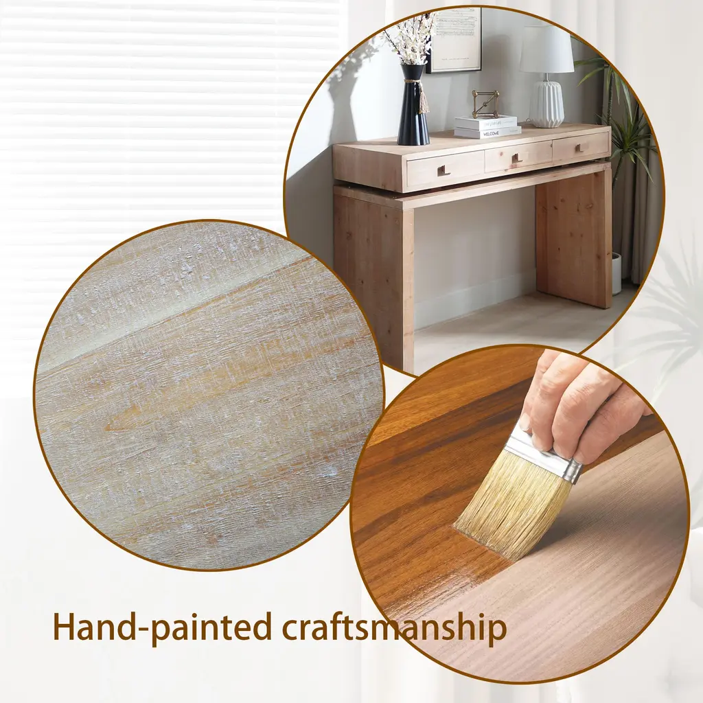 Spacious Storage - Features three drawers with minimalist wooden handles, offering convenient storage for keys, documents, or small essentials. Versatile Design - Ideal as a console table, entryway table, or sofa table, complementing both modern and farmhouse-style interiors. Sturdy Construction - Built with manufactured wood to ensure long-lasting stability and support. Elegant Floating Design - The raised tabletop creates a unique floating effect, adding visual interest and dimension.