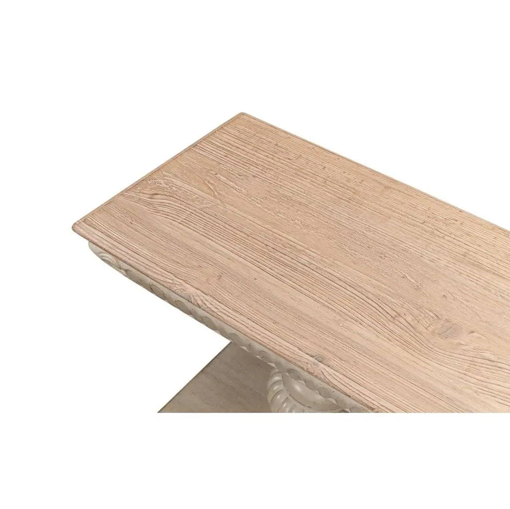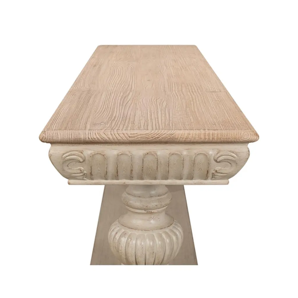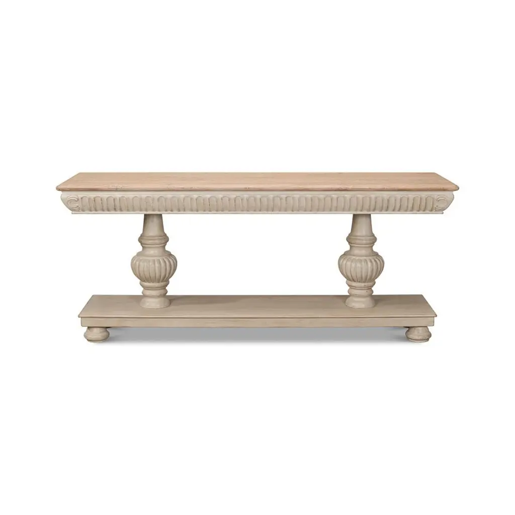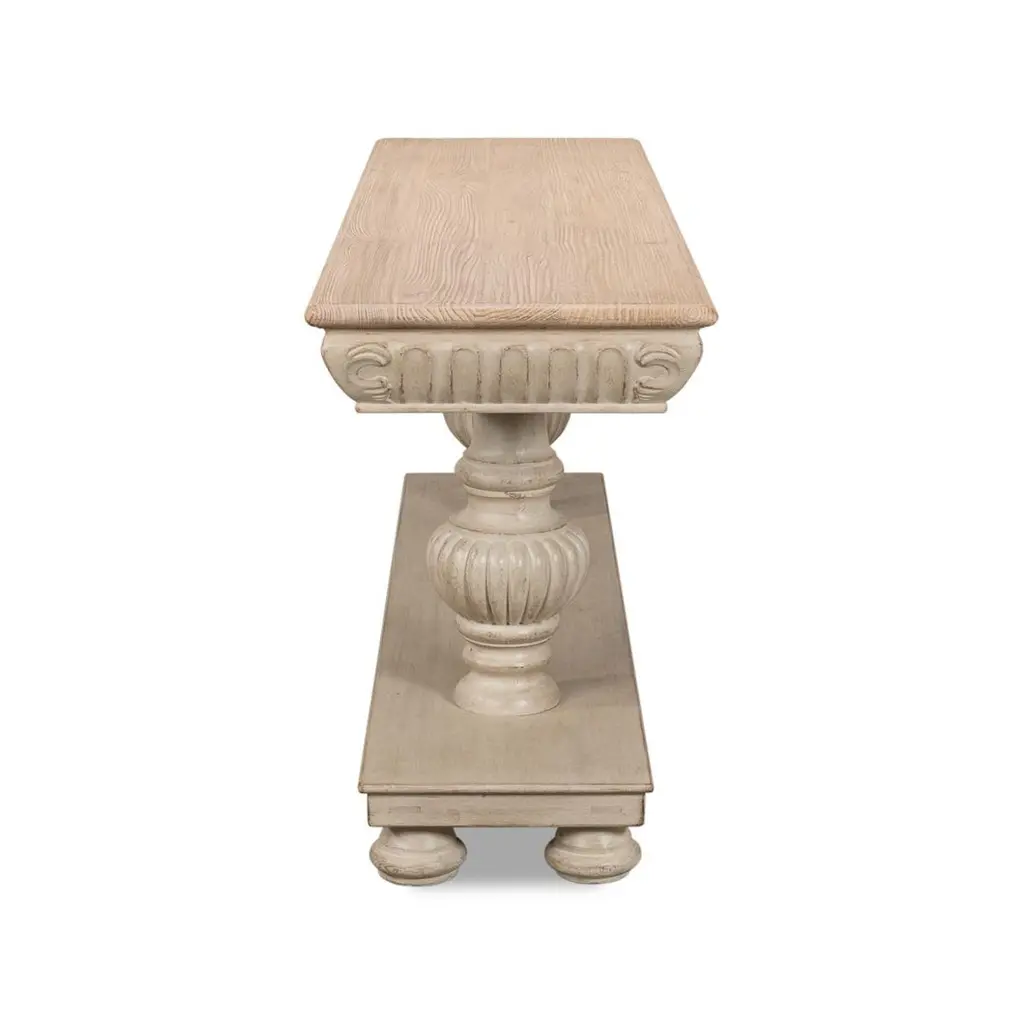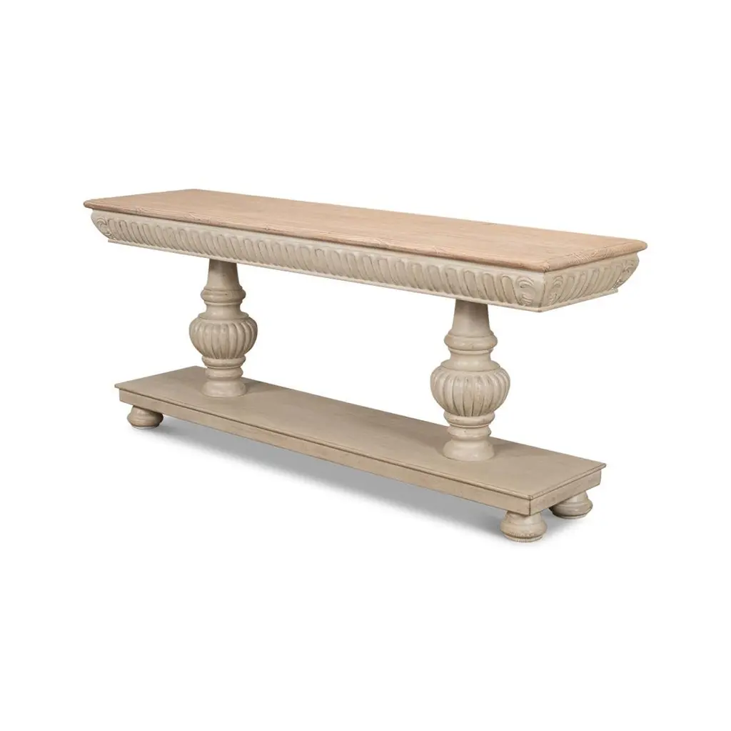 A dramatic transitional pine console, with a natural wooden top above an antiqued stone gray painted base. It features carved volutes around the frieze, atop two carved baluster pedestals. This console table not only serves as a functional surface but also as a delightful decorative accent that complements a modern motif or traditional classic design.Dimensions: 74" W x 20" D x 31" H