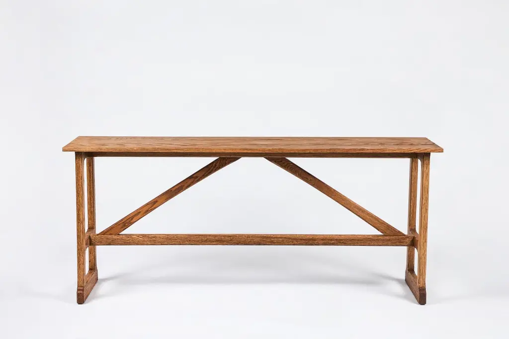 Martin & Brockett's West Large Trestle Console features a modern craftsman style and a rustic sinewy frame with handcarved details. It's shown here in our Ebony finish on Scrubbed Oak.Part of our West Trestle Collection.Each piece is individually crafted; slight variations in color, finish and grain may occur.Lead time: 12-16 weeks.