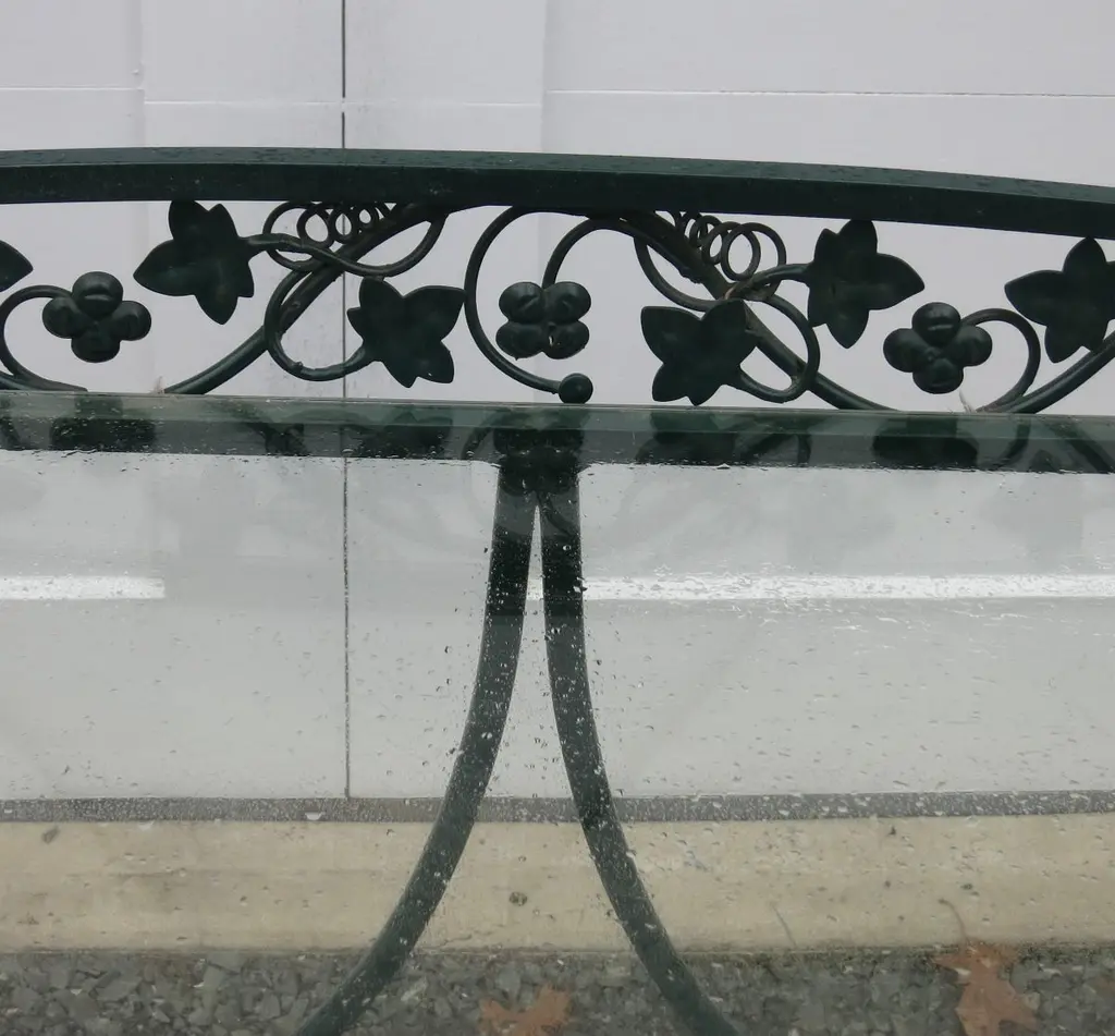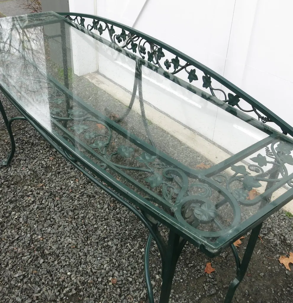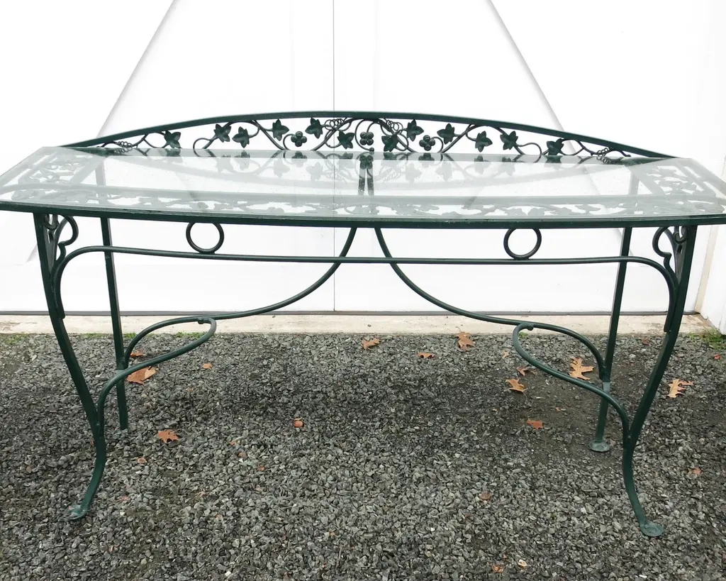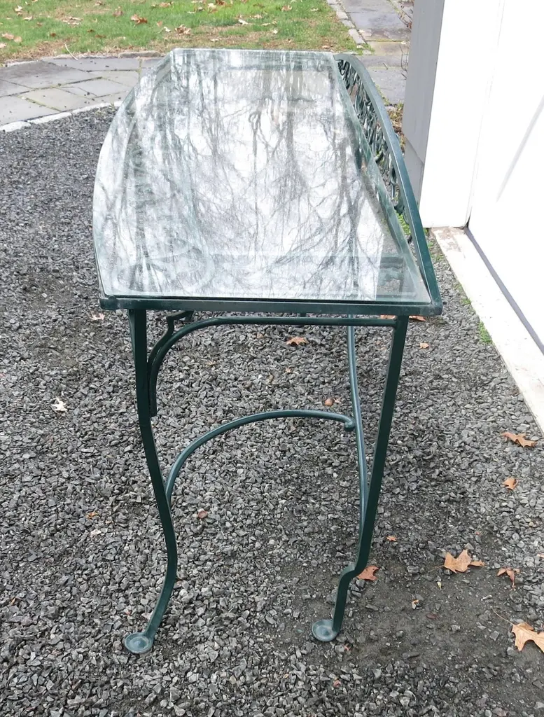 Salterini Park Avenue Console in dark green. Heavy well made piece. The console is 66" wide x 22.5" deep x 36" high. The glass top is 32.5" high. Good condition with some paint loss and normal wear. Glass has normal wear.