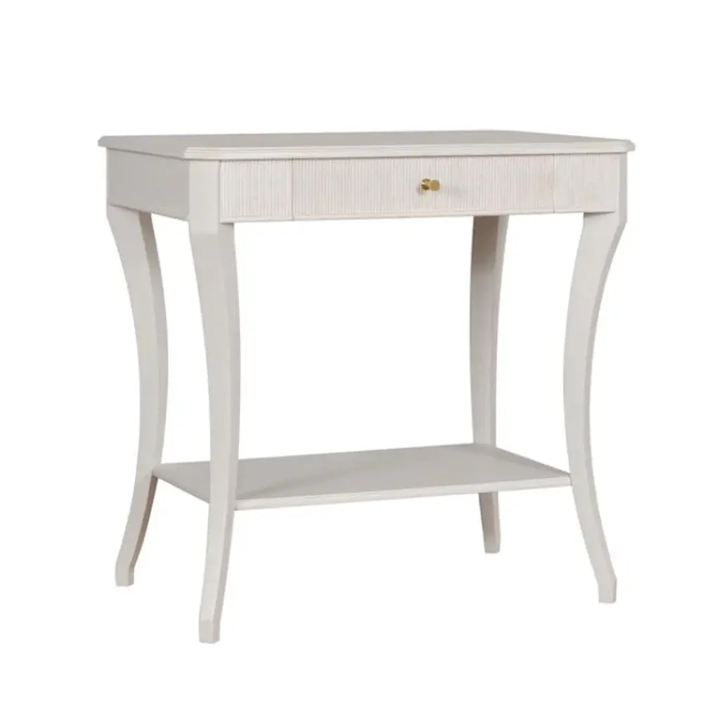 Simple yet sophisticated. This table offers traditional style with its slender concave legs and polished brass hardware. Feature in a living or sitting room. Custom colors available.