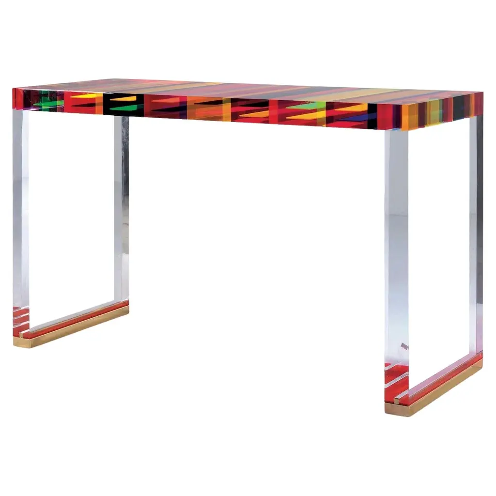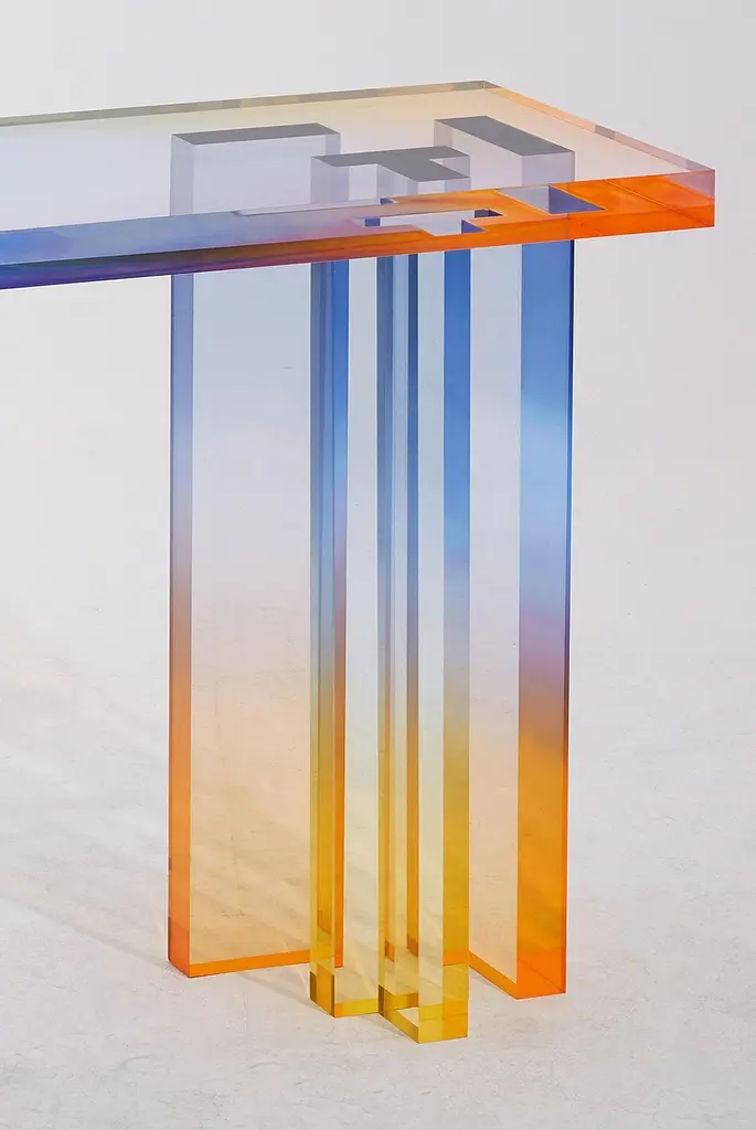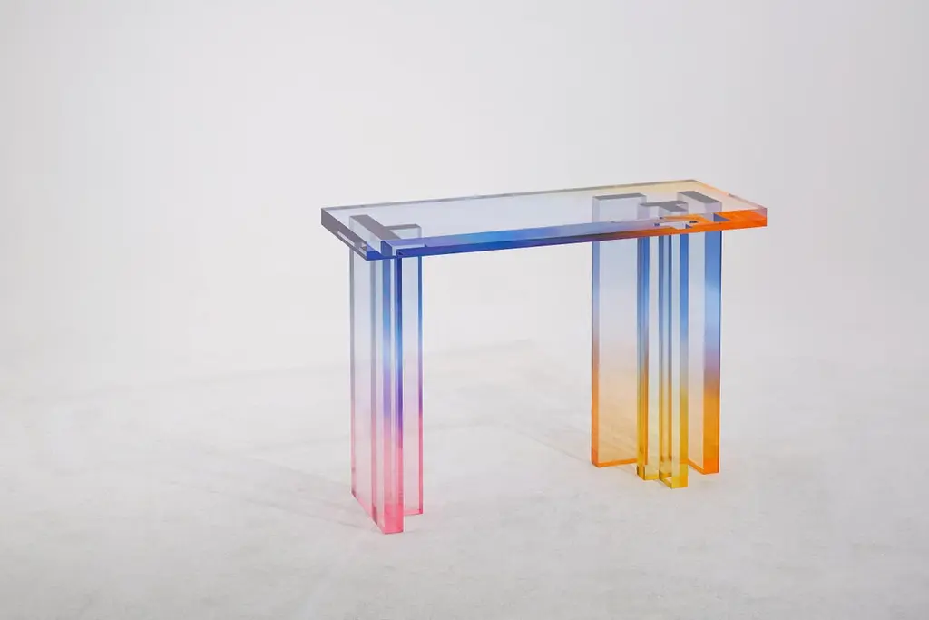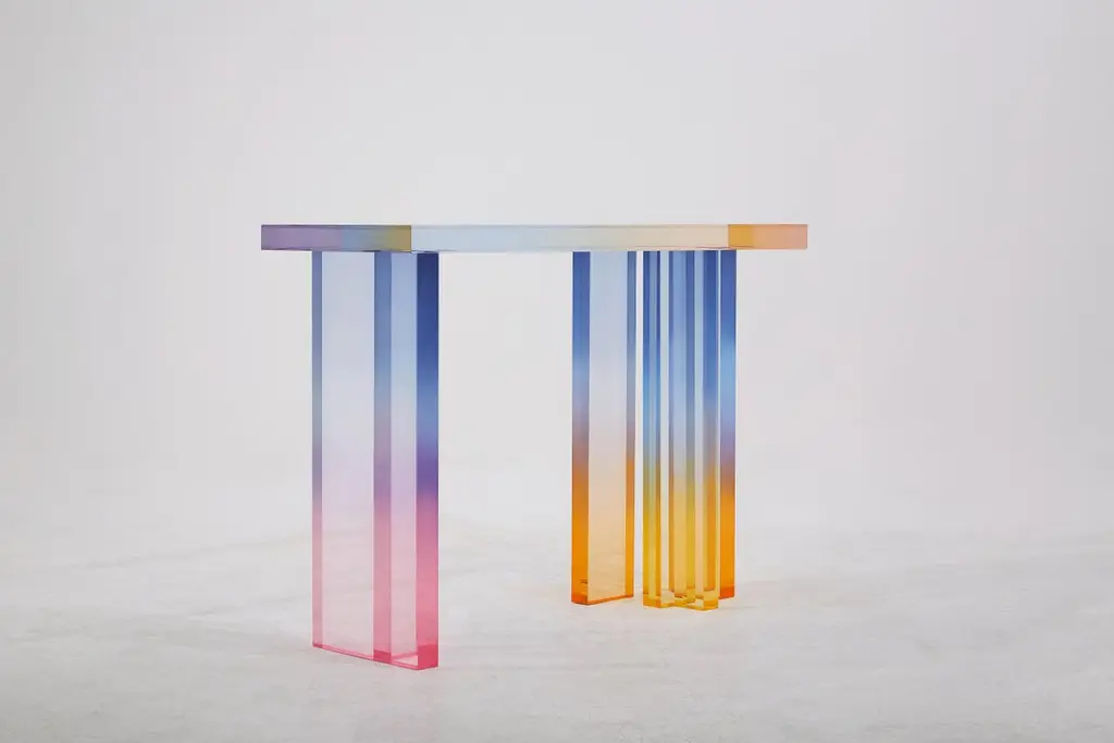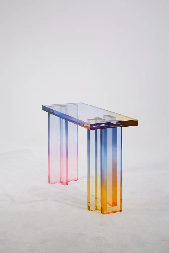 Console Table 01 by Saerom YoonLimited Edition No. 06 of 8 + 2APDimensions: W 110 x D 43 x H 80 cmMaterials: Acrylic.My oldest childhood memories go back to the time I spent in the Philippines with my parents. The green mountains, the emerald green ocean, and every scene of me playing on this small and beautiful island still reside in me. Among them, my favorite was the beach at sunset. The memory of sitting on the beach with my family while feeling the cool breeze as the hot midday sun sets is my most precious memory.This series [ A Piece of One Day ] and [ Crystal Series ] present the fragments of my memories, the emotions of looking at the afterglow on an exceptionally stunning day, and the moments of looking up at the sunlight and the leaves sparkling under the shade of hot summer sun. By sharing this series, I wish to show the perspective of seeing nature as the space and time surrounding us along with my own experiences.I intend to give the audience a strong visual impulse to share these experiences. With these extraordinary visual catalysts, I hope to share my memories with the audience, and the experience imprints in their hearts as a piece of one day.