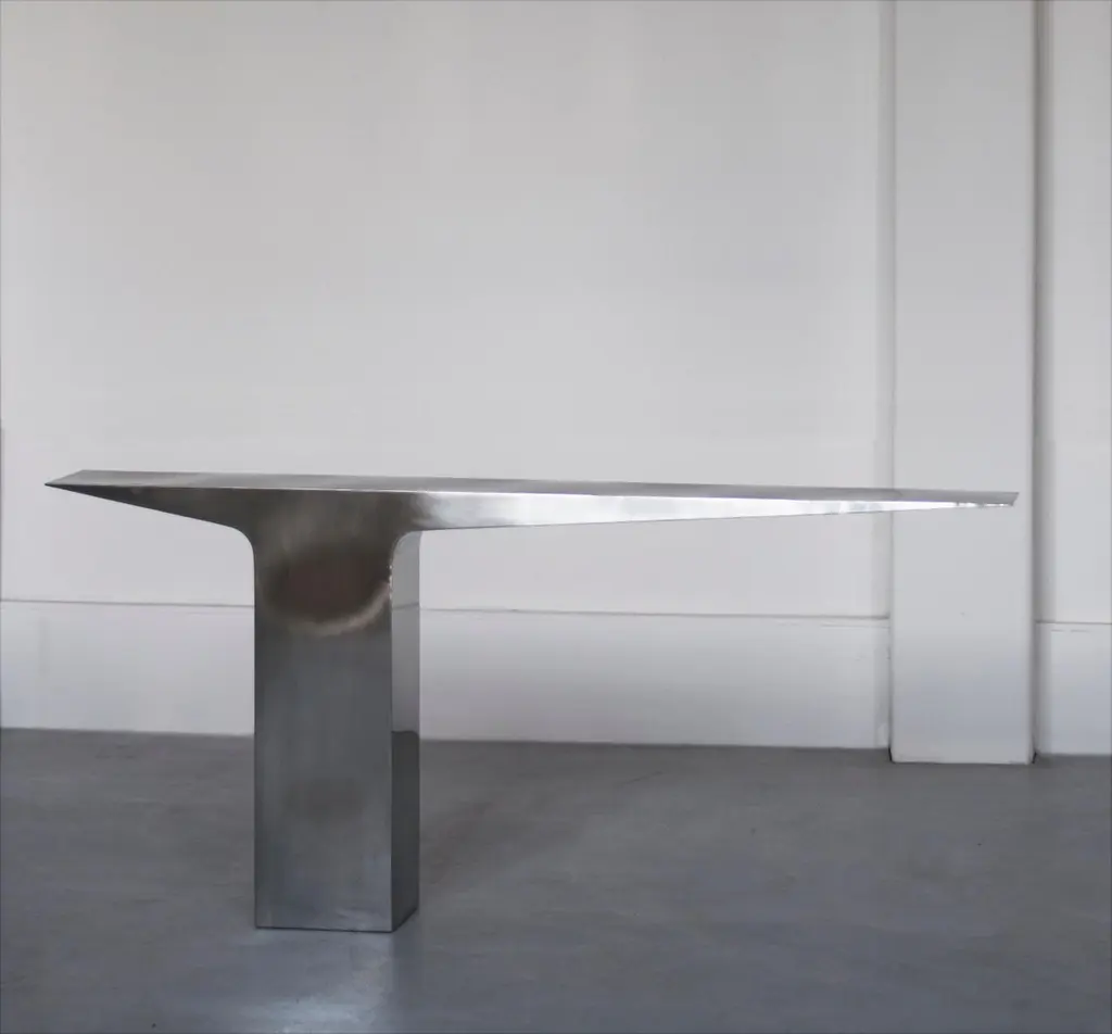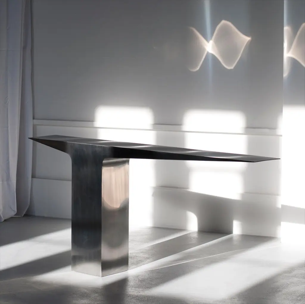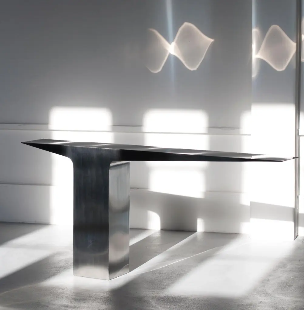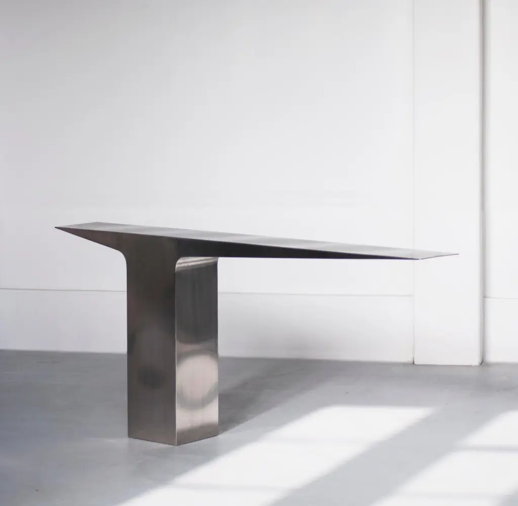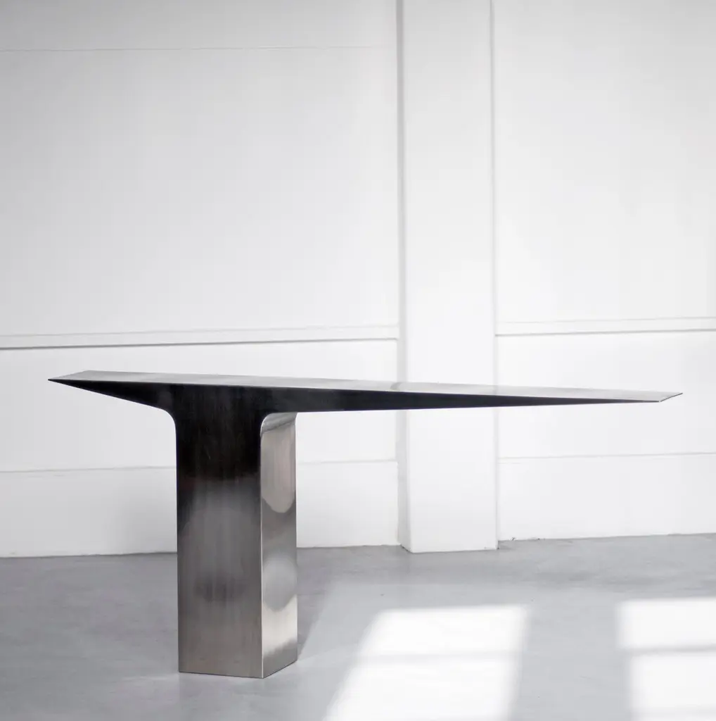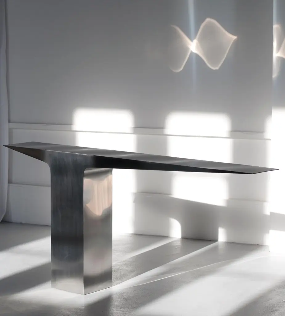 Satinated Blade Console by Pol Quadens Limited Edition Of 8+4 Pieces.Dimensions: D 30 x W 210 x H 95 cm.Materials: Satinated stainless steel.Pol Quadens was born in Brussels. His father was active in the fields of composites the metal industry, and the world of materials, therefore, surrounded Pol since his early childhood. After his artistic studies, he starts restoring vintage cars. This experience has allowed him to gain strong practical skills and a deep knowledge of all materials.In 1987, he made his first creations and production of objects. His sensitivity and passion for the arts led him to create functional artworks. His CD shelf has sold more than 100,000 pieces and has become iconic in its category.
