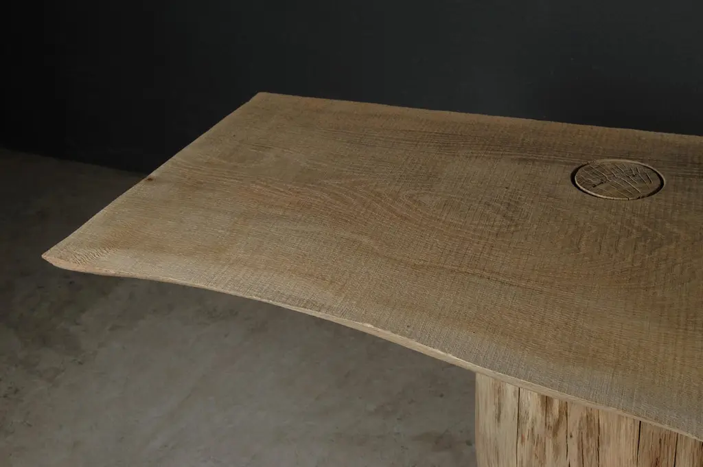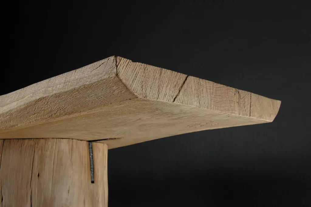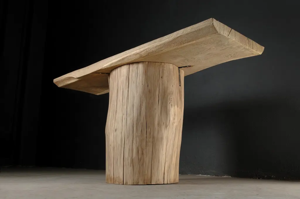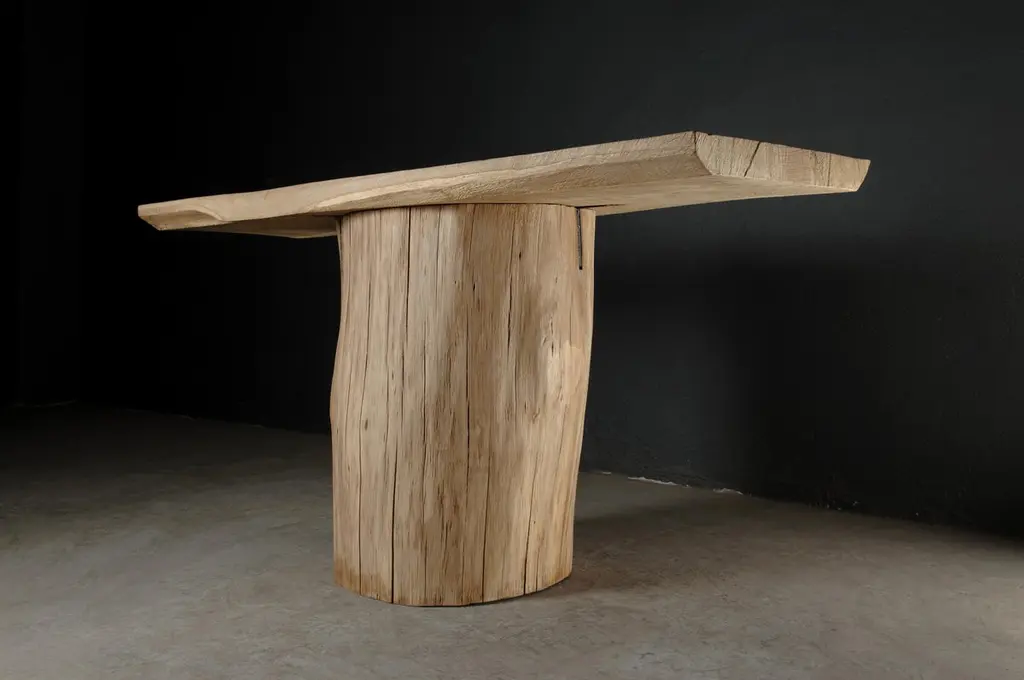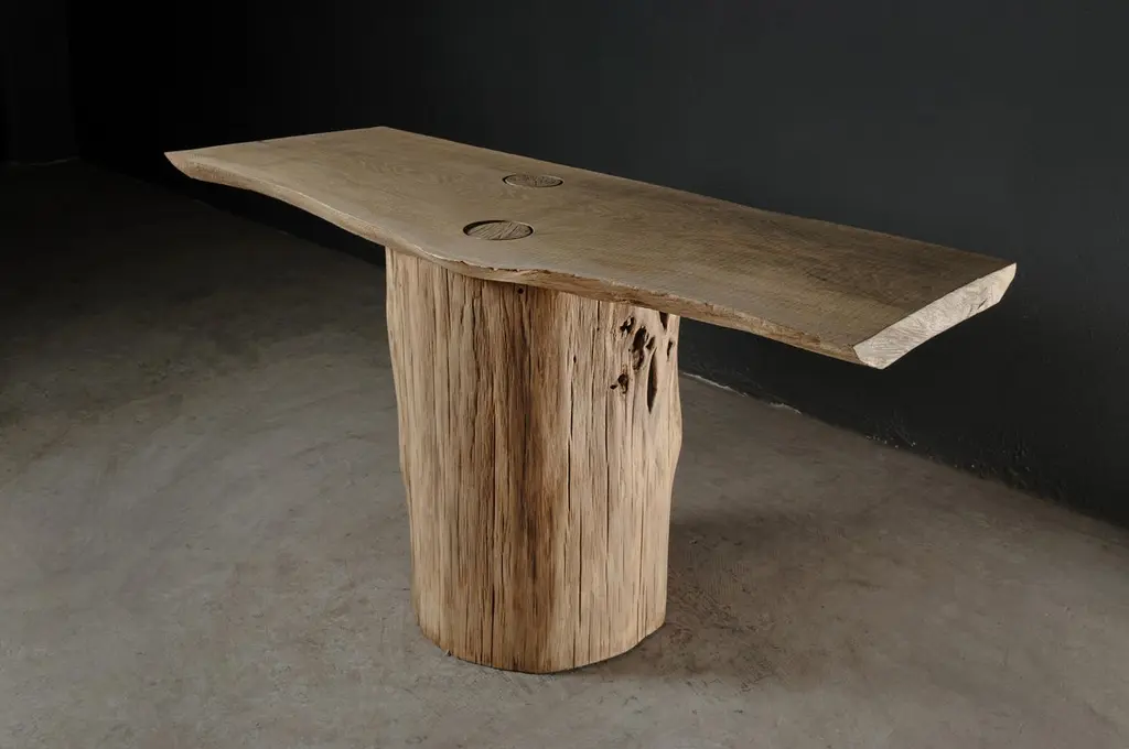 Massive console table of solid oak (+ linseed oil)Dimensions: H. 75 cm x W. 142 cm x D. 51 cmWarm furniture’s made by the designer Denis Milovanov from "Soha" studio. Simplicity of shapes. Authentic material.Wooden items are created from oak and are boiled in oil from several days to several weeks, to achieve a natural wood coloration from a dark brown to a complete black color. Patterns are applied solely by chain saw.Denis Milovanov produces wooden sculptures employing chainsaw and chisel as sole instruments of his practice. Reclaimed oak is carefully chosen, hand-processed and boiled in linseed oil in accordance with traditional Russian woodwork principles that help expelling moisture from the wood, increase its durability and provide a reserved and deep palette of color to the finish: from light hazel to pitch-black charcoal.Gray, seasoned wooden temples with intricate ancestral carvings in abandoned villages of Northern Russia constitute the main visual reference for the artist. Hand-picked material for the sculptures comes from fallen or naturally withered oak trees to retain the notion of organic life cycle. Resulting pieces resemble neo-primitivist totems covered with an expressive and hypnotic scarring from the masterful use of chainsaw.Unique piece made to order.
