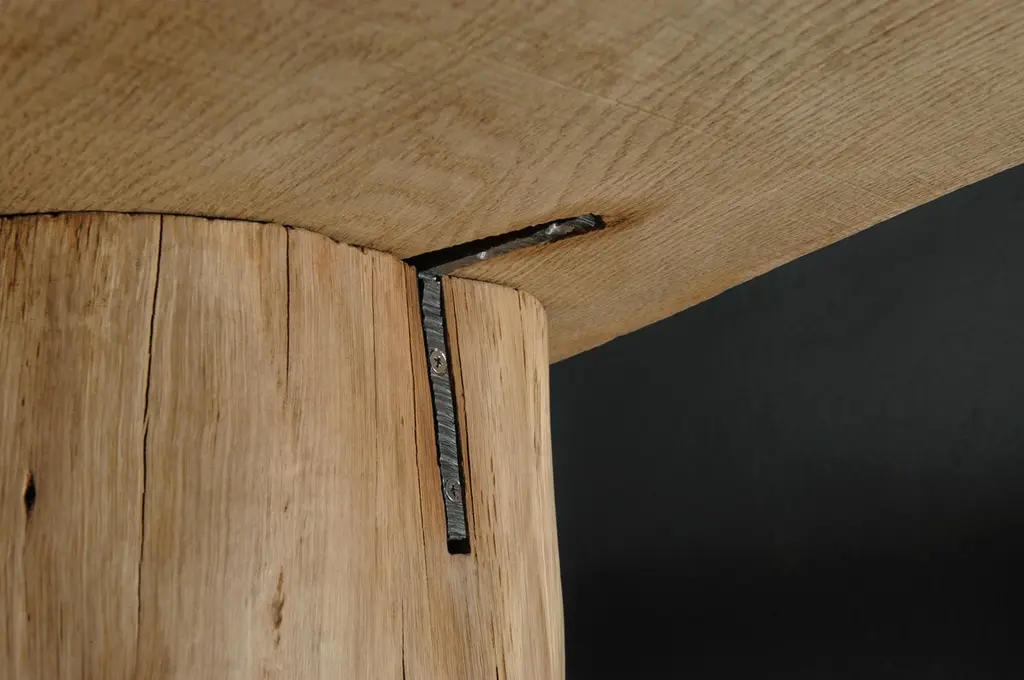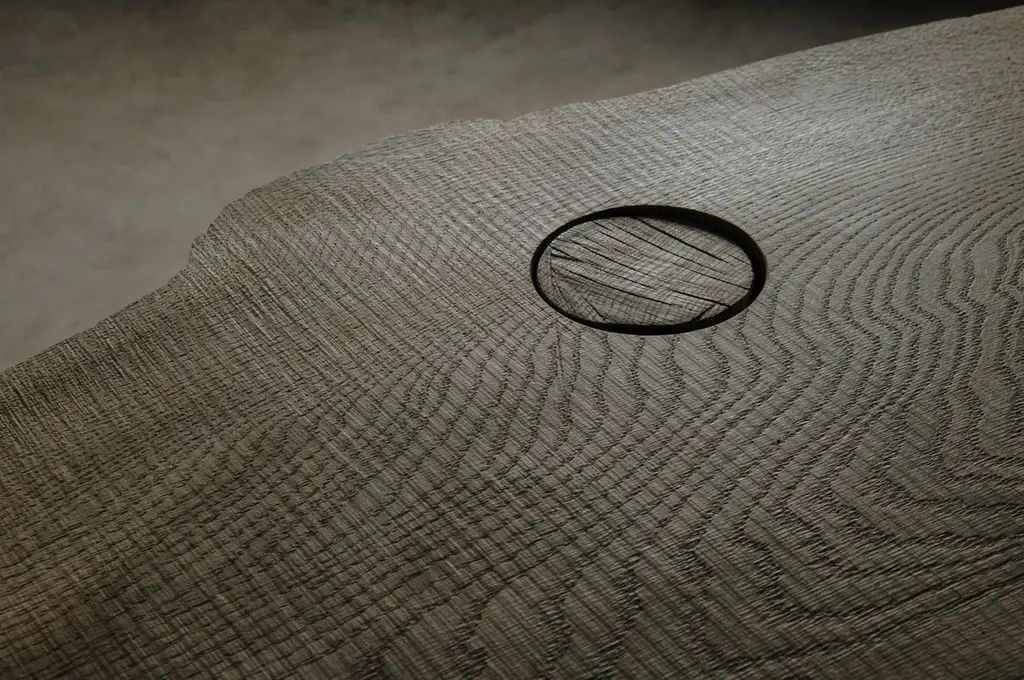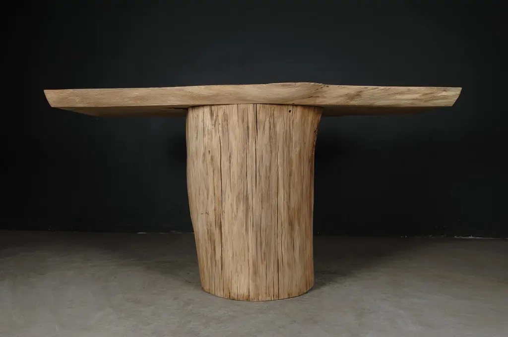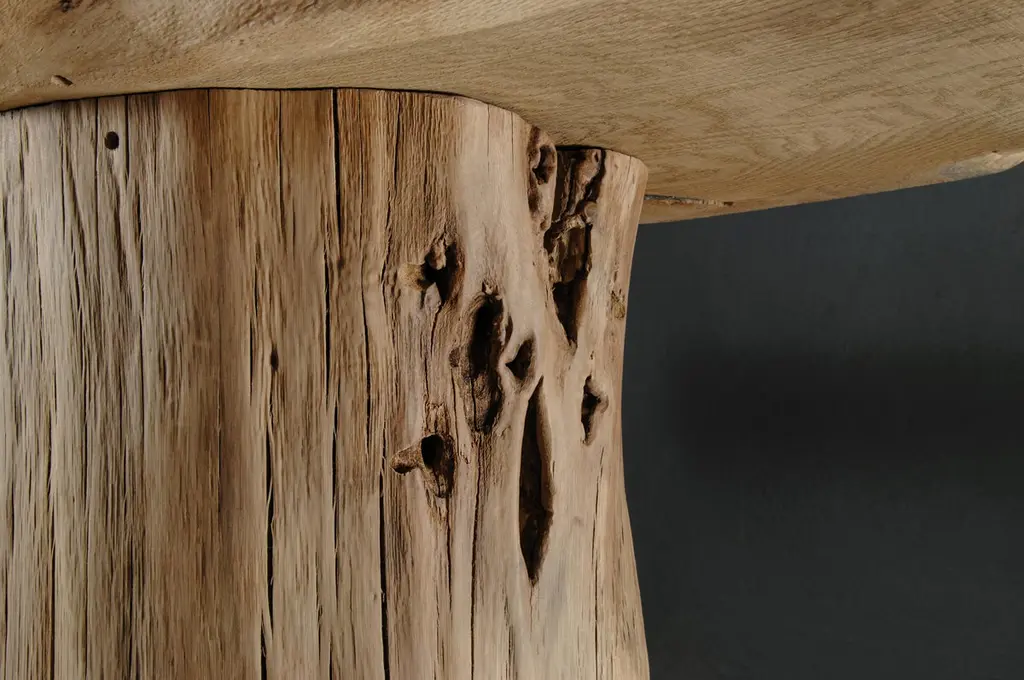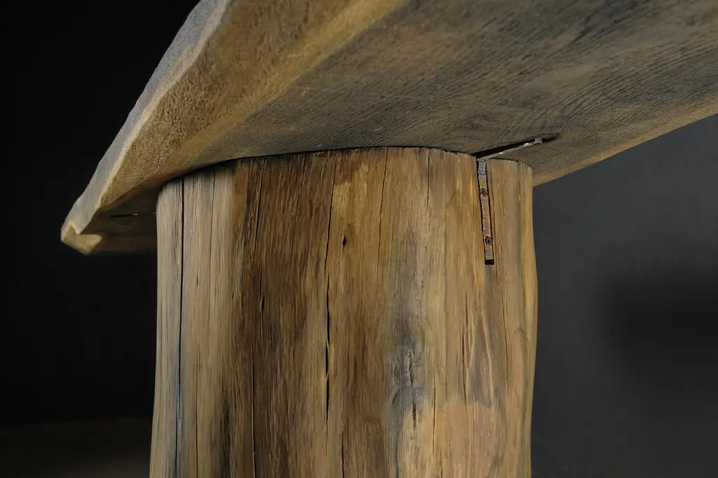 Massive console table of solid oak (+ linseed oil)Dimensions: H. 75 cm x W. 142 cm x D. 51 cmWarm furniture’s made by the designer Denis Milovanov from "Soha" studio. Simplicity of shapes. Authentic material.Wooden items are created from oak and are boiled in oil from several days to several weeks, to achieve a natural wood coloration from a dark brown to a complete black color. Patterns are applied solely by chain saw.Denis Milovanov produces wooden sculptures employing chainsaw and chisel as sole instruments of his practice. Reclaimed oak is carefully chosen, hand-processed and boiled in linseed oil in accordance with traditional Russian woodwork principles that help expelling moisture from the wood, increase its durability and provide a reserved and deep palette of color to the finish: from light hazel to pitch-black charcoal.Gray, seasoned wooden temples with intricate ancestral carvings in abandoned villages of Northern Russia constitute the main visual reference for the artist. Hand-picked material for the sculptures comes from fallen or naturally withered oak trees to retain the notion of organic life cycle. Resulting pieces resemble neo-primitivist totems covered with an expressive and hypnotic scarring from the masterful use of chainsaw.Unique piece made to order.