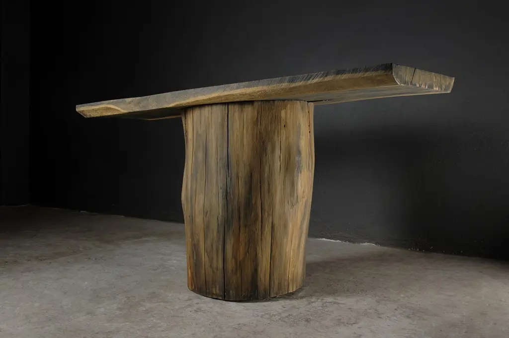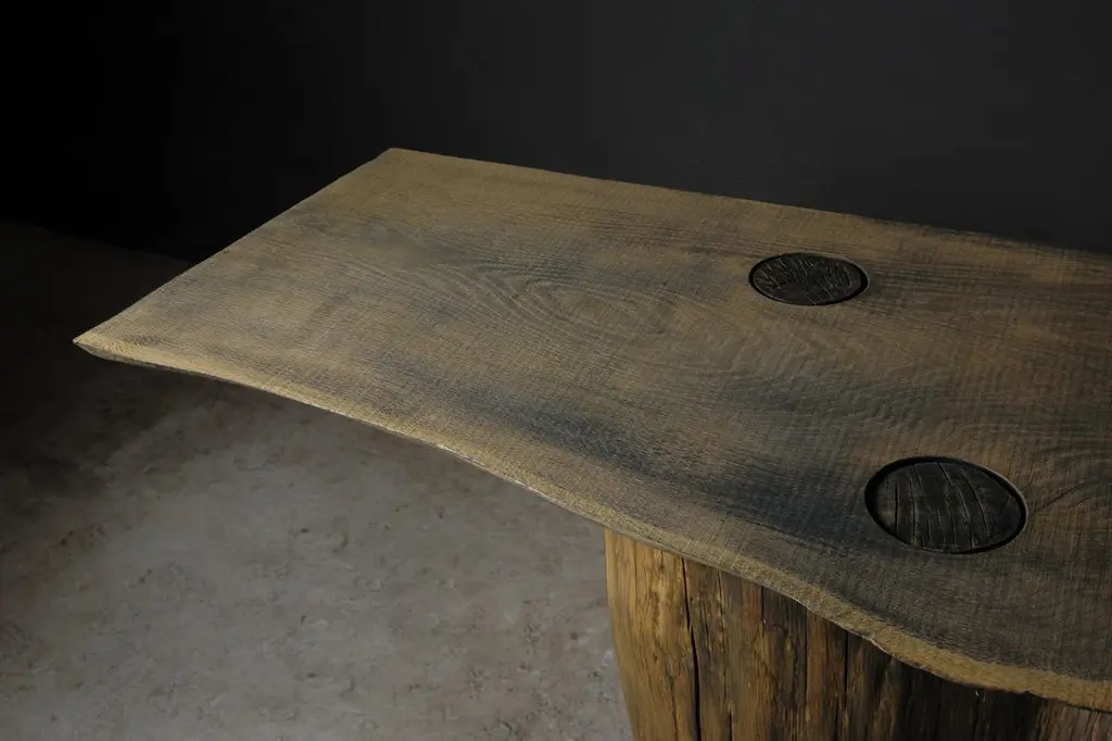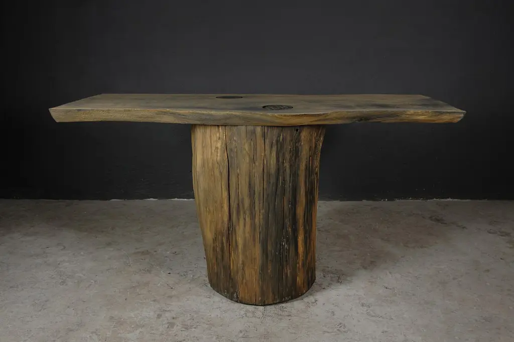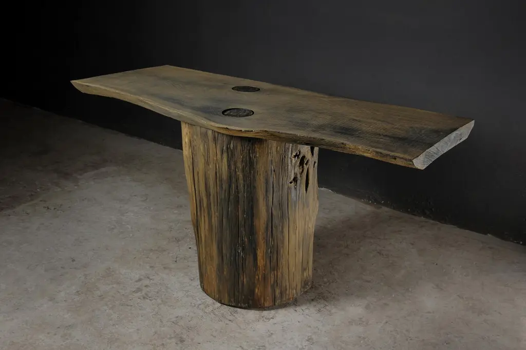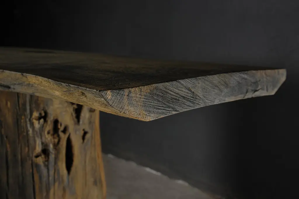 Massive console table of solid oak (+ linseed oil)Dimensions: H. 75 cm x W. 142 cm x D. 51 cmWarm furniture’s made by the designer Denis Milovanov from "Soha" studio. Simplicity of shapes. Authentic material.Wooden items are created from oak and are boiled in oil from several days to several weeks, to achieve a natural wood coloration from a dark brown to a complete black color. Patterns are applied solely by chain saw.Denis Milovanov produces wooden sculptures employing chainsaw and chisel as sole instruments of his practice. Reclaimed oak is carefully chosen, hand-processed and boiled in linseed oil in accordance with traditional Russian woodwork principles that help expelling moisture from the wood, increase its durability and provide a reserved and deep palette of color to the finish: from light hazel to pitch-black charcoal.Gray, seasoned wooden temples with intricate ancestral carvings in abandoned villages of Northern Russia constitute the main visual reference for the artist. Hand-picked material for the sculptures comes from fallen or naturally withered oak trees to retain the notion of organic life cycle. Resulting pieces resemble neo-primitivist totems covered with an expressive and hypnotic scarring from the masterful use of chainsaw.Unique piece made to order.