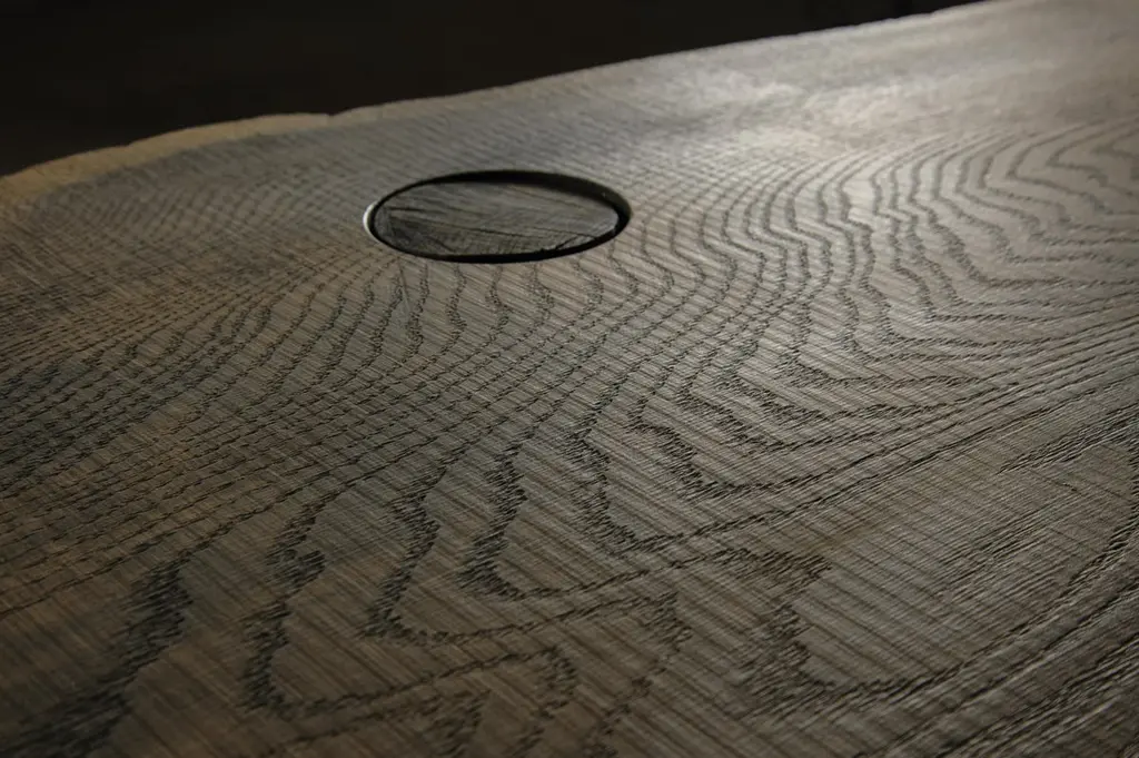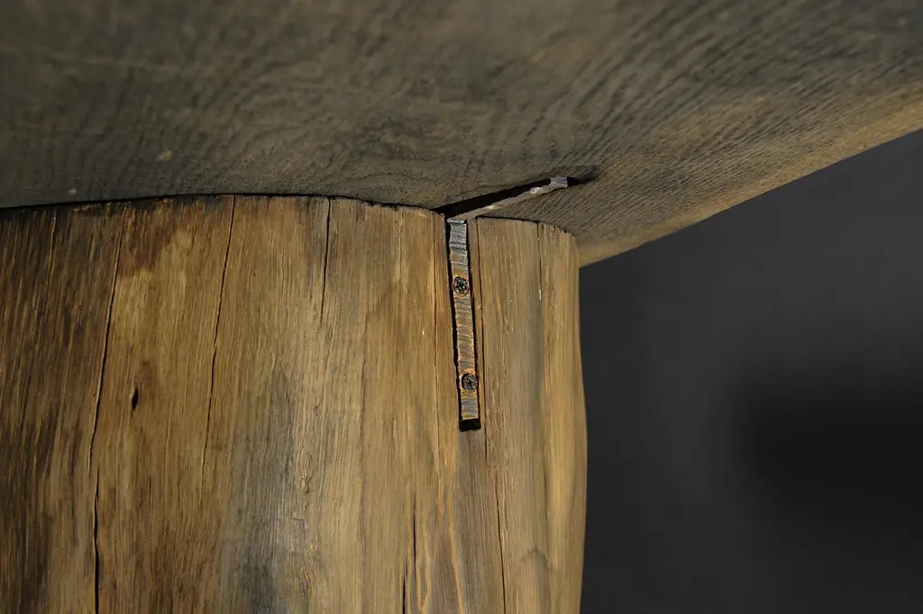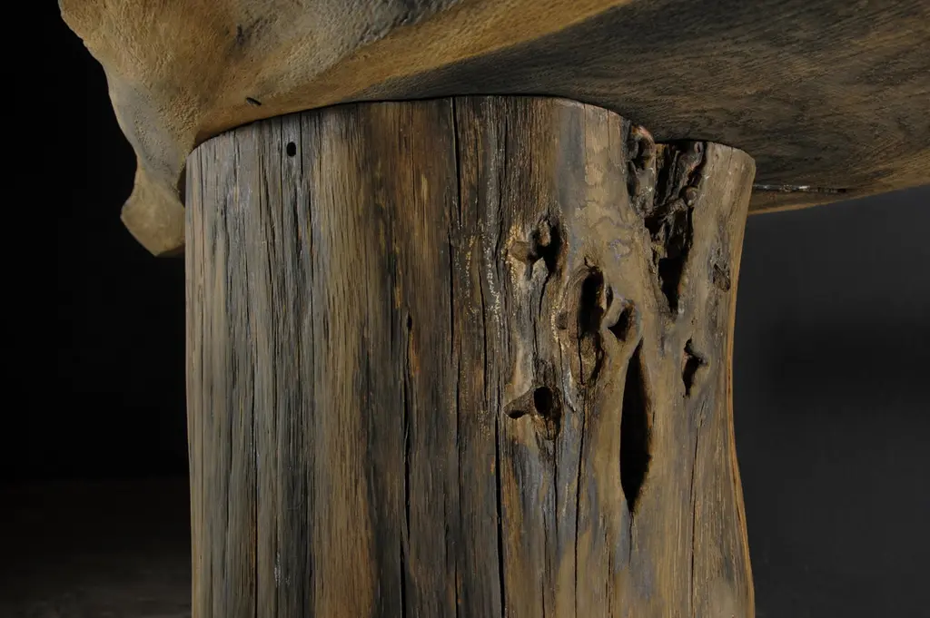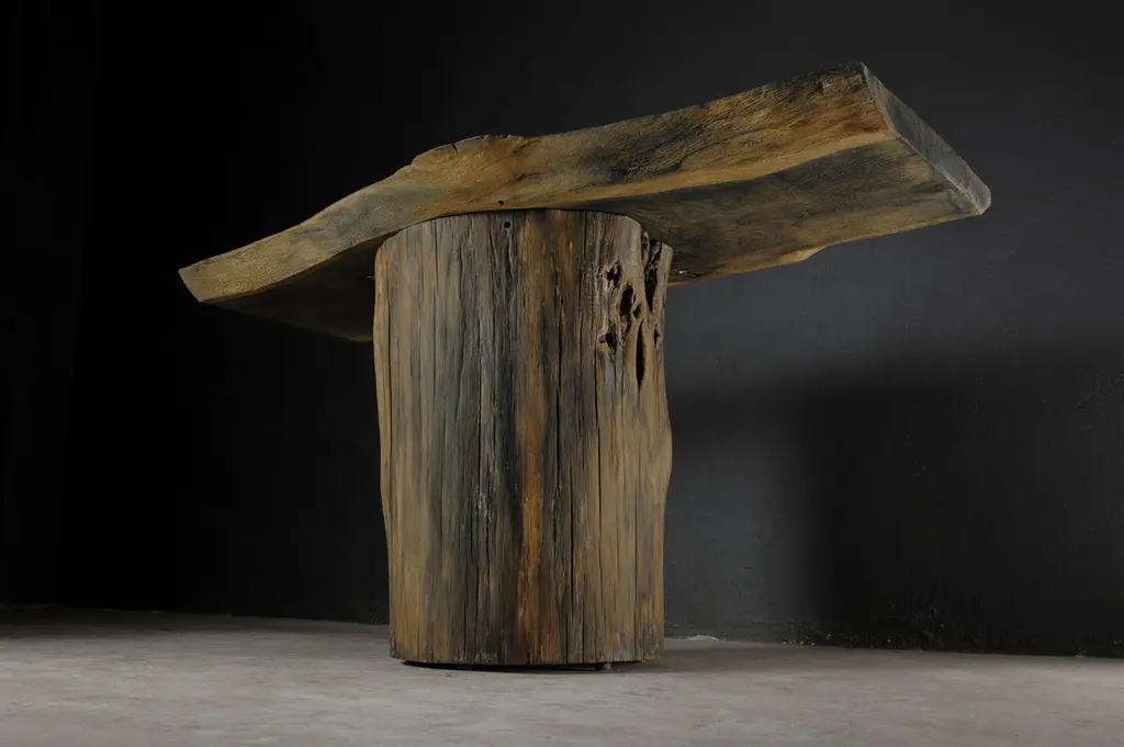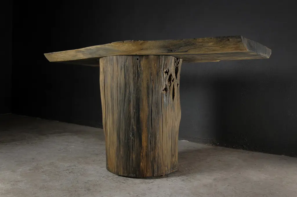 Massive console table of solid oak (+ linseed oil)Dimensions: H. 75 cm x W. 142 cm x D. 51 cmWarm furniture’s made by the designer Denis Milovanov from "Soha" studio. Simplicity of shapes. Authentic material.Wooden items are created from oak and are boiled in oil from several days to several weeks, to achieve a natural wood coloration from a dark brown to a complete black color. Patterns are applied solely by chain saw.Denis Milovanov produces wooden sculptures employing chainsaw and chisel as sole instruments of his practice. Reclaimed oak is carefully chosen, hand-processed and boiled in linseed oil in accordance with traditional Russian woodwork principles that help expelling moisture from the wood, increase its durability and provide a reserved and deep palette of color to the finish: from light hazel to pitch-black charcoal.Gray, seasoned wooden temples with intricate ancestral carvings in abandoned villages of Northern Russia constitute the main visual reference for the artist. Hand-picked material for the sculptures comes from fallen or naturally withered oak trees to retain the notion of organic life cycle. Resulting pieces resemble neo-primitivist totems covered with an expressive and hypnotic scarring from the masterful use of chainsaw.Unique piece made to order.