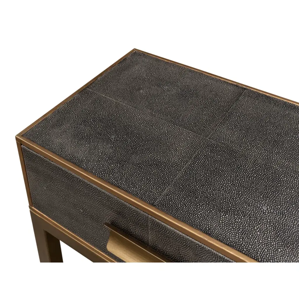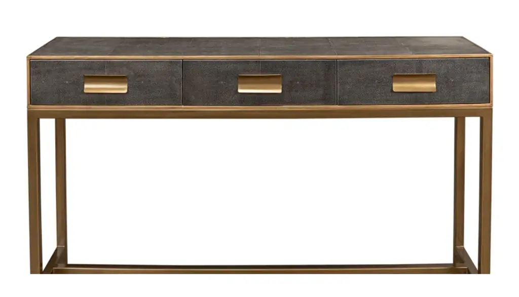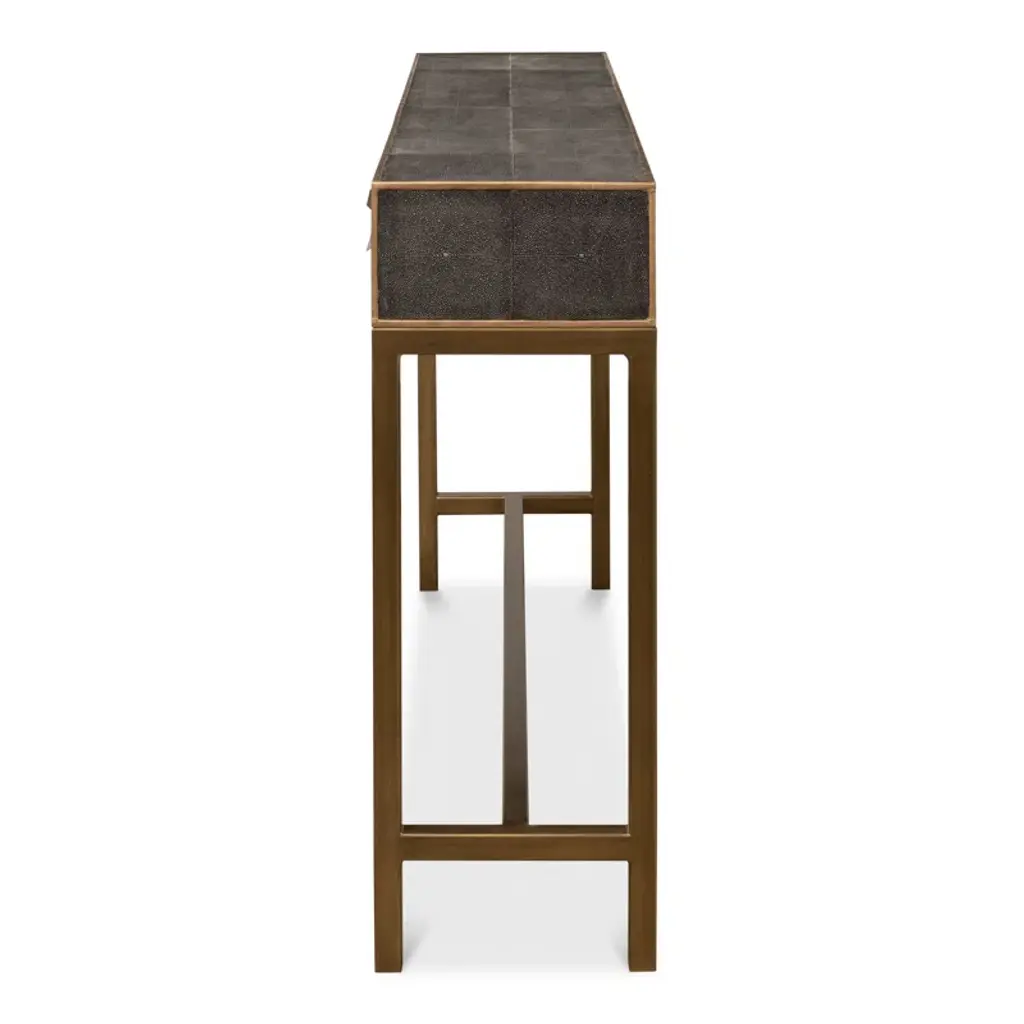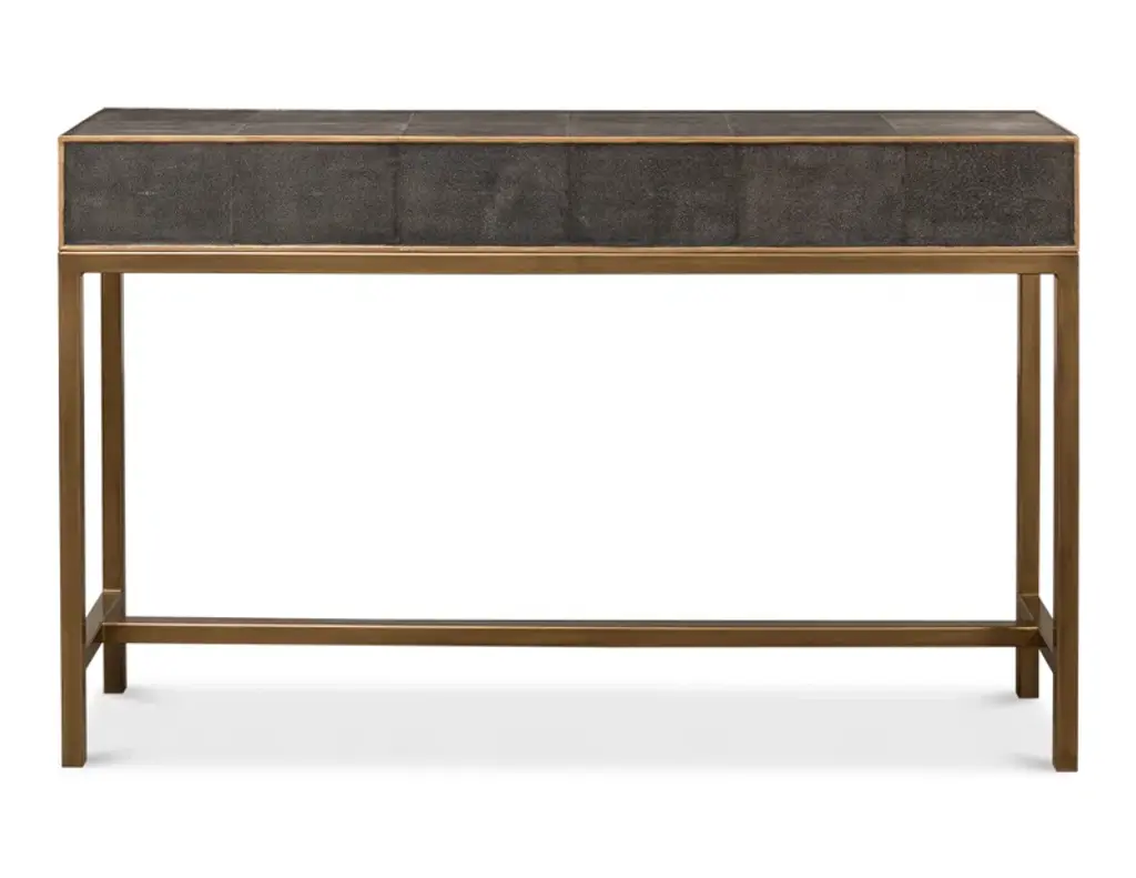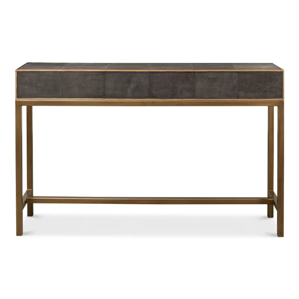 This console table blends modern design with classic elegance, featuring a textured shagreen finish that adds a touch of sophistication. Perfect for hallways or living areas, it provides a stylish surface for decorative accents or functional storage. Its refined design complements a variety of interior styles, combining aesthetic appeal with practical utility. Add versatility and charm to your living space with this standout piece.