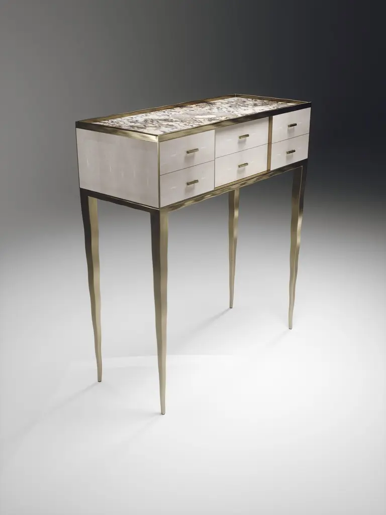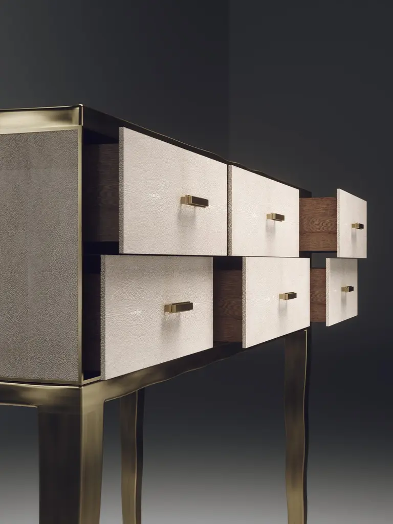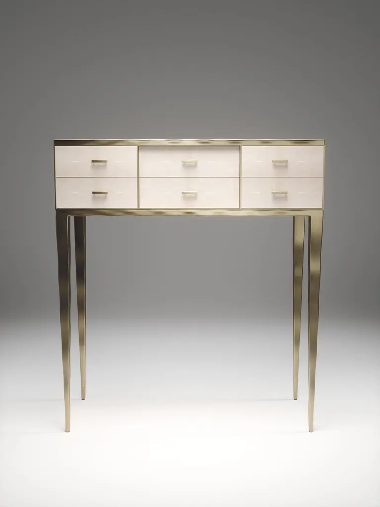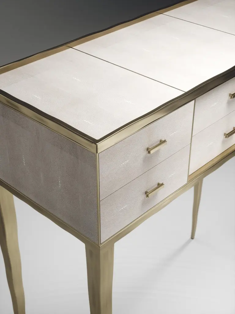 The Paris based label has distinguished themselves since their launch, with their iconic use of shagreen mixed with brass and other exotic materials. All furniture is handcrafted by skilled artisans, ultimately making each piece unique, designed in Paris and produced in the Philippines.The Melting Cosima console table by R&Y Augousti is a stunning multi-faceted piece. The beautiful signature "melting" inlay work in bronze-patina brass demonstrates the incredible artisan work of Augousti. This piece includes 6 drawers total, and the tabletop is slightly dipped making this a great console for your entrance or vanity. This piece is inlaid in cream shagreen, available in other finishes. Custom sizing/finishing available on request.The dimensions of this piece are33 x 14 x 36.5"All R&Y Augousti pieces are handmade by artisans, ultimately making each piece unique. Custom color or sizing available on request. Wipe clean with soft dry cloth.Acclaimed design duo Ria & Yiouri Augousti have established themselves since the 1990s as pioneers of modern-vintage style through their luxurious Art Deco inspired collections.The Paris based label has distinguished themselves since their launch, with their iconic use of shagreen mixed with brass and other exotic materials. All furniture is handcrafted by skilled artisans, ultimately making each piece unique. All shagreen-covered items should be kept out of direct sunlight, color variants may occur on the stingray and other exotic finishes, but this showcases the Parisian label's commitment to creating authentic luxurious products using natural components.